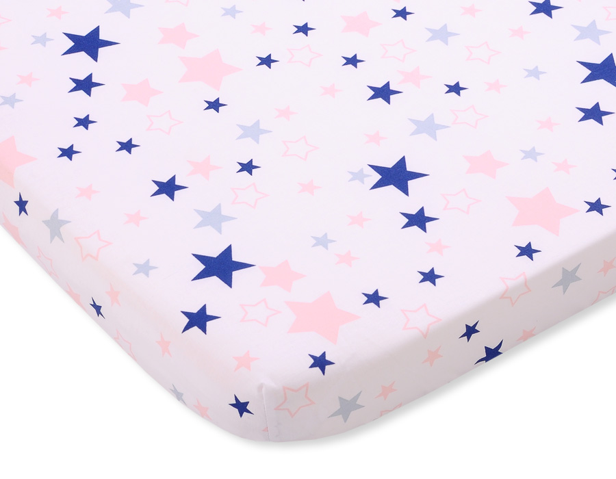 Stubenwagen » Bettwäsche für Babys » Bettwäsche für Babybett FUN & JOY » Spannbettlaken aus Baumwolle 120x60cm » Spannbettlaken aus Baumwolle 120x60cm rosa-blaue Sternen