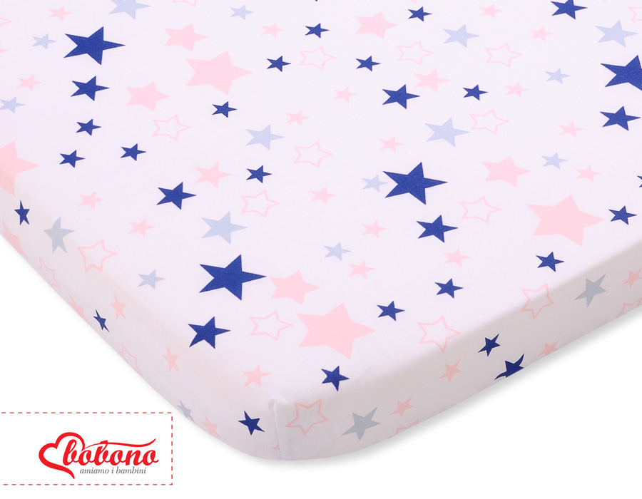 Stubenwagen » Bettwäsche für Babys » Bettwäsche für Babybett FUN & JOY » Spannbettlaken aus Baumwolle 140x70cm » Spannbettlaken aus Baumwolle 140x70cm pink-navy blue stars
