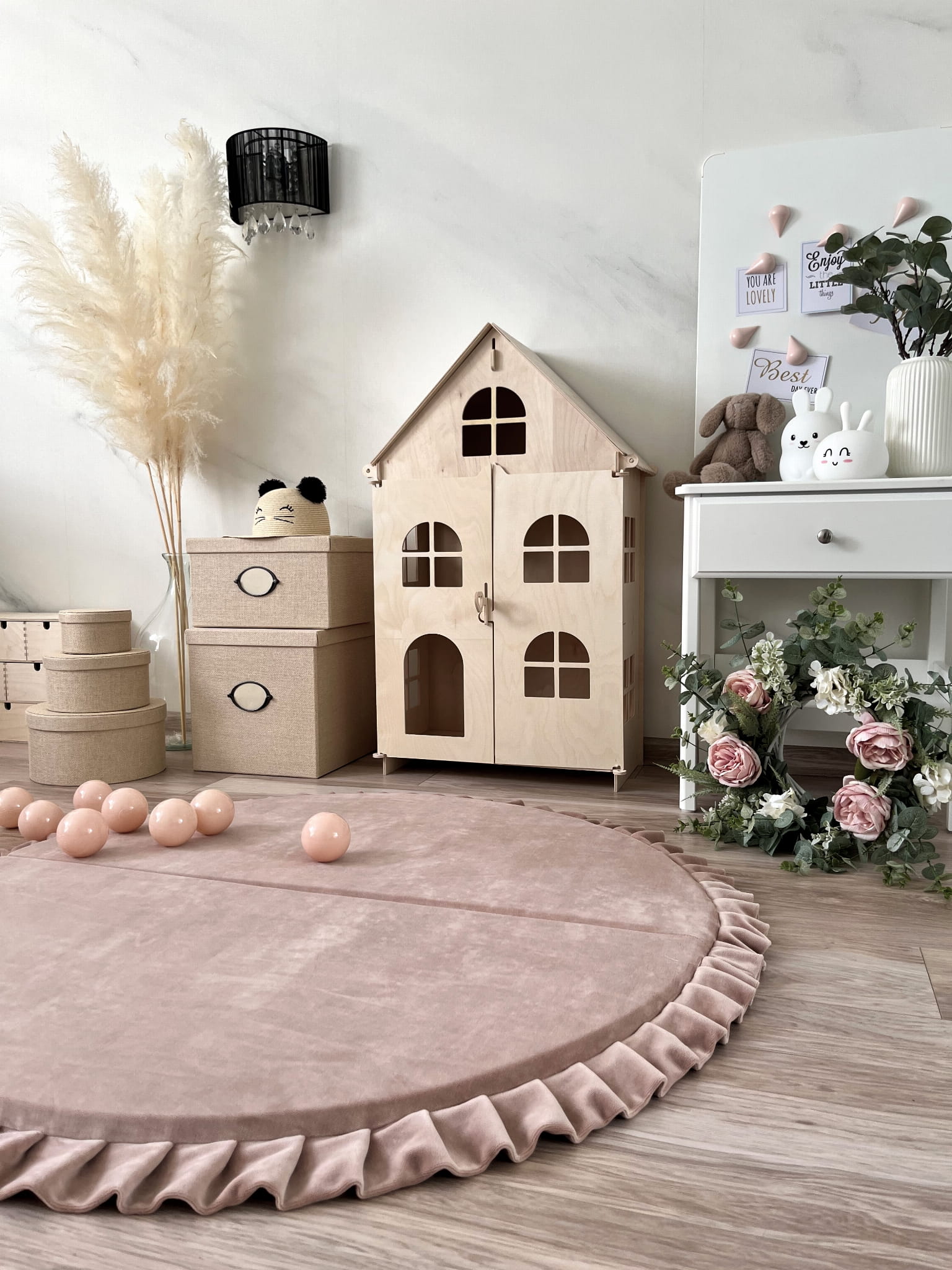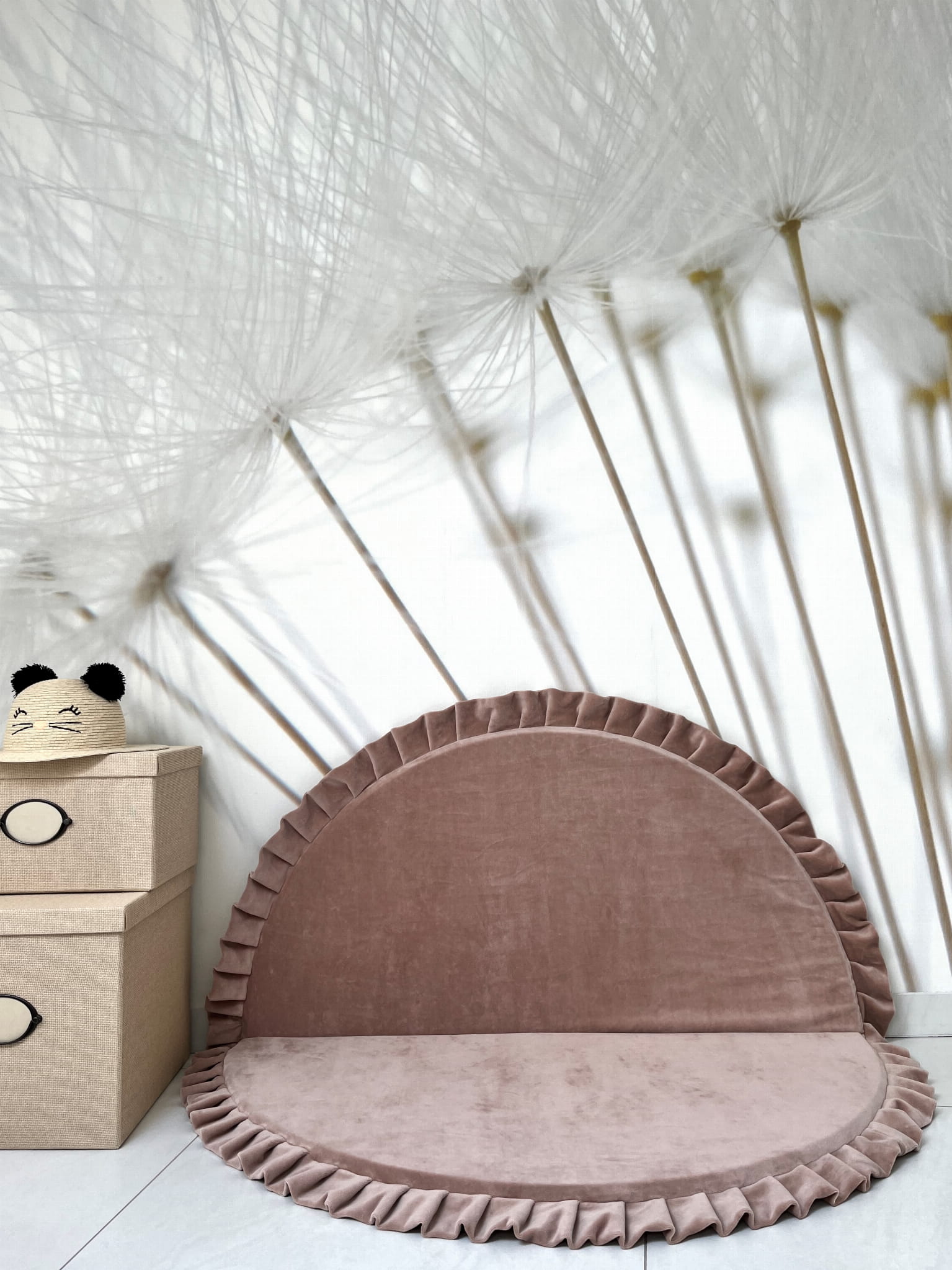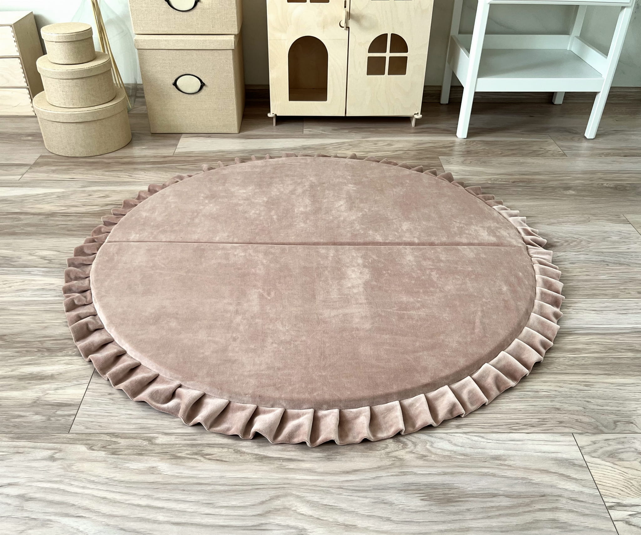 Suchen Sie nach der perfekten Spielmatte zum Toben, Spielen, Krabbeln und Entspannen? Voilà! Diese vielseitige, weiche Schaumstoffmatte wird all Ihren Bedürfnissen gerecht. Mit Leichtigkeit können Sie sie an die Wand klappen und in ein bequemes Sofakissen verwandeln, ideal für die kuschelige Ecke. Die schicken Rüschen und der elegante Samtbezug sind absolut im Trend und machen sie zu einem wahren Schmuckstück im Kinderzimmer.
