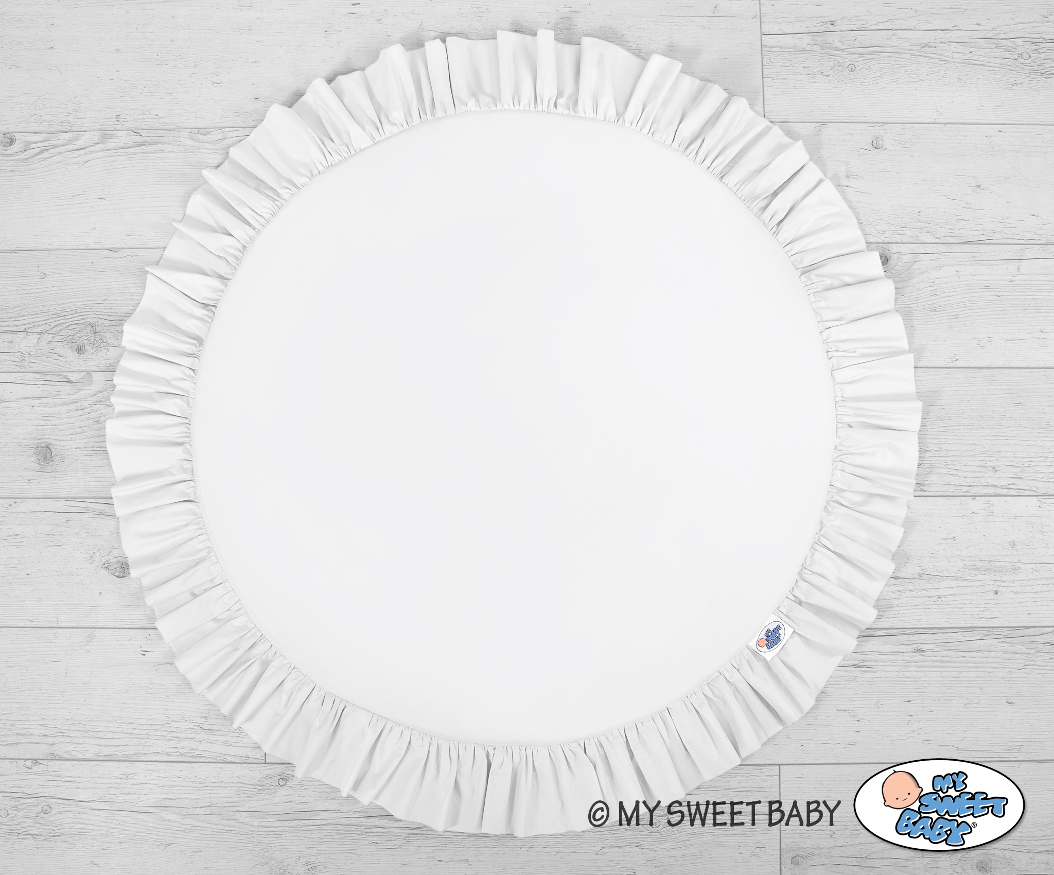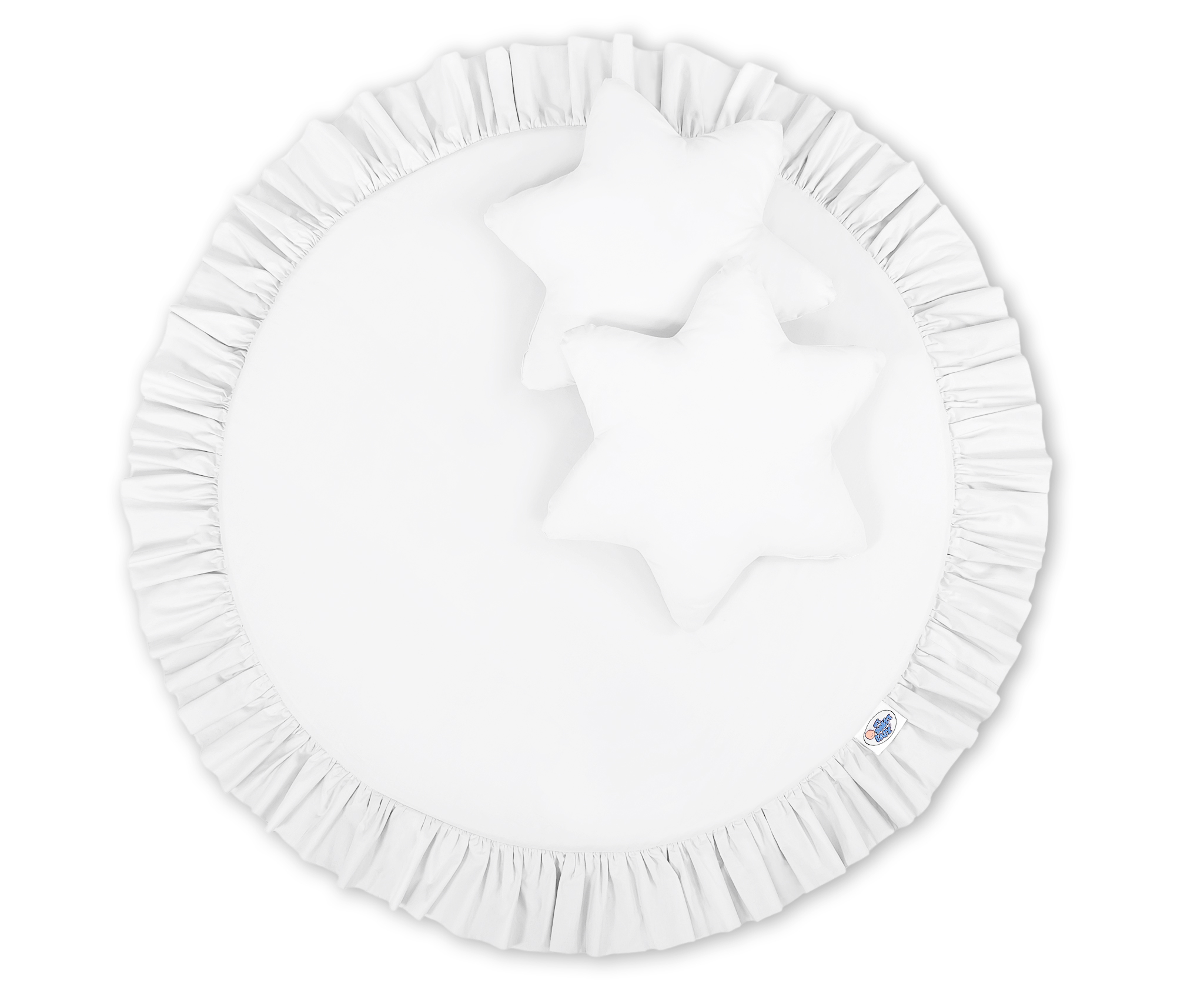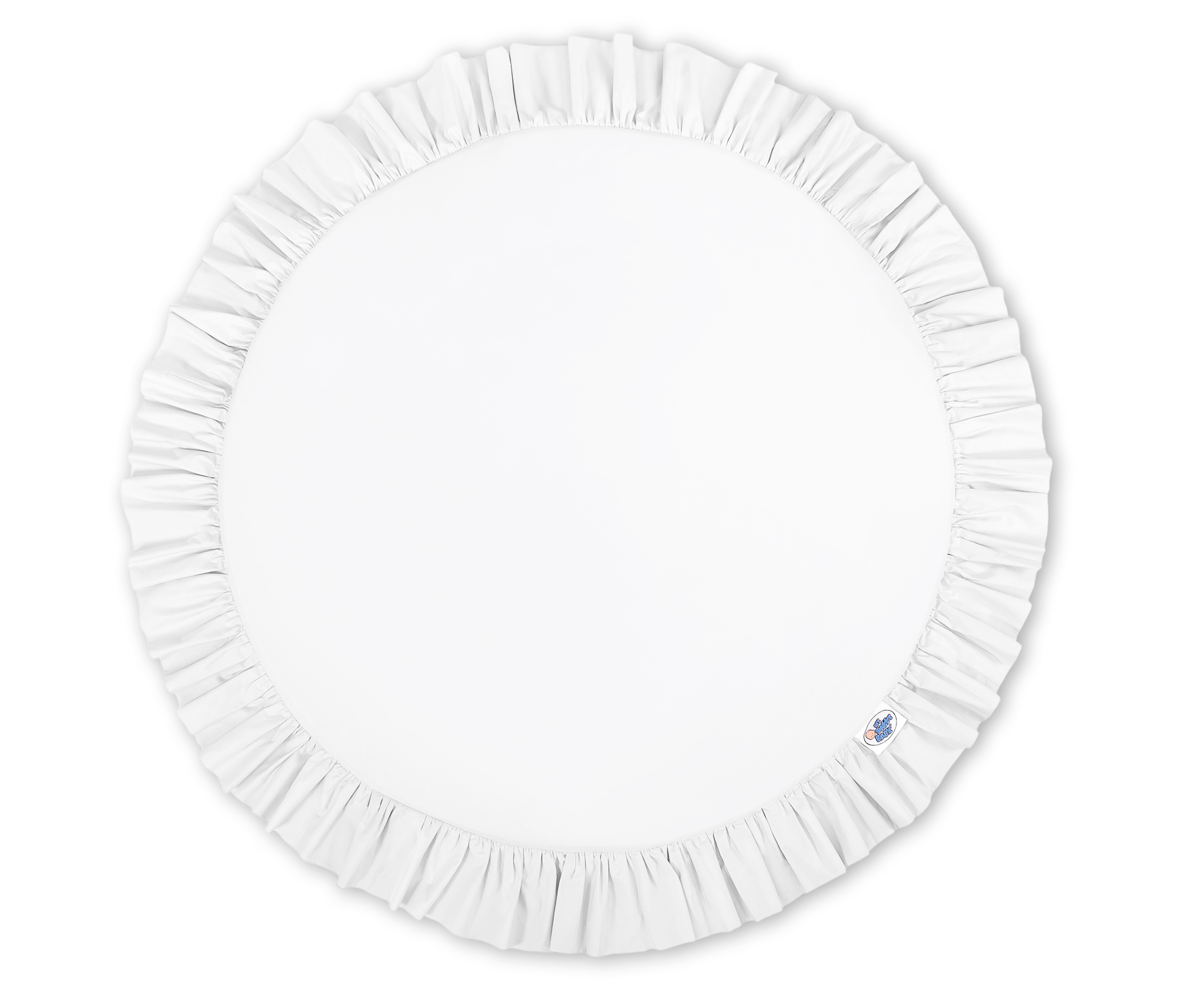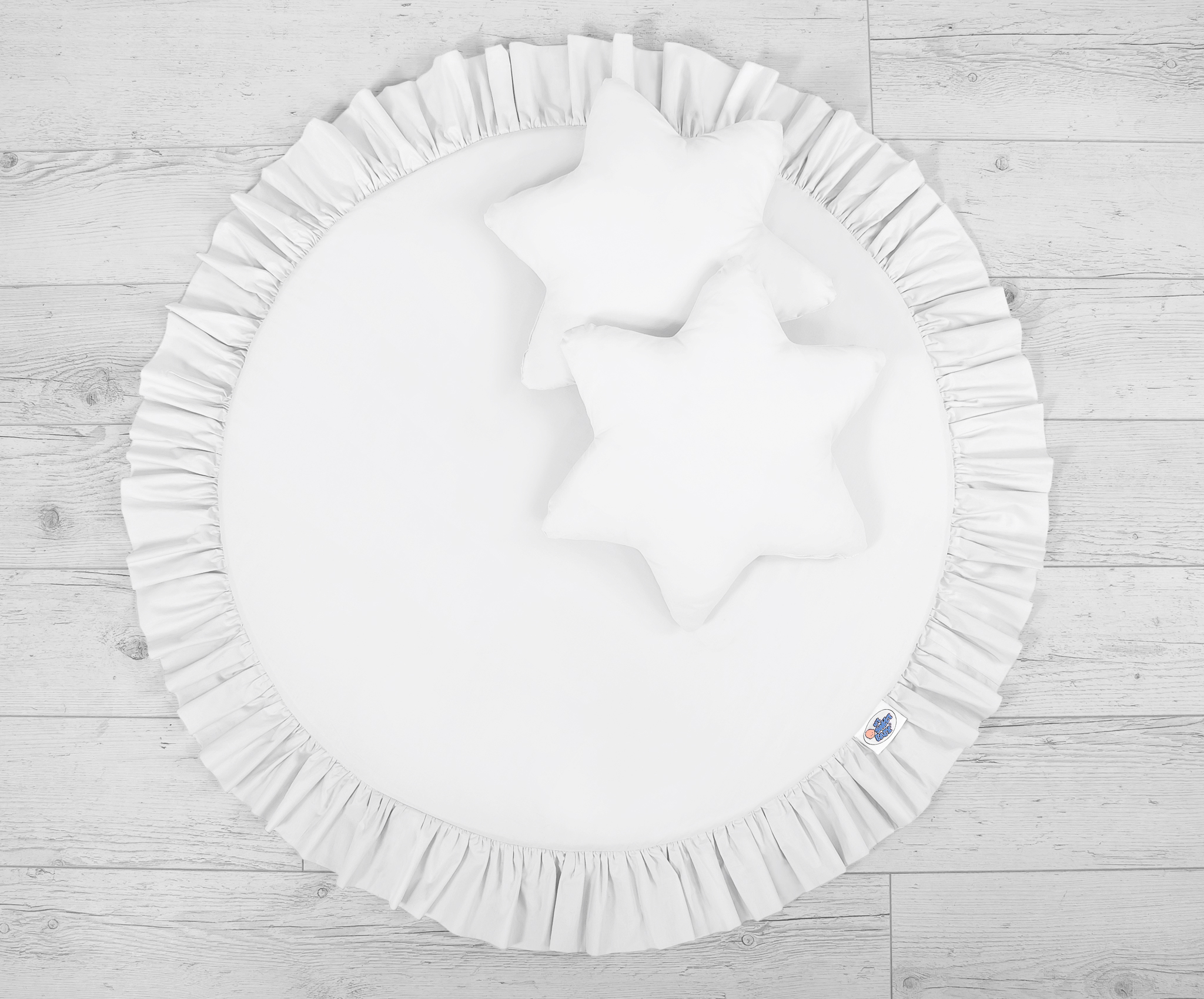 Eine Spielmatte mit Rüsche. Sie kann als Teppich/Bettvorlage, Spielmatte oder auch als Boden für den langen Himmel verwendet werden. Von den ersten Lebenstagen kann das Baby auf Matte auf dem Bauch liegen und die Welt entdecken. Der Boden der Matte ist mit einem weichen Inlett aus antiallergischem Gewebe ausgestattet. Die Bodeneinlage schützt vor Kälte und ist angenehm weich. Die Einlage kann aus der Spielmatte herausgenommen werden und der Bezug gewaschen werden. Der Bezug ist aus reiner Baumwolle mit Ökotex Zertifikat hergestellt.