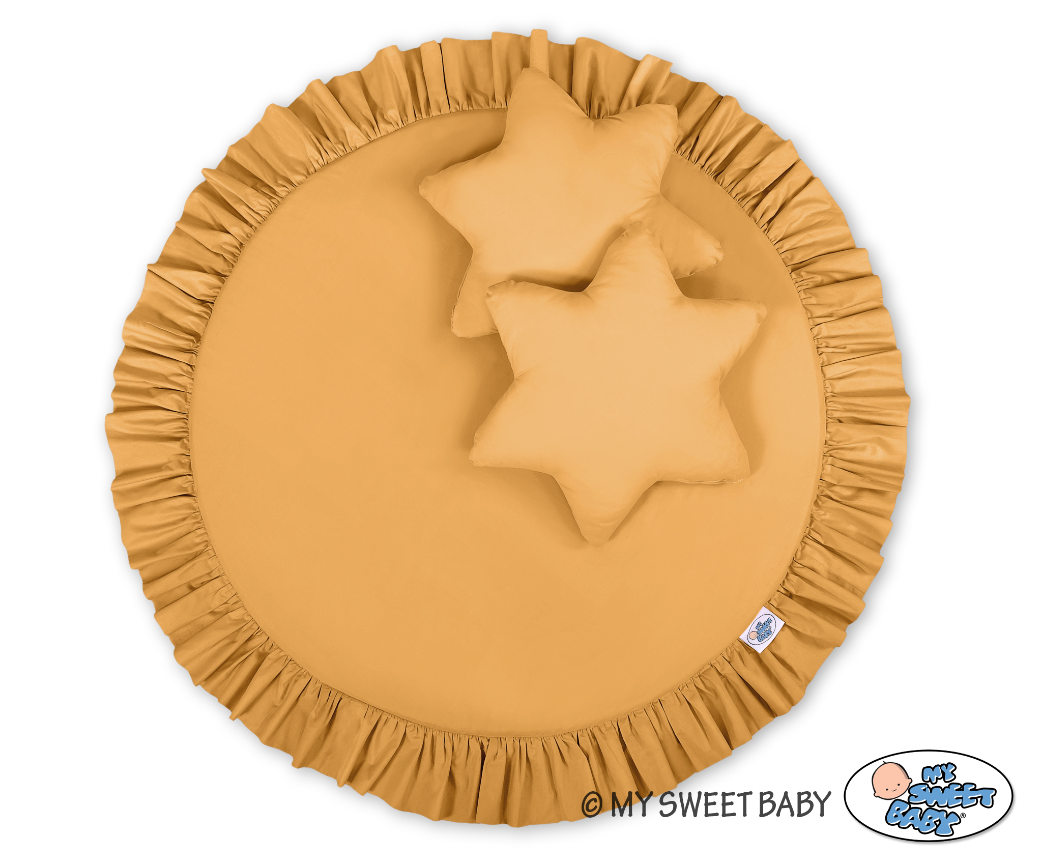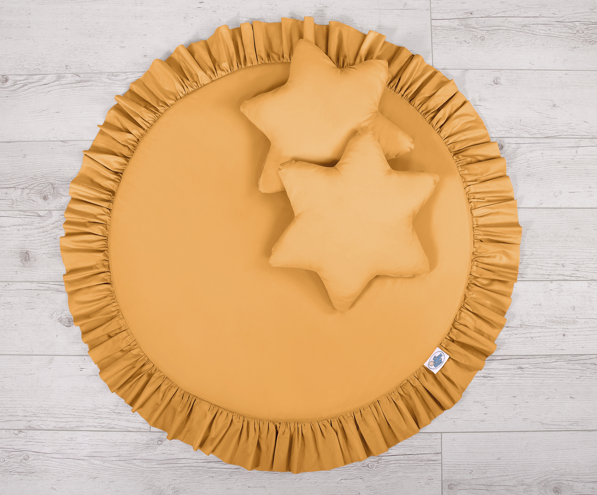 Eine Spielmatte mit Rüsche. Sie kann als Teppich/Bettvorlage, Spielmatte oder auch als Boden für den langen Himmel verwendet werden. Von den ersten Lebenstagen kann das Baby auf Matte auf dem Bauch liegen und die Welt entdecken. Der Boden der Matte ist mit einem weichen Inlett aus antiallergischem Gewebe ausgestattet. Die Bodeneinlage schützt vor Kälte und ist angenehm weich. Die Einlage kann aus der Spielmatte herausgenommen werden und der Bezug gewaschen werden. Der Bezug ist aus reiner Baumwolle mit Ökotex Zertifikat hergestellt.