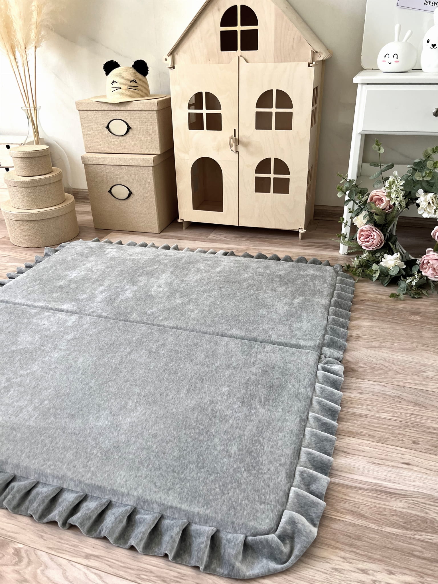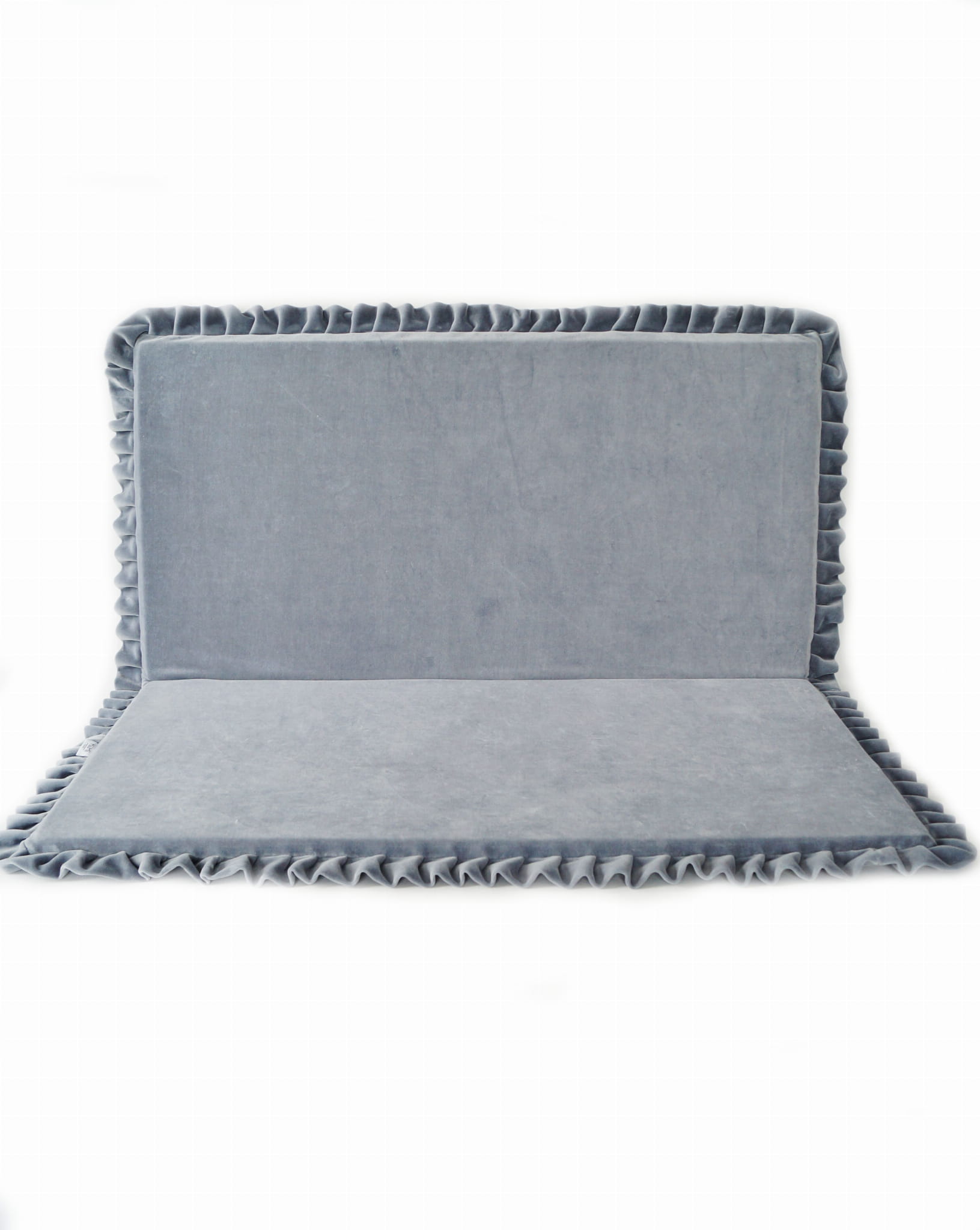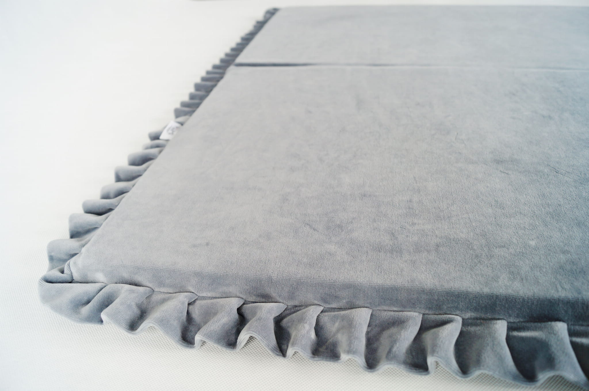 Die faltbare quadratische Spielmatte aus Velvet mit Rüschen ist nicht nur ein Ort zum Spielen, sondern kann auch als gemütliche Leseecke oder Entspannungsbereich genutzt werden. Die Kinder können sie flach auf den Boden legen oder zur Hälfte falten und an die Wand lehnen.