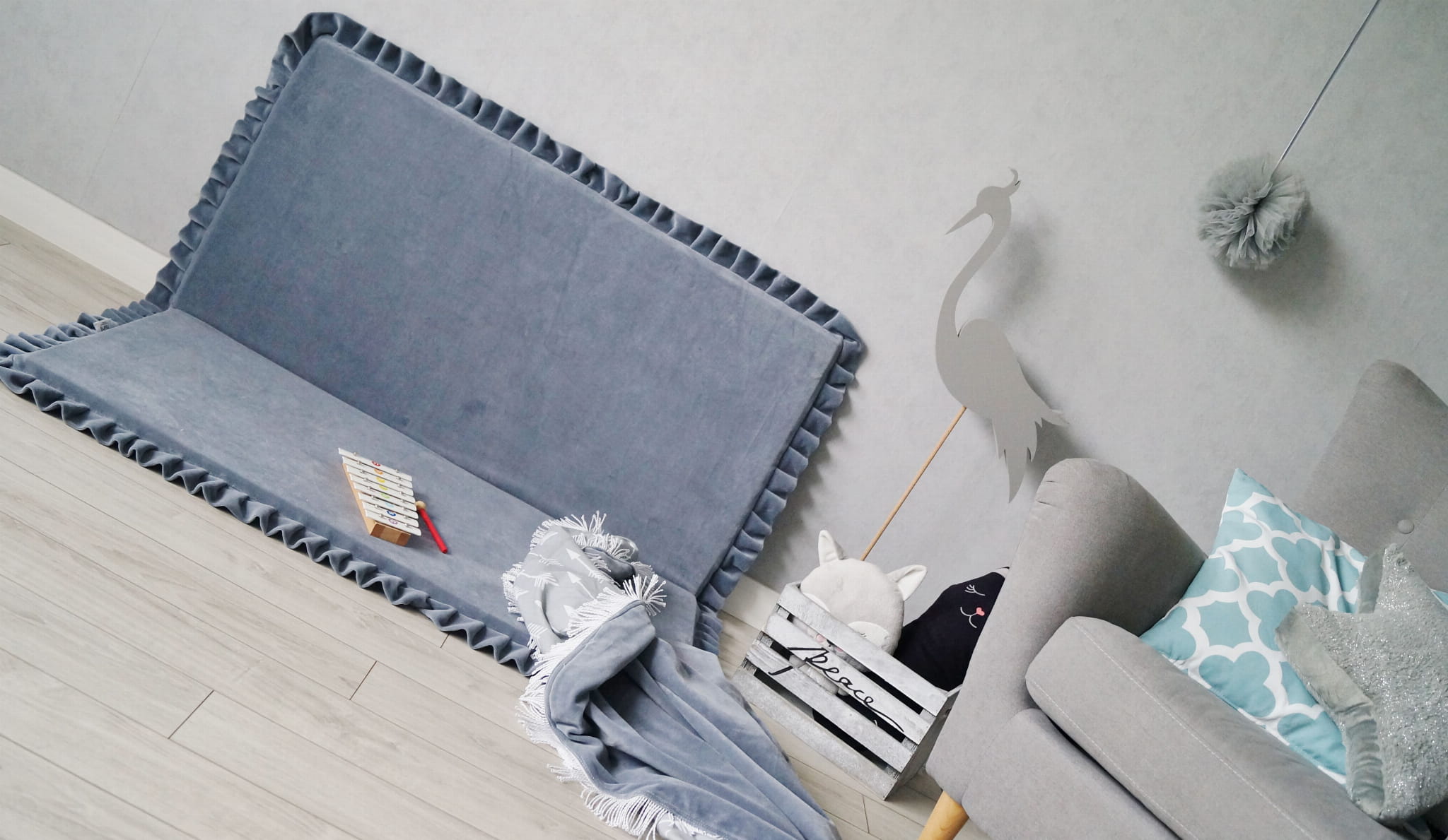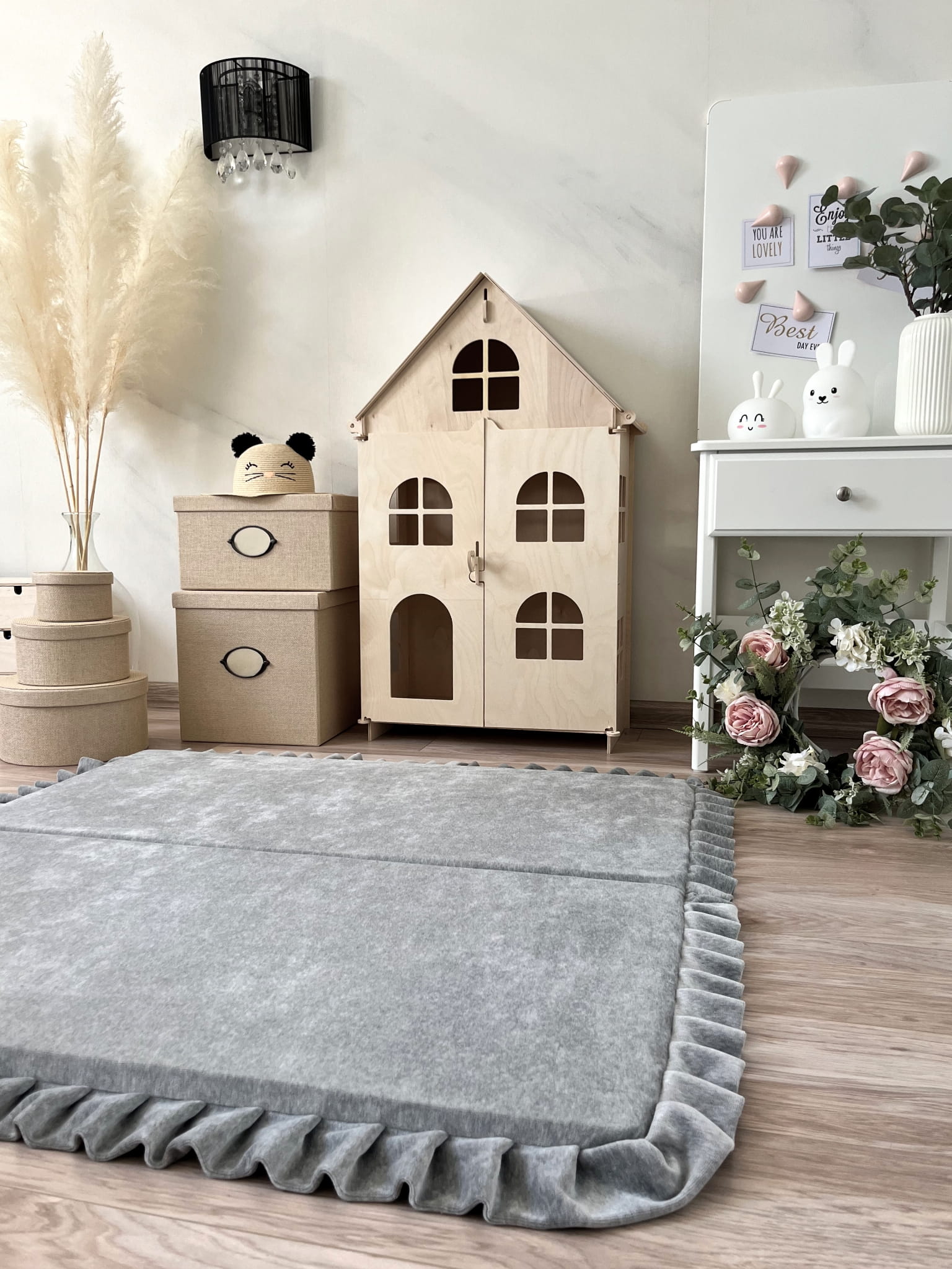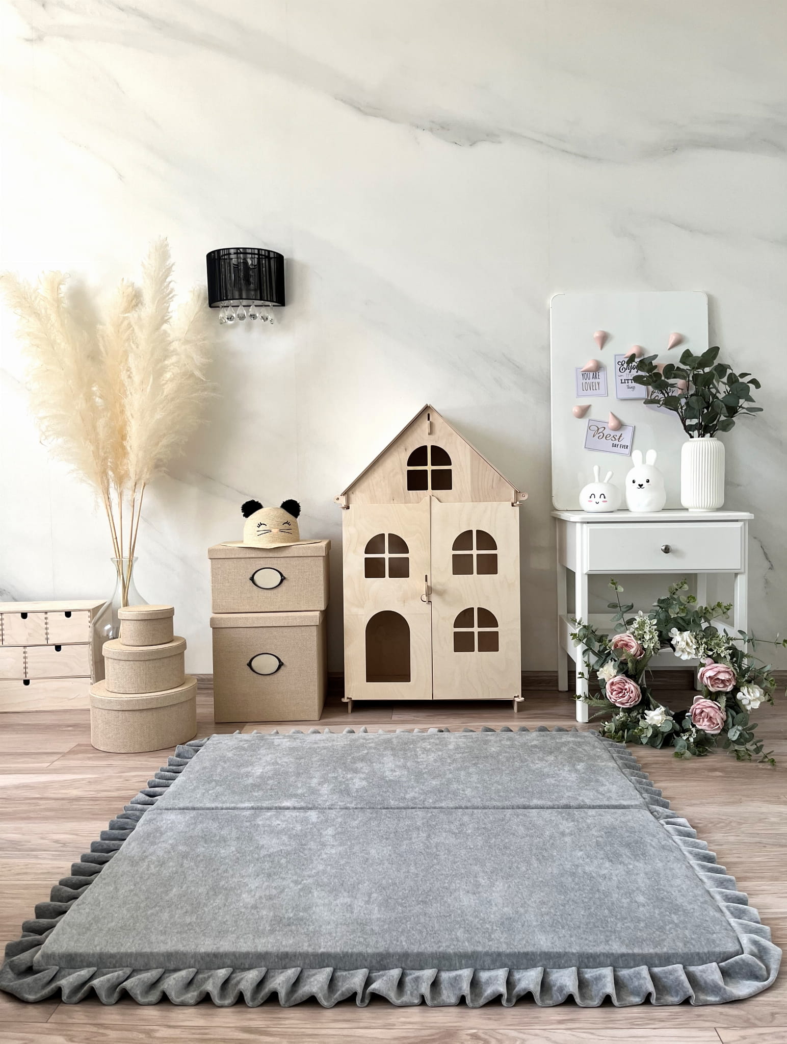 Die faltbare quadratische Spielmatte aus Velvet mit Rüschen ist nicht nur ein Ort zum Spielen, sondern kann auch als gemütliche Leseecke oder Entspannungsbereich genutzt werden. Die Kinder können sie flach auf den Boden legen oder zur Hälfte falten und an die Wand lehnen.