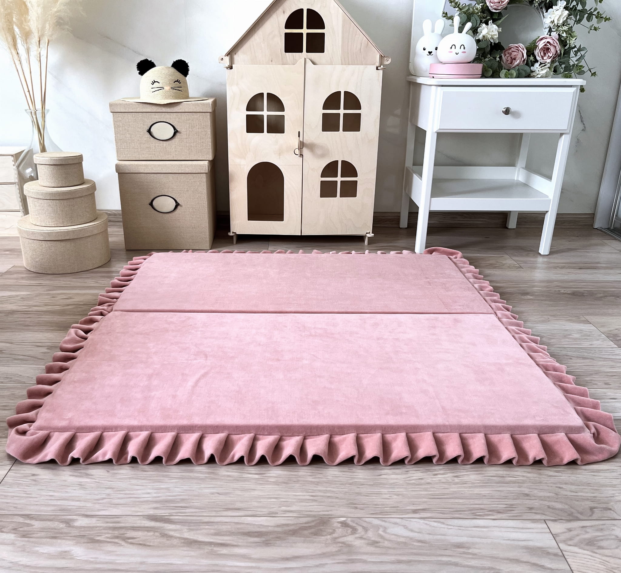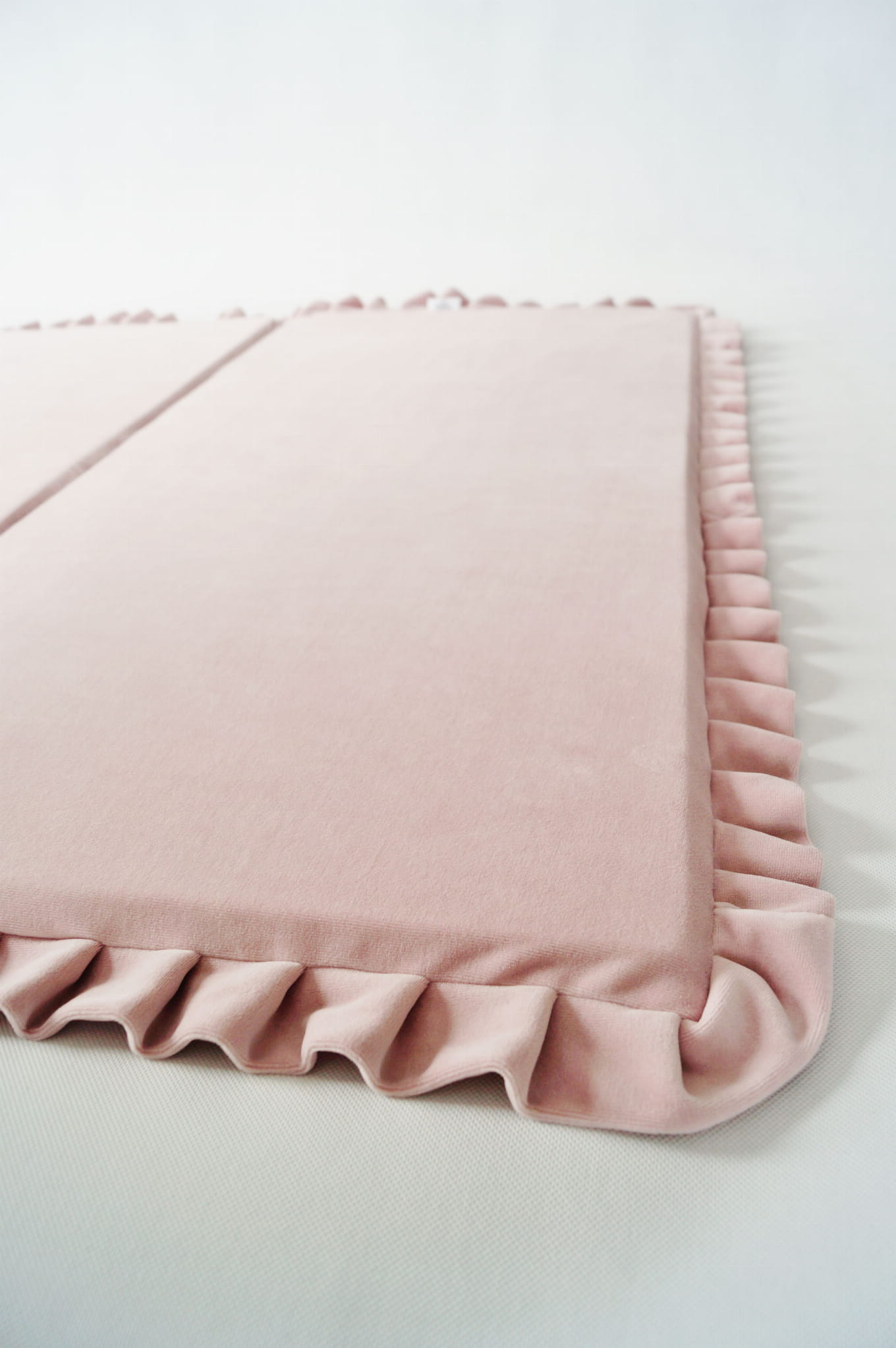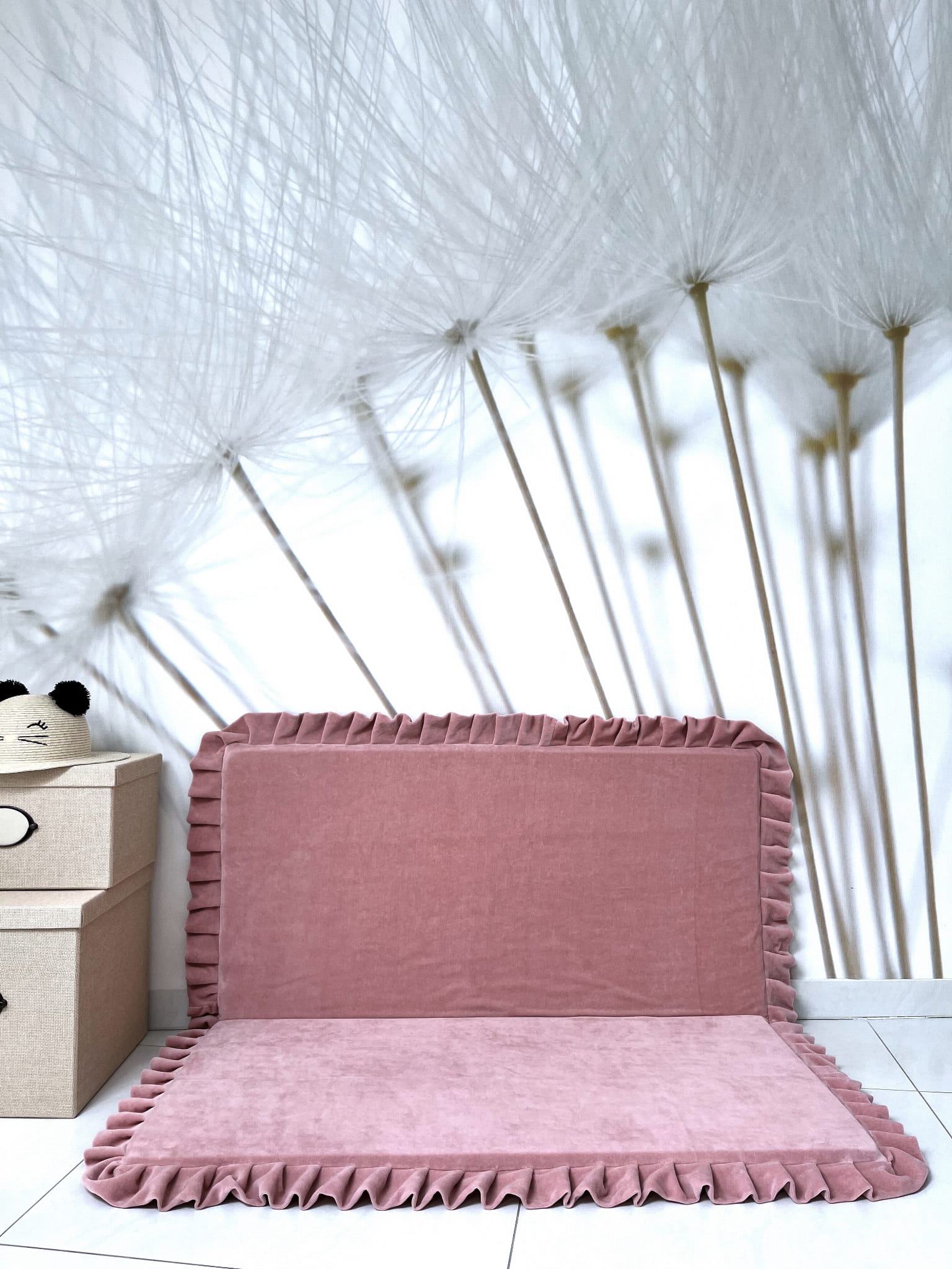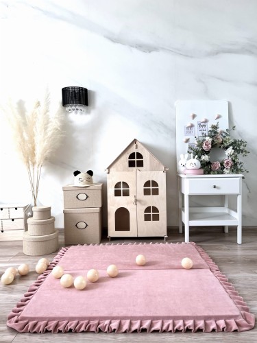 Die faltbare quadratische Spielmatte aus Velvet mit Rüschen ist nicht nur ein Ort zum Spielen, sondern kann auch als gemütliche Leseecke oder Entspannungsbereich genutzt werden. Die Kinder können sie flach auf den Boden legen oder zur Hälfte falten und an die Wand lehnen.