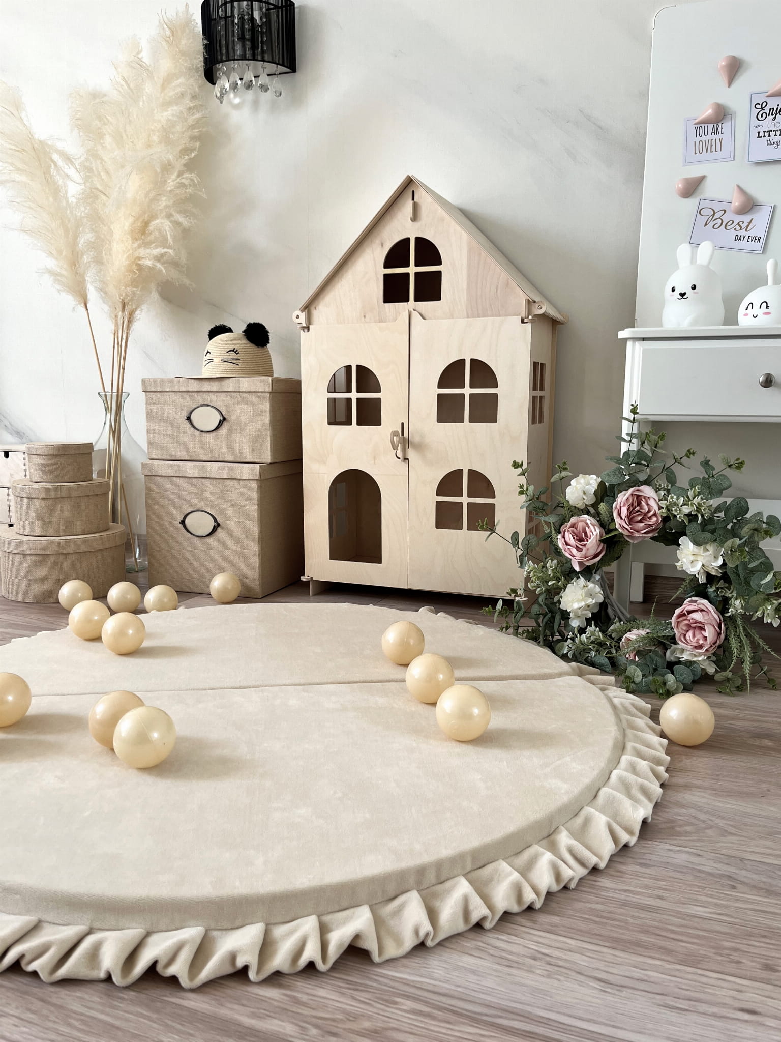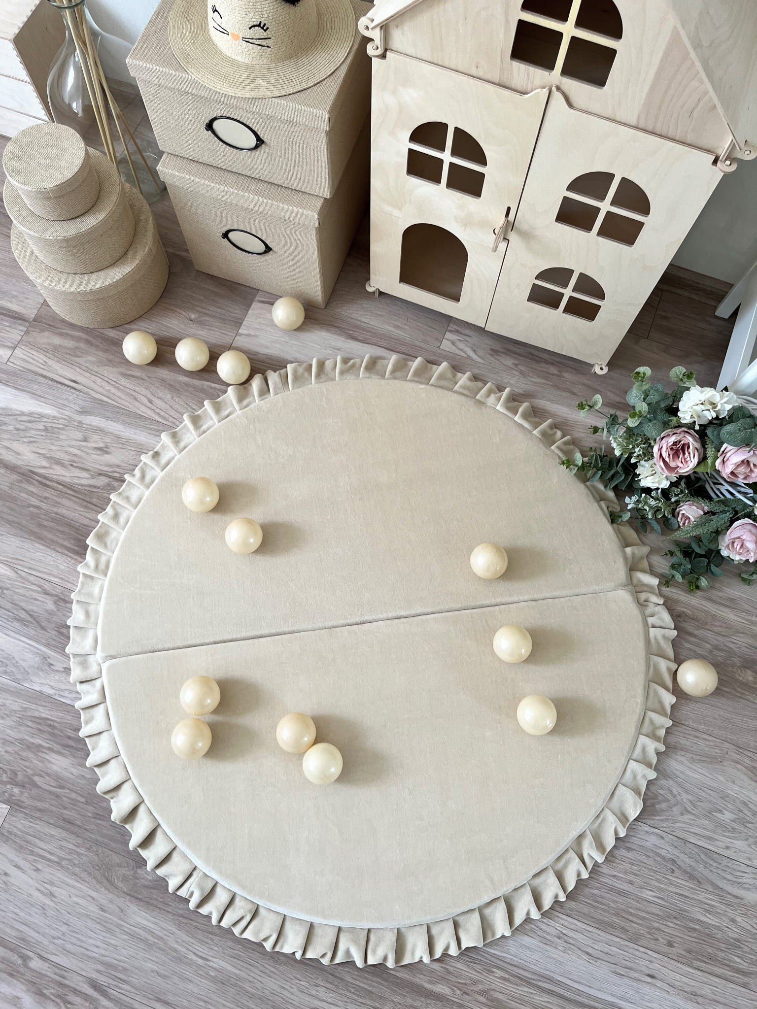 Suchen Sie nach der perfekten Spielmatte zum Toben, Spielen, Krabbeln und Entspannen? Voilà! Diese vielseitige, weiche Schaumstoffmatte wird all Ihren Bedürfnissen gerecht. Mit Leichtigkeit können Sie sie an die Wand klappen und in ein bequemes Sofakissen verwandeln, ideal für die kuschelige Ecke. Die schicken Rüschen und der elegante Samtbezug sind absolut im Trend und machen sie zu einem wahren Schmuckstück im Kinderzimmer.