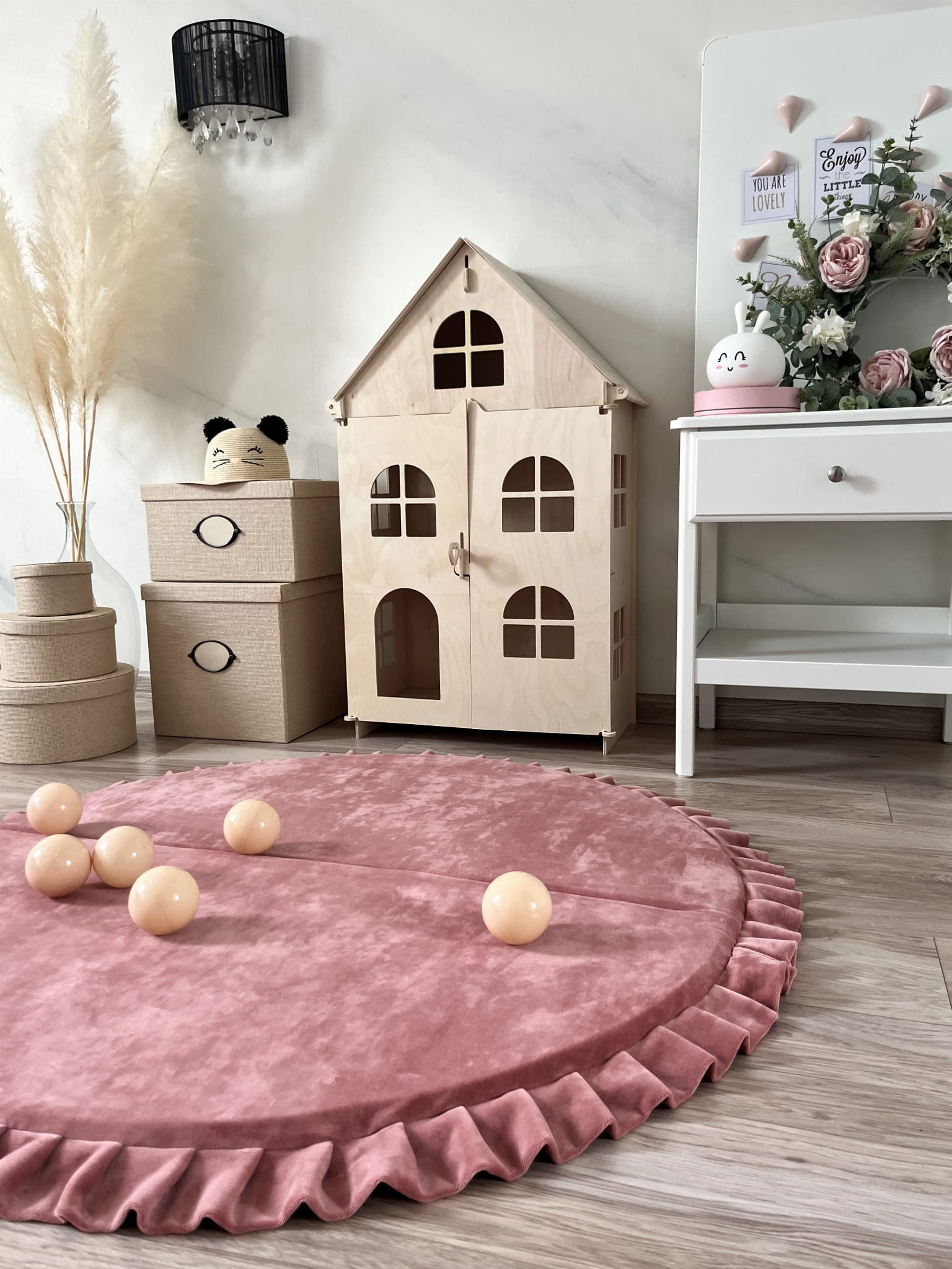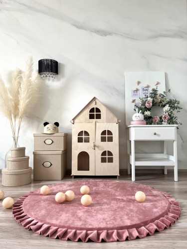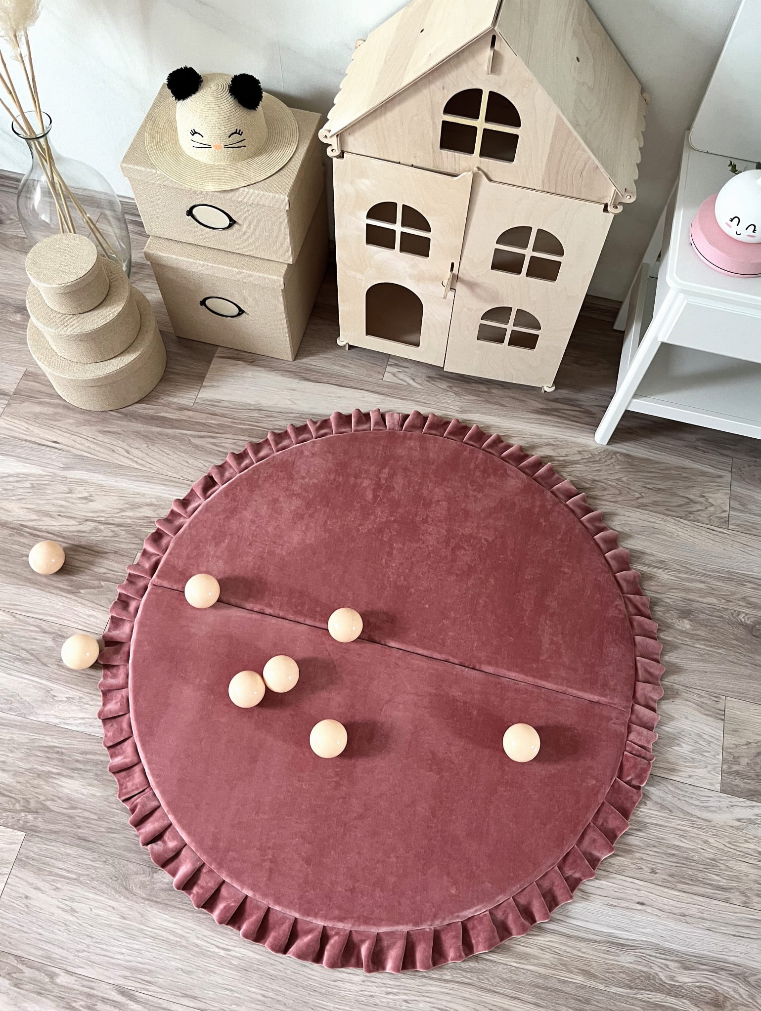Suchen Sie nach der perfekten Spielmatte zum Toben, Spielen, Krabbeln und Entspannen? Voilà! Diese vielseitige, weiche Schaumstoffmatte wird all Ihren Bedürfnissen gerecht. Mit Leichtigkeit können Sie sie an die Wand klappen und in ein bequemes Sofakissen verwandeln, ideal für die kuschelige Ecke. Die schicken Rüschen und der elegante Samtbezug sind absolut im Trend und machen sie zu einem wahren Schmuckstück im Kinderzimmer.