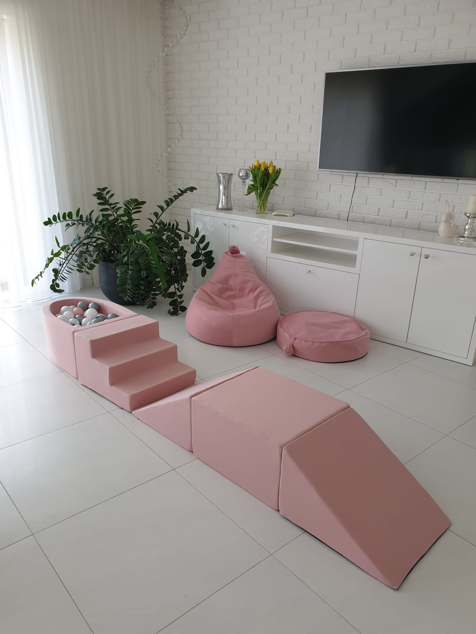 Die einzelnen Elemente dienen nicht nur als Sitzpuff , sondern auch als gemütliche Sitzgelegenheit. Unsere Spielbausteine bestehen aus antiallergischem Polyurethanschaum, der leicht ist und gleichzeitig eine hohe Formbeständigkeit aufweist. Dadurch sind sie besonders kindersicher und äußerst praktisch. Dank des geringen Gewichts der einzelnen Bausteine können sie problemlos an verschiedene Orte bewegt werden. Jedes Element des Sets verfügt über einen abnehmbaren Bezug, der in der Waschmaschine gereinigt werden kann und den Hindernisparcours stets sauber hält. Das Set beinhaltet außerdem ein Mini-Bällebad mit farbenfrohen Bällen, deren Farben individuell ausgewählt werden können. Unser Schaumstoff-Spielplatz ist eine wunderbare Ergänzung für Kindergärten, Kinderzimmer und Spielbereiche. Besonders hervorzuheben ist die angenehm anzufassende Oberfläche der Bezüge. Das schlichte und minimalistische Design des Produkts fügt sich nahtlos in Ihren Wohnraum ein.