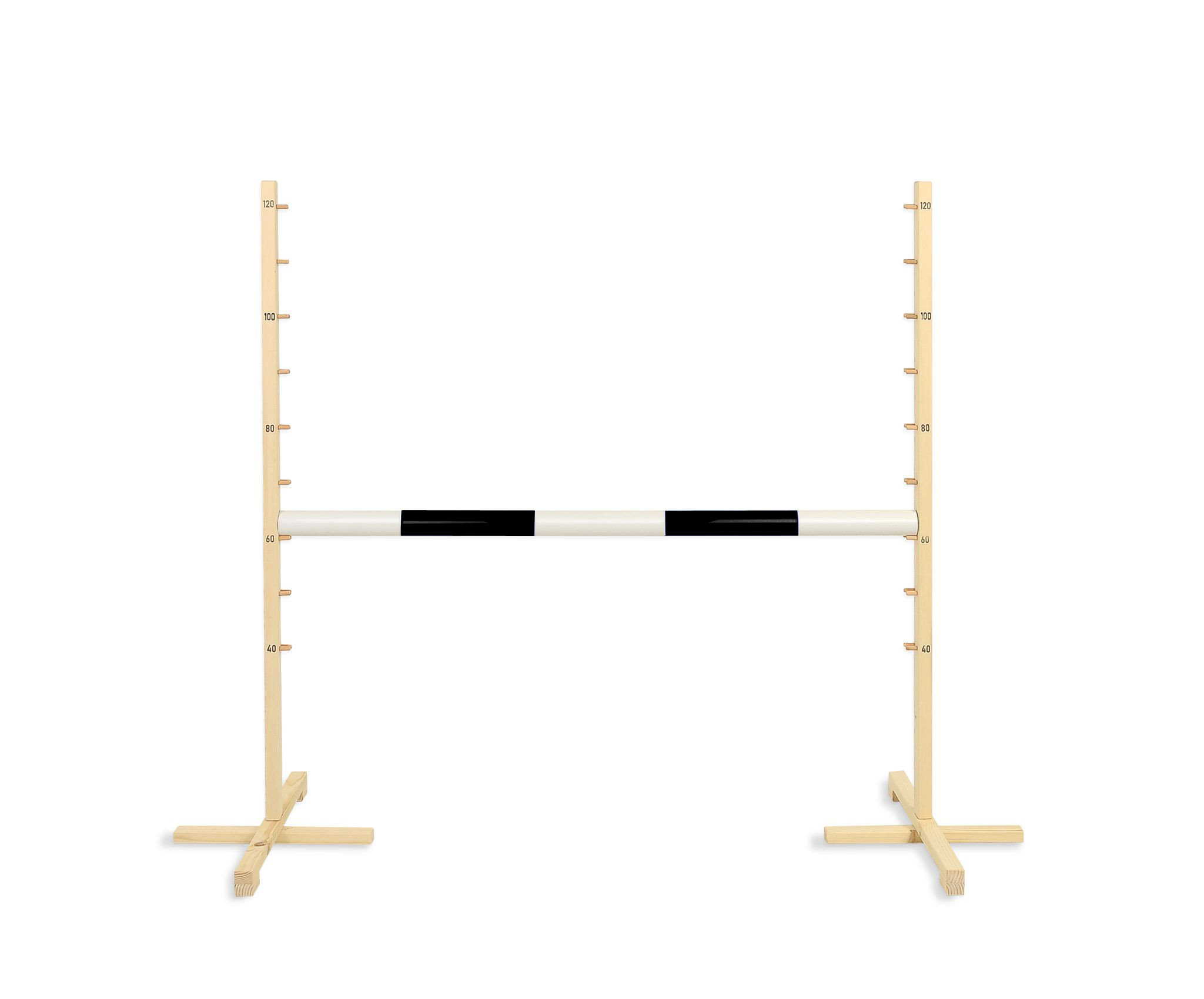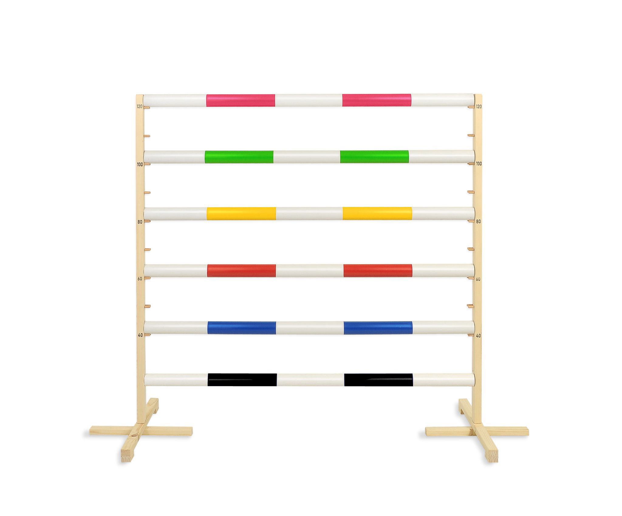 Das Hindernis ist haltbar und sicher, aus perfekt geschliffenem Kiefernholz gefertigt, damit sich das Kind beim Springen oder Bewegen des Ständers nicht verletzt. Das Hindernis hat stabile Füße, um sicher zu stehen. Die Stäbe sind aus Kunststoff, leicht und in mehreren Farbvarianten erhältlich.