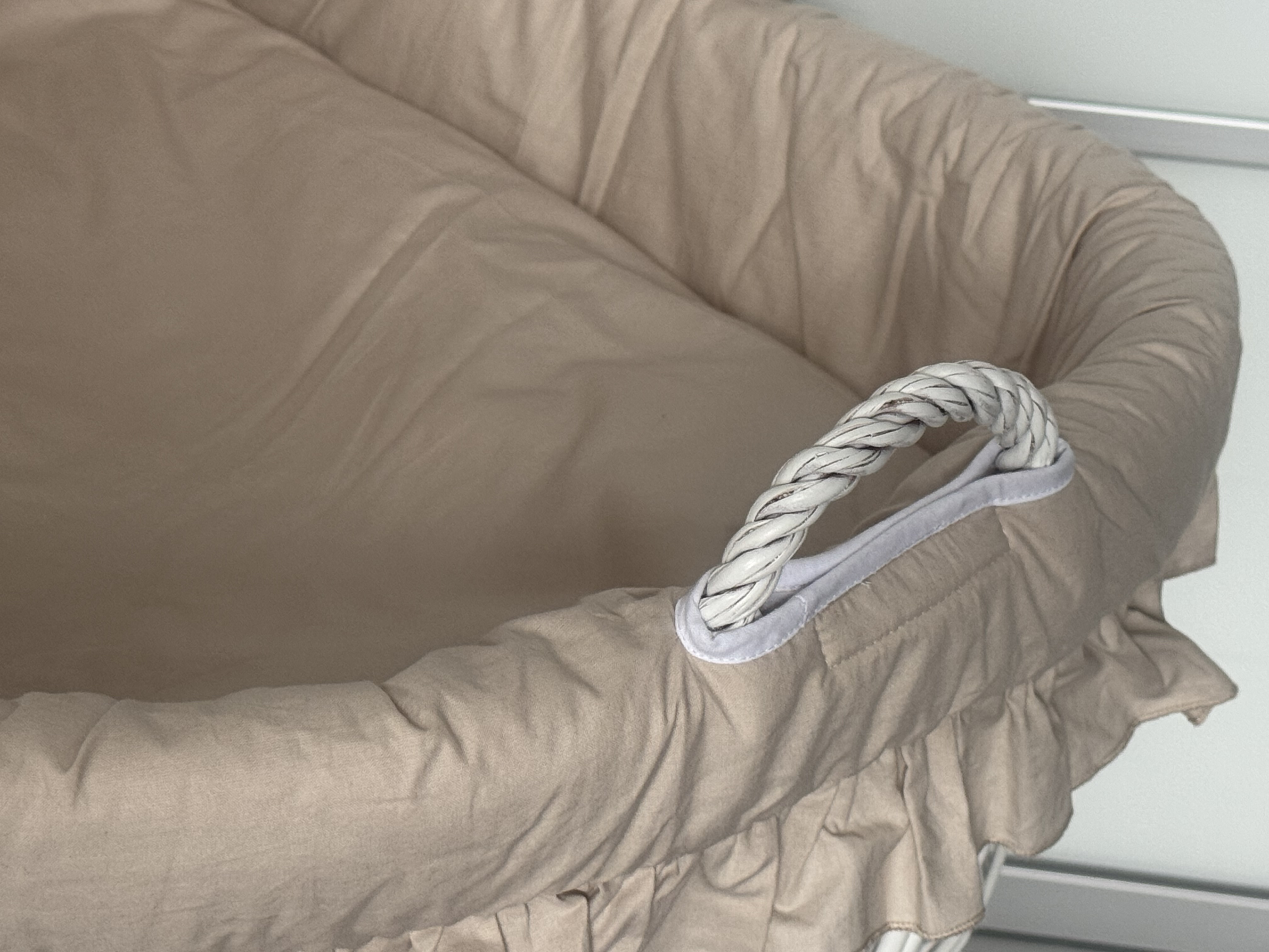 - Einen Korbbezug mit Füllung, passend für Stubenwagen mit den Maßen 60-65x99x33 cm (Breite x Länge x Höhe) und einem oberen Randumfang von 271-280 cm