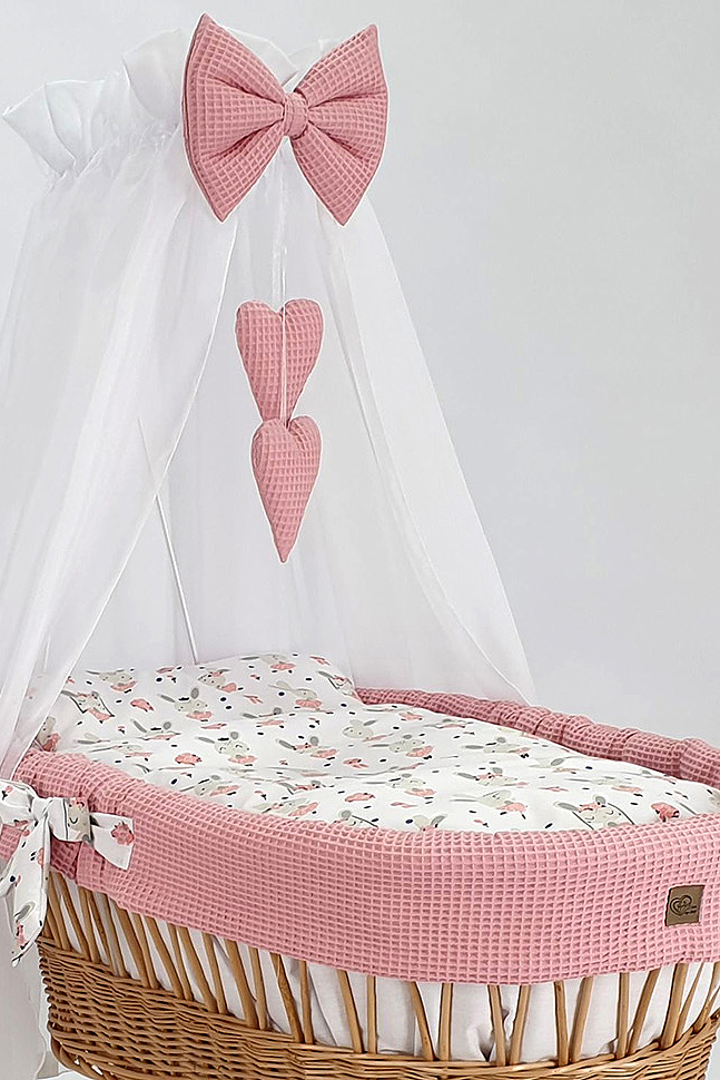 Das maximale Gewicht des Kindes beträgt 9kg, und mit dem 5-teiligen Bettwäsche-Set in Puderrosa sind Sie bestens ausgestattet. Enthalten sind ein Korbbezug mit Füllung, eine Bettwäsche 2in1 (Kissen 30x40cm und Decke 70x80cm zusammengenäht), sowie eine Schaumstoffmatratze 70x38x4cm und ein passendes Spannbetttuch.