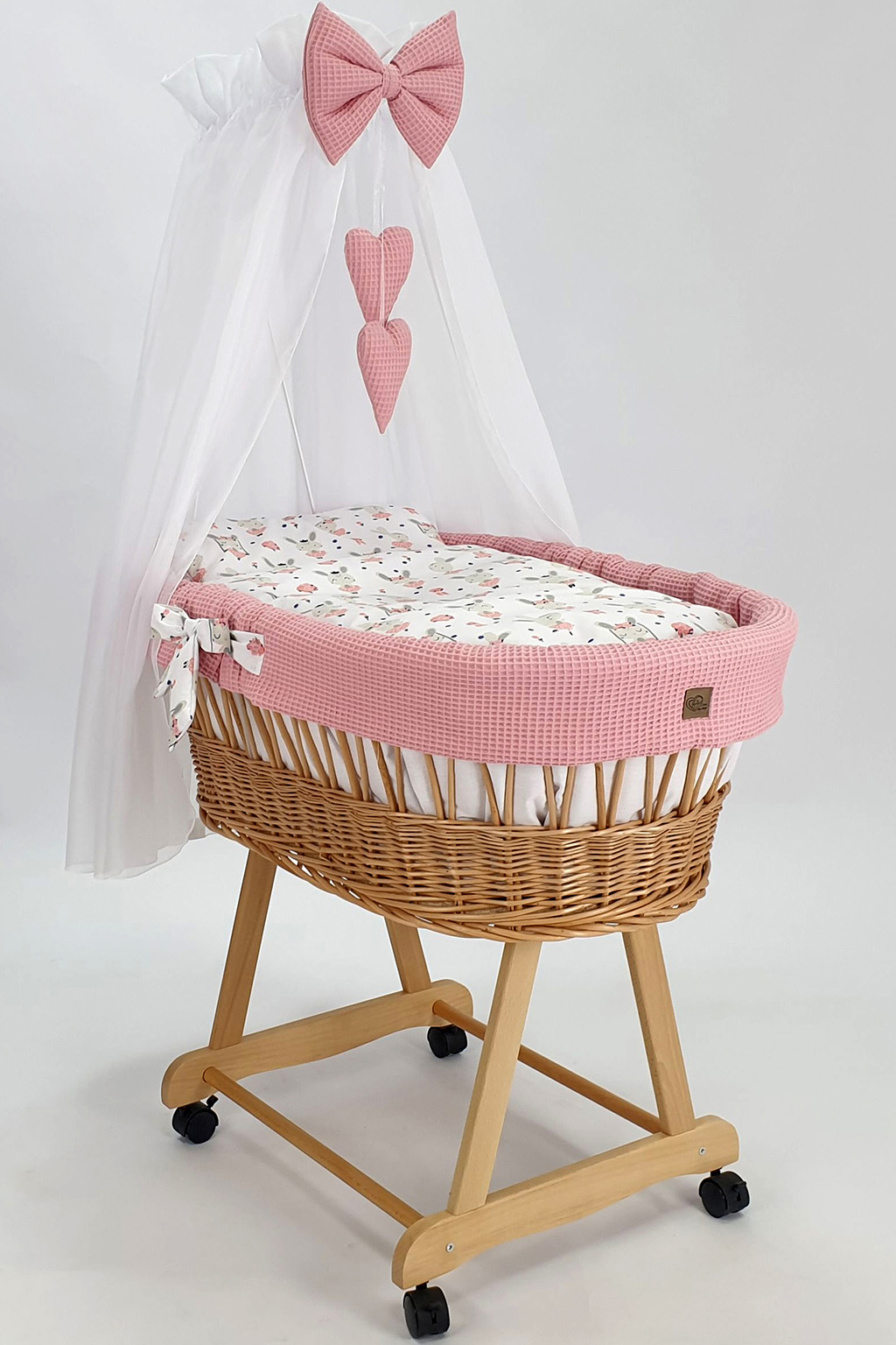 Unser Stubenwagen mit Himmel ist mehr als nur ein Bett – er ist ein Kunstwerk aus natürlichen Materialien und jahrelanger Handwerkskunst. Jeder Korb wird von erfahrenen Händen aus polnischem Weidenholz geflochten und mit umweltfreundlicher Farbe bemalt, die den höchsten Standards entspricht. Das solide Holzgestell mit seinen drehbaren Rollen sorgt nicht nur für die Sicherheit Ihres Babys, sondern auch für eine mühelose Bewegung des Stubenwagens – egal, ob auf Parkett oder Fliesen.
