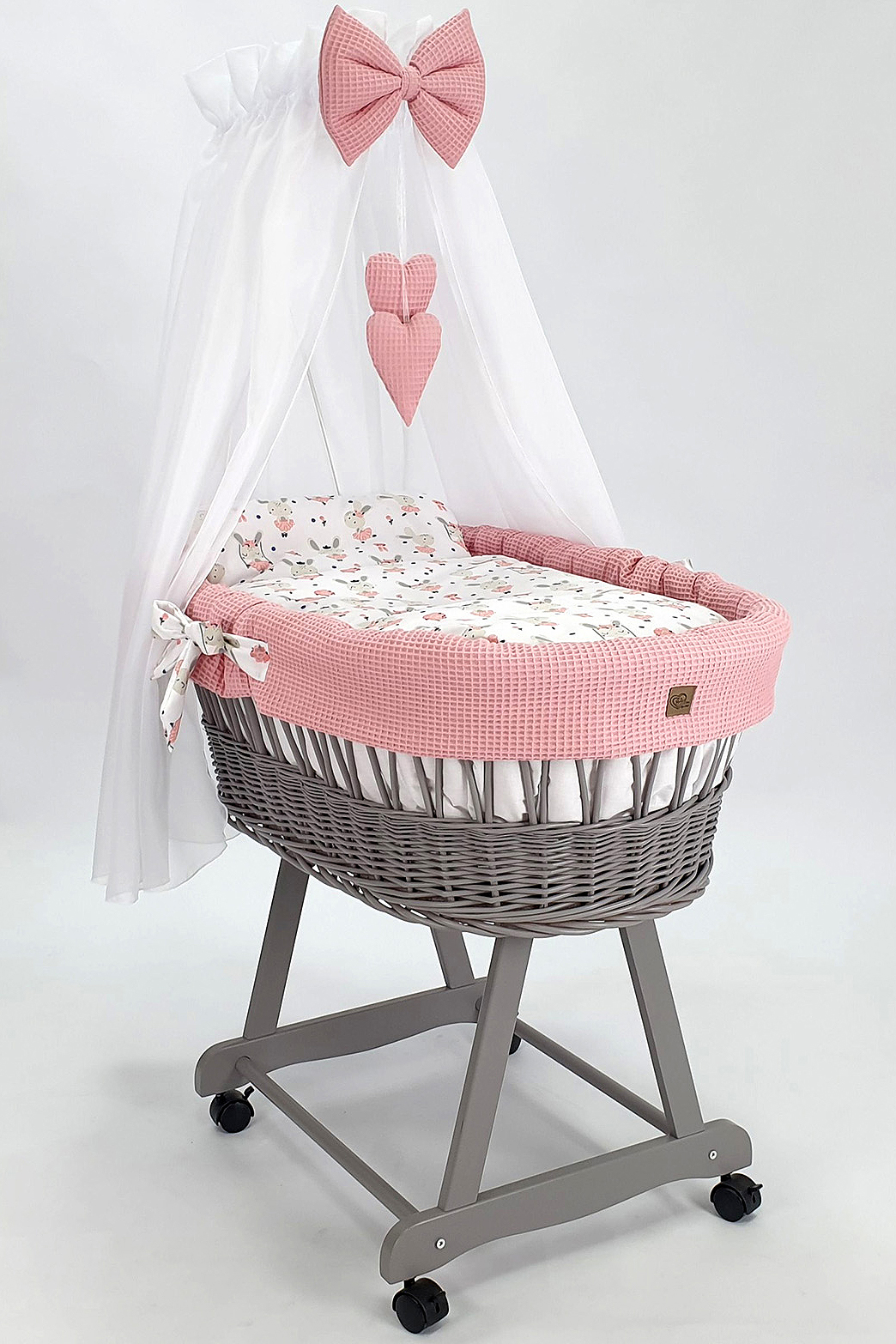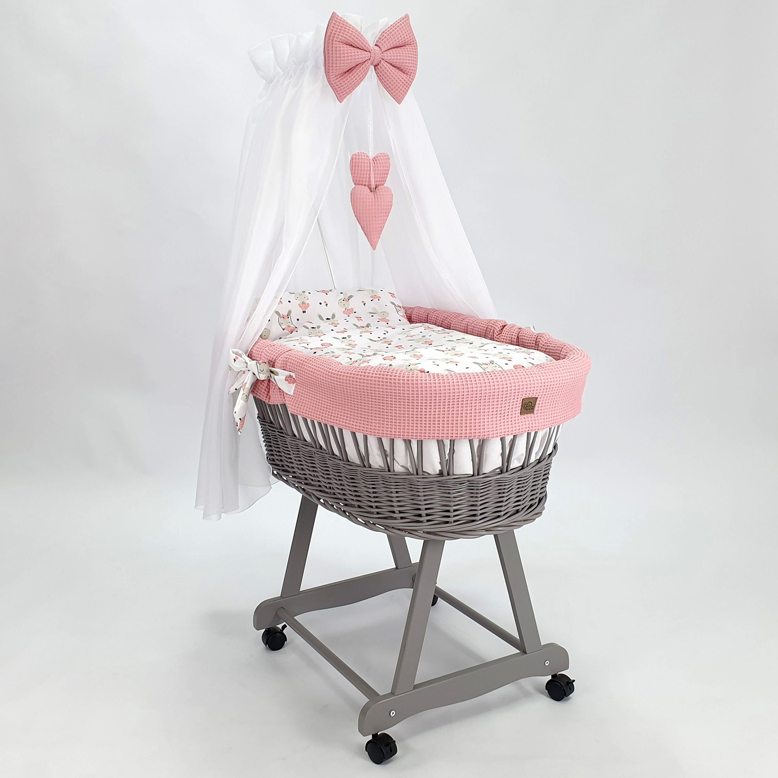 Unser Stubenwagen mit Himmel ist mehr als nur ein Bett – er ist ein Kunstwerk aus natürlichen Materialien und jahrelanger Handwerkskunst. Jeder Korb wird von erfahrenen Händen aus polnischem Weidenholz geflochten und mit umweltfreundlicher Farbe bemalt, die den höchsten Standards entspricht. Das solide Holzgestell mit seinen drehbaren Rollen sorgt nicht nur für die Sicherheit Ihres Babys, sondern auch für eine mühelose Bewegung des Stubenwagens – egal, ob auf Parkett oder Fliesen.