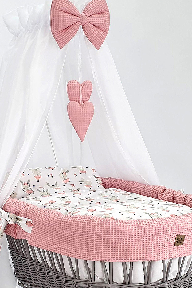 Das maximale Gewicht des Kindes beträgt 9kg, und mit dem 5-teiligen Bettwäsche-Set in Puderrosa sind Sie bestens ausgestattet. Enthalten sind ein Korbbezug mit Füllung, eine Bettwäsche 2in1 (Kissen 30x40cm und Decke 70x80cm zusammengenäht), sowie eine Schaumstoffmatratze 70x38x4cm und ein passendes Spannbetttuch.