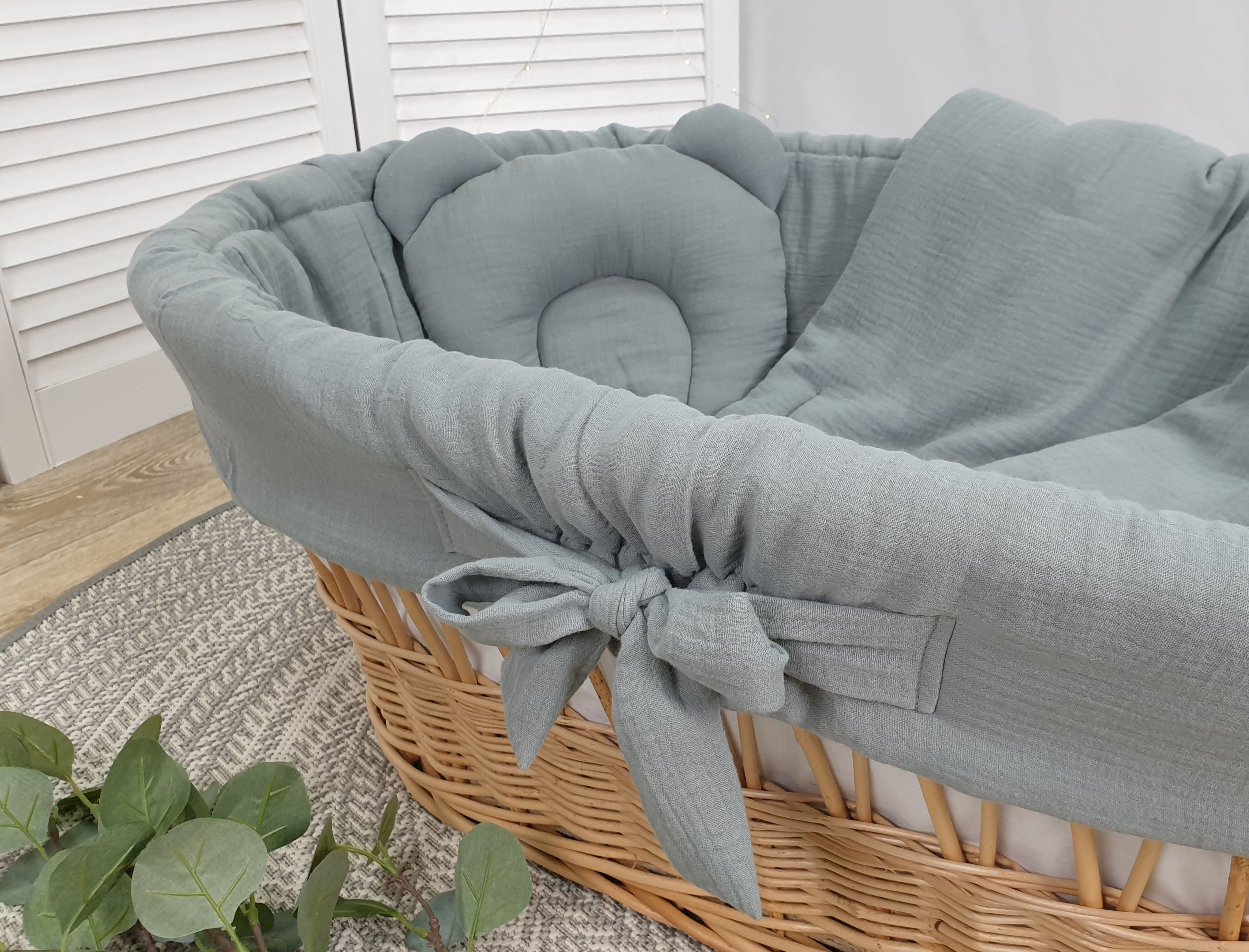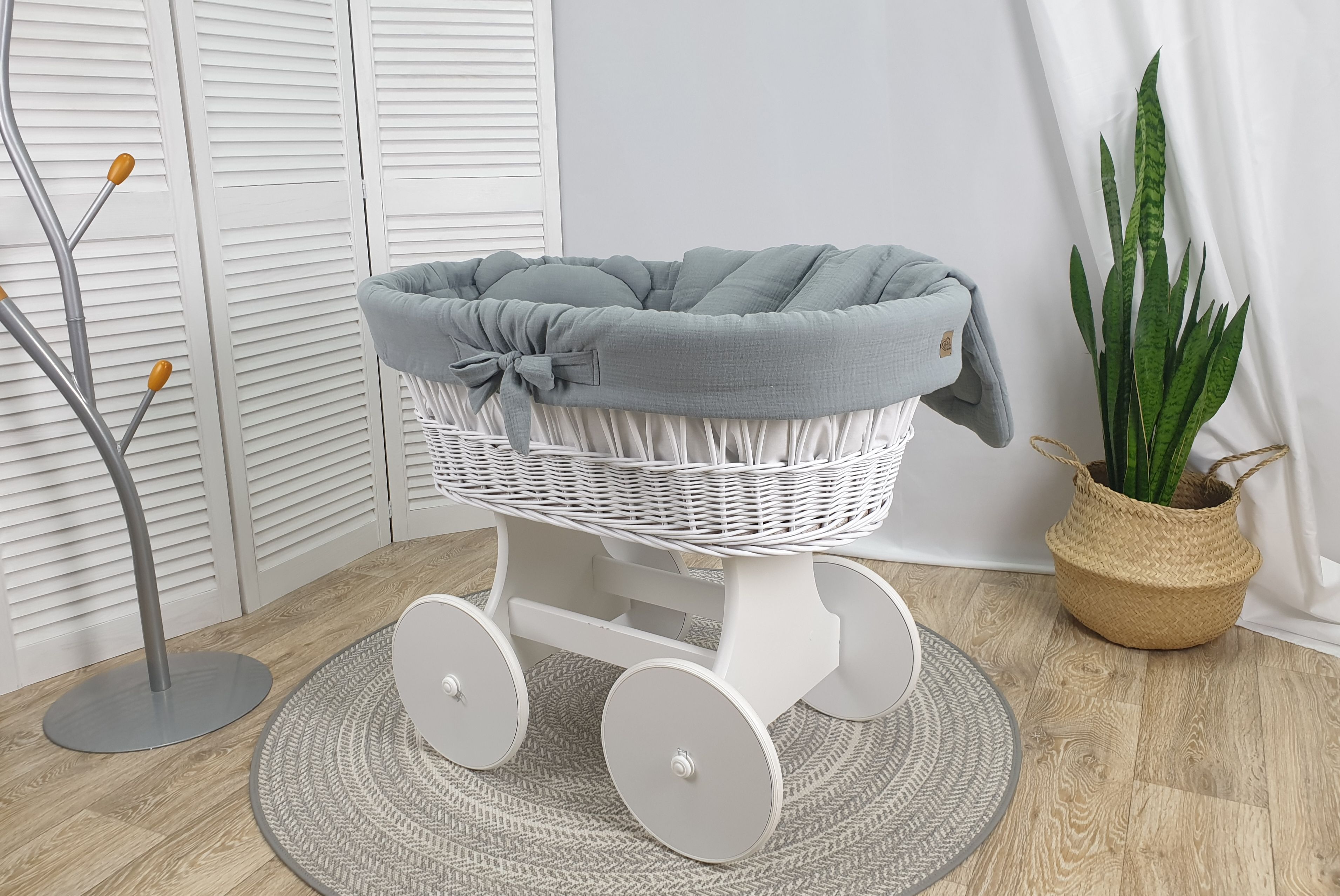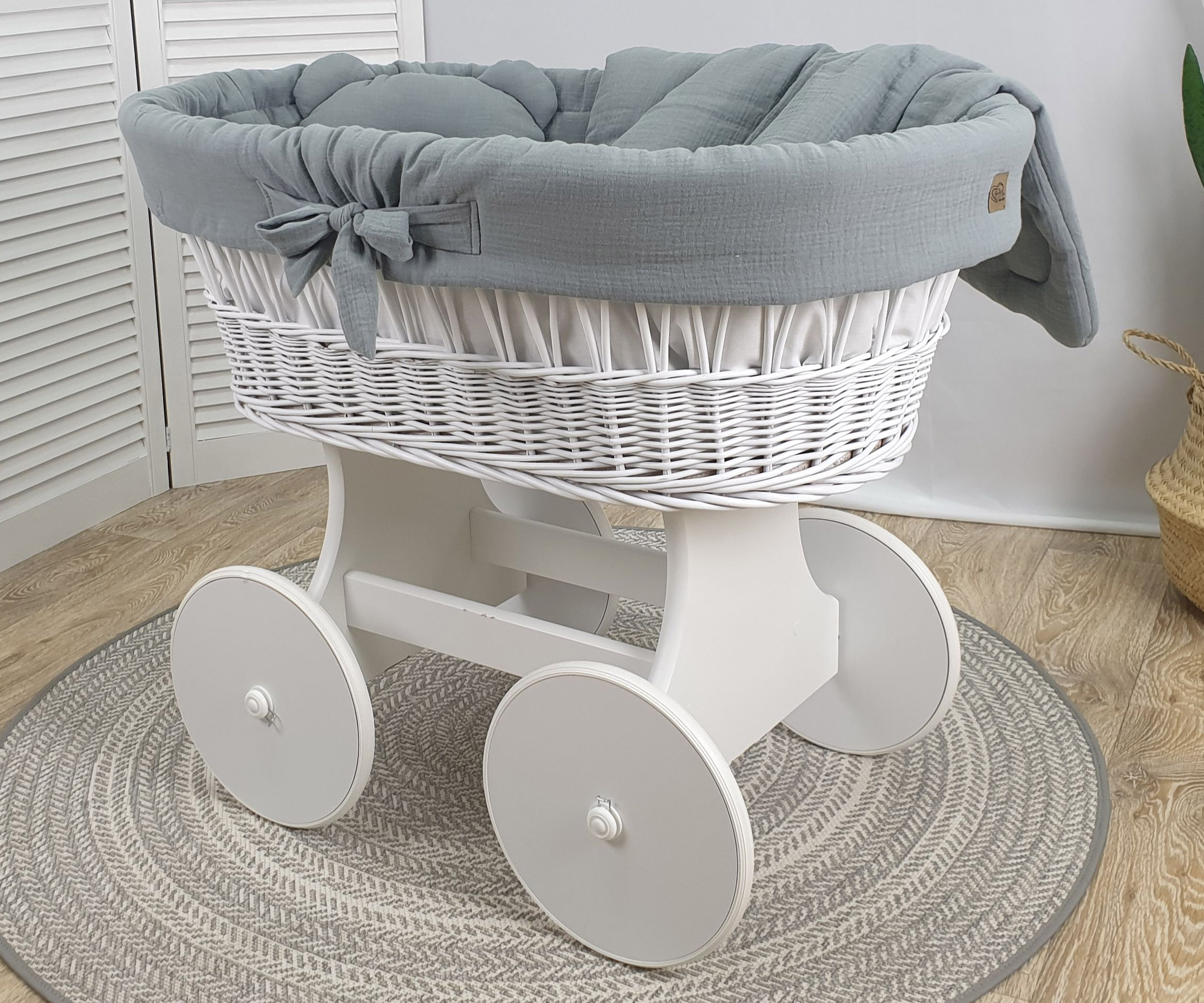 Der geräumige Korb mit den Maßen 90x55x30 cm, geflochten aus natürlicher, hochwertiger polnischer Weide, ist auf einem soliden Gestell montiert, das mit großen, gummierten Rädern ausgestattet ist. Diese Räder lassen sich sanft und leise bewegen und bieten mehr Stabilität im Vergleich zu kleineren Rollen. Sie sind ideal für Eltern, die den Wagen zwischen Räumen mit unterschiedlichen Bodenbelägen oder Schwellen schieben möchten, da die großen Räder leicht über solche Hindernisse rollen, ohne dabei laute Geräusche zu verursachen.