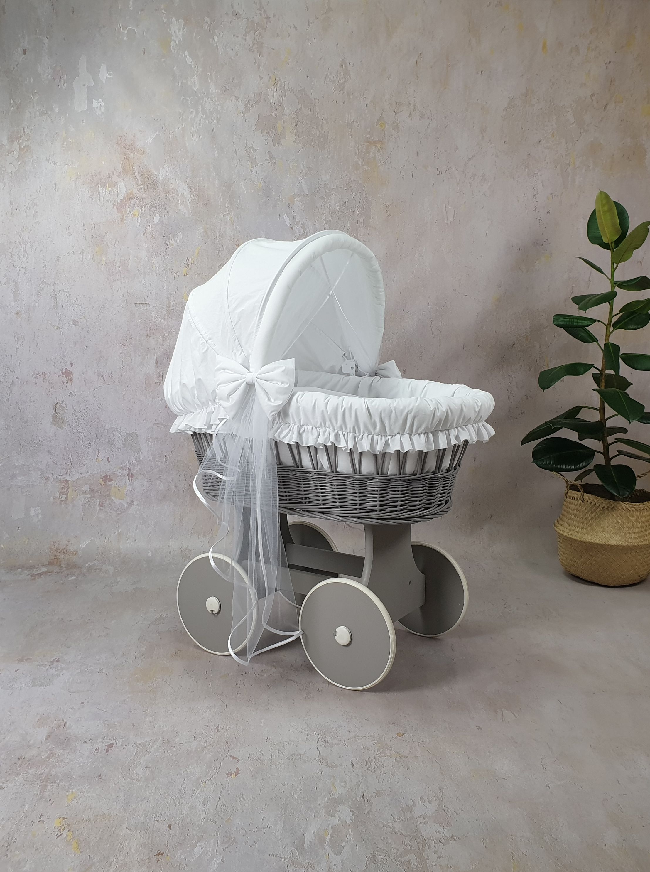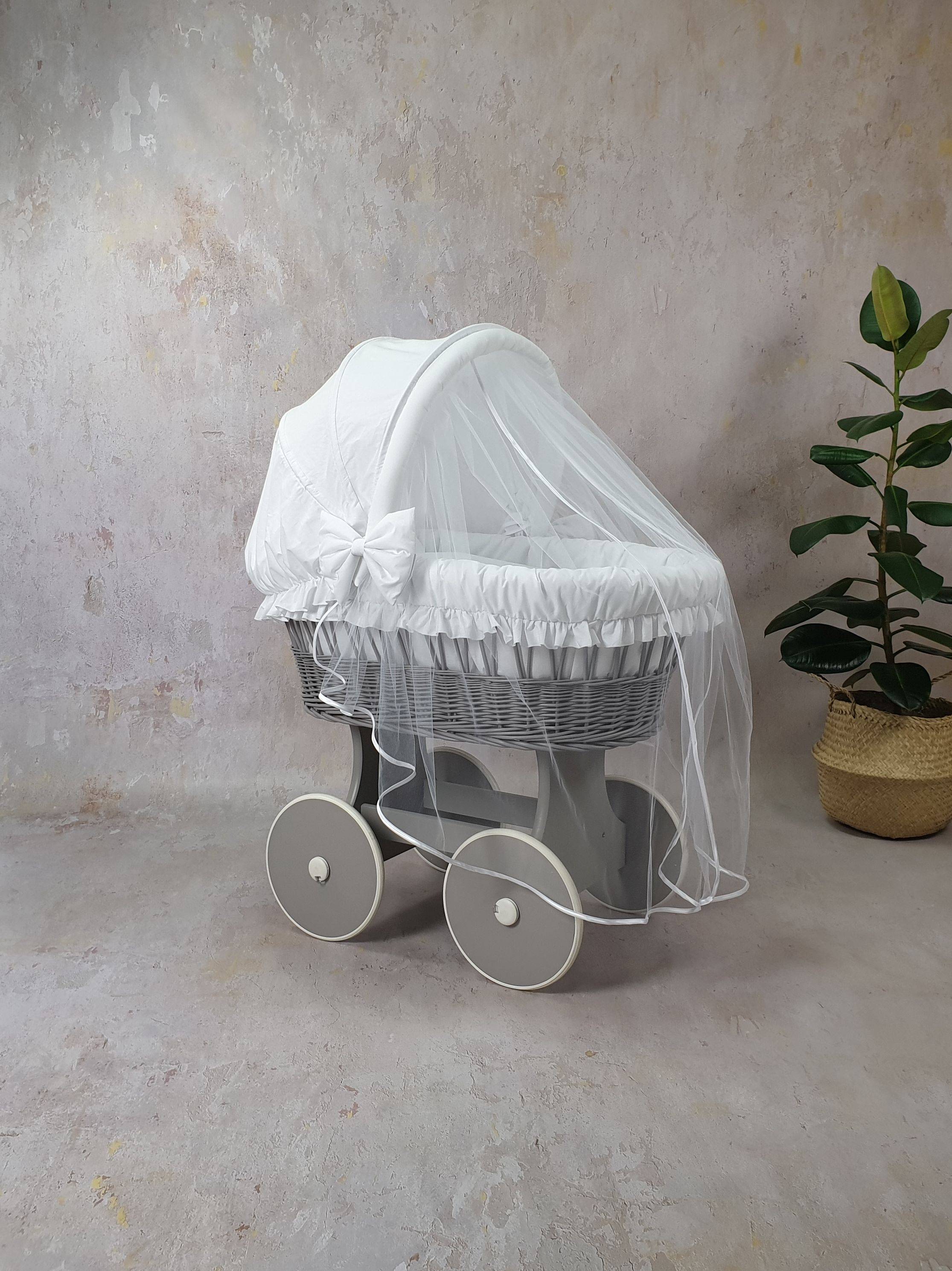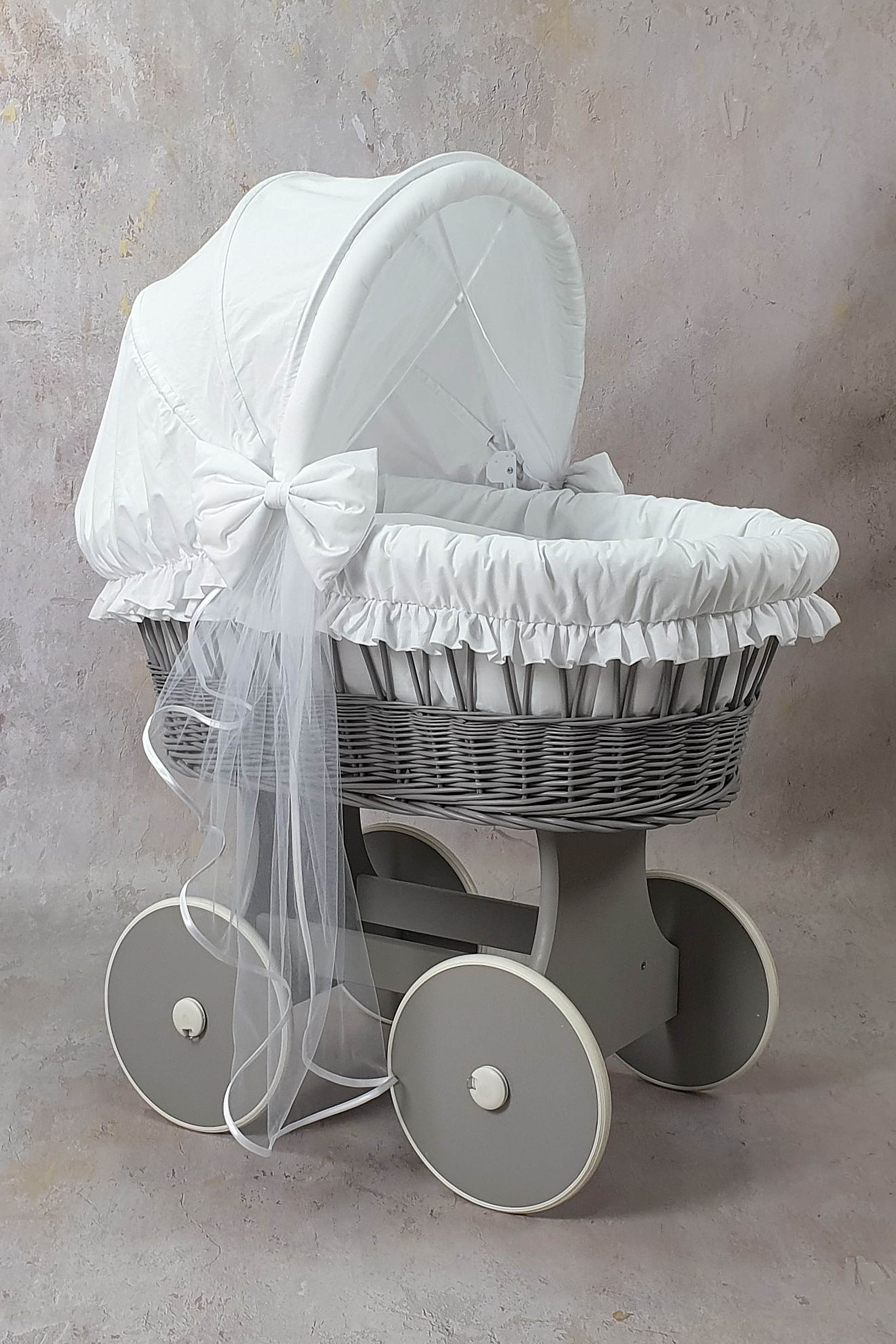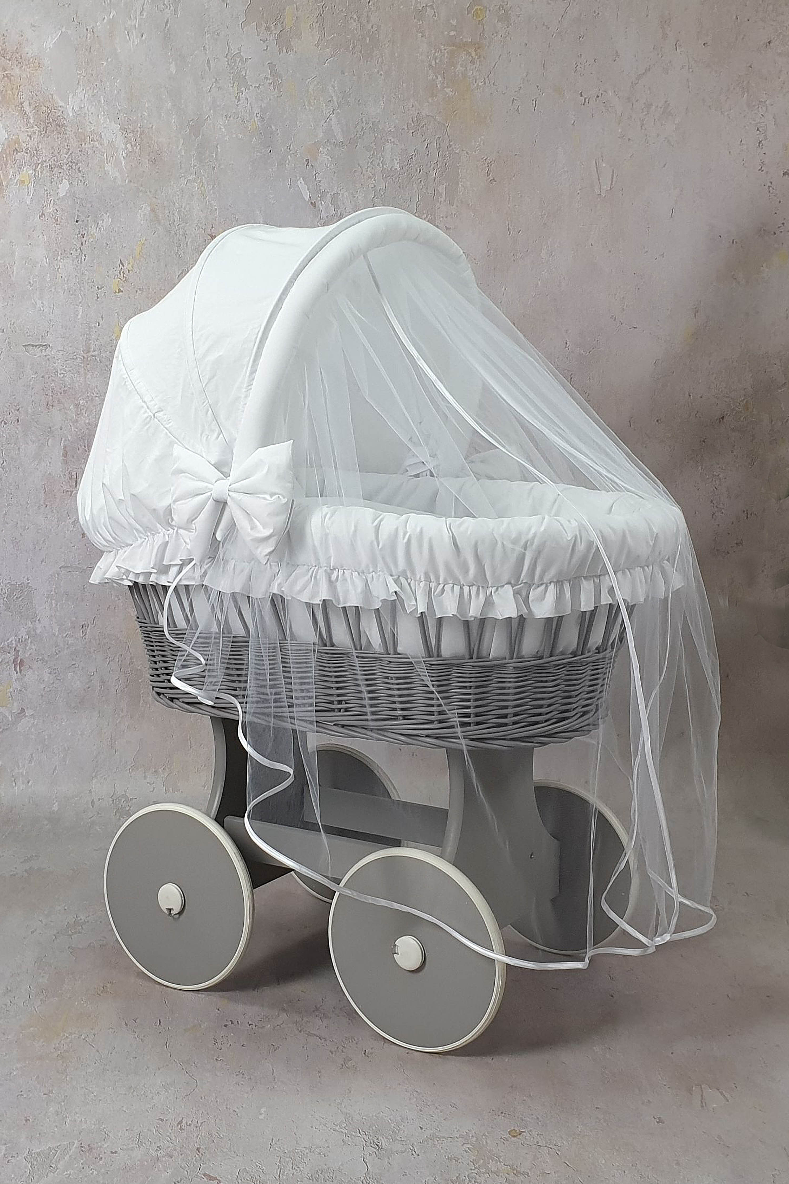 Der Satz umfasst einen Stubenwagen, bestehend aus einem Weidenkorb mit Haube mit Moskitonetz und einem Gestell mit großen Rädern, sowie einen 7-teiligen Bettwäsche-Set.