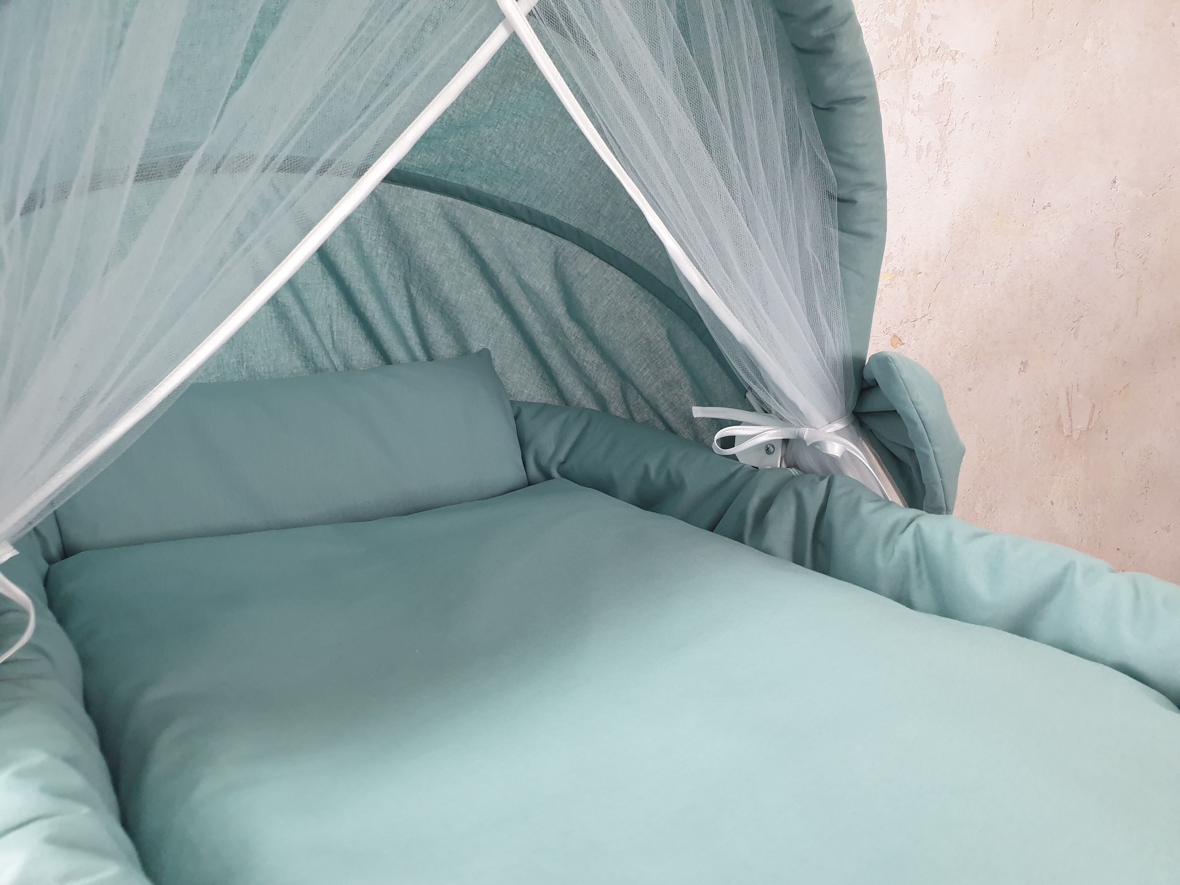Das Set beinhaltet nicht nur den Stubenwagen, sondern auch ein komplettes Bettwäscheset aus 100% Baumwolle, bestehend aus Einlage, Kissen, Decke, Spannbettlaken und Haube mit Moskitonetz. Alle Materialien sind OEKO-TEX zertifiziert und allergiefrei.