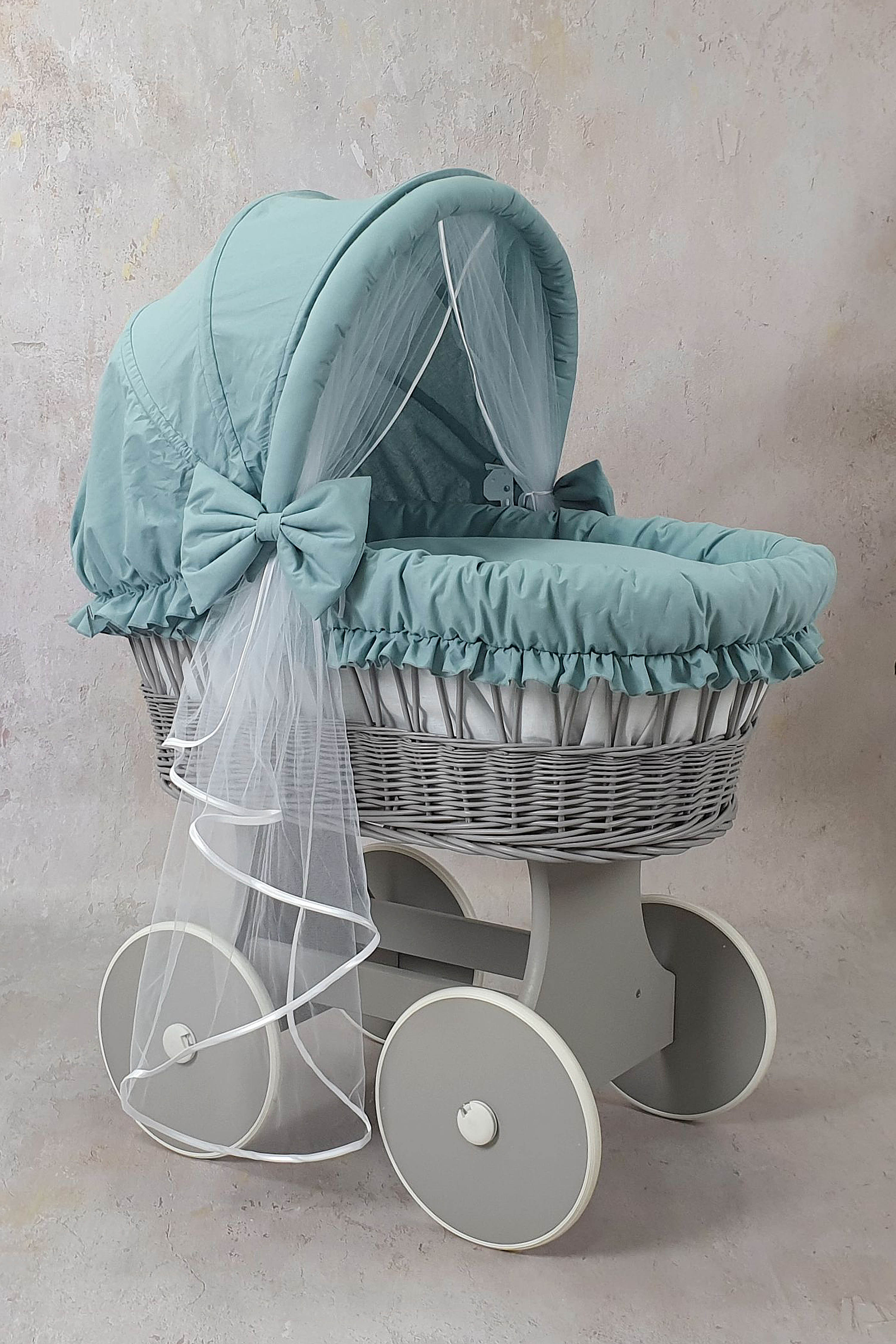 Der Satz umfasst einen Stubenwagen, bestehend aus einem Weidenkorb mit Haube mit Moskitonetz und einem Gestell mit großen Rädern, sowie einen 7-teiligen Bettwäsche-Set.