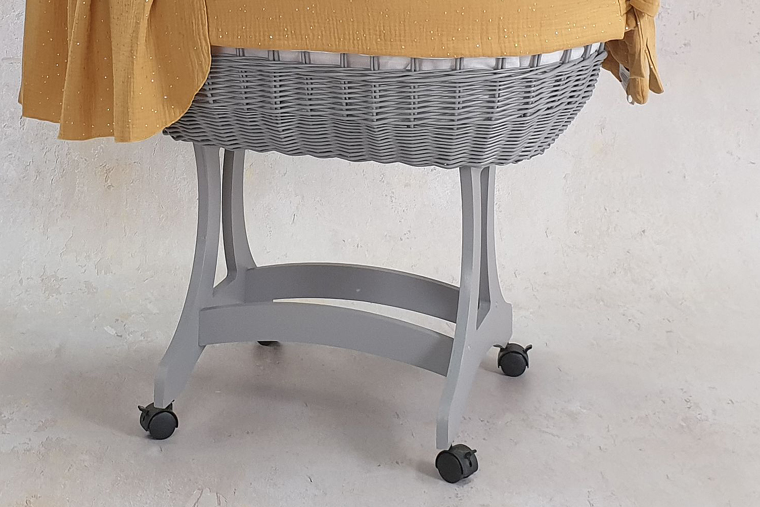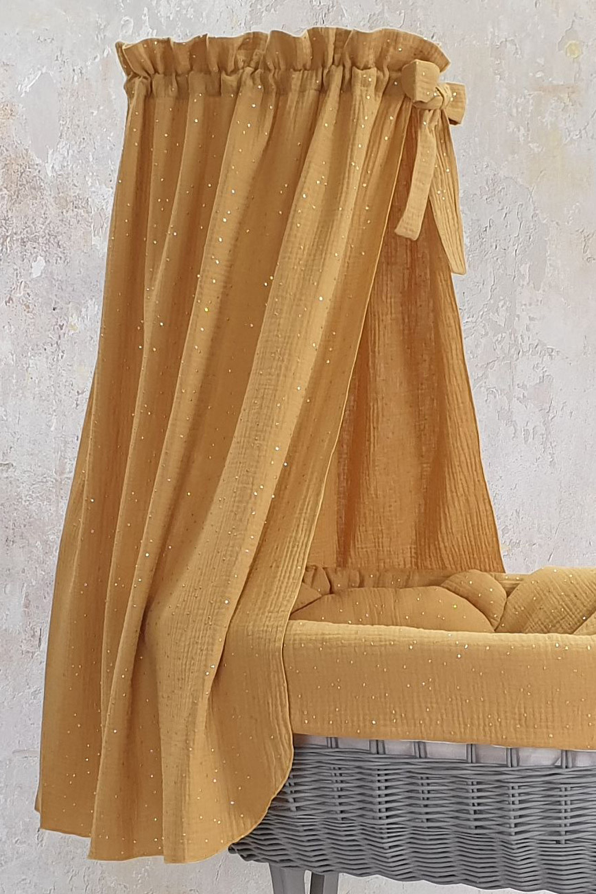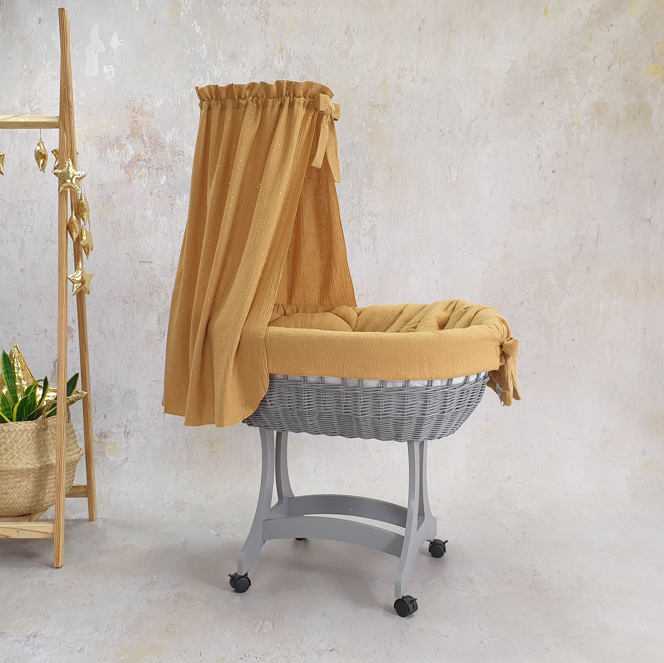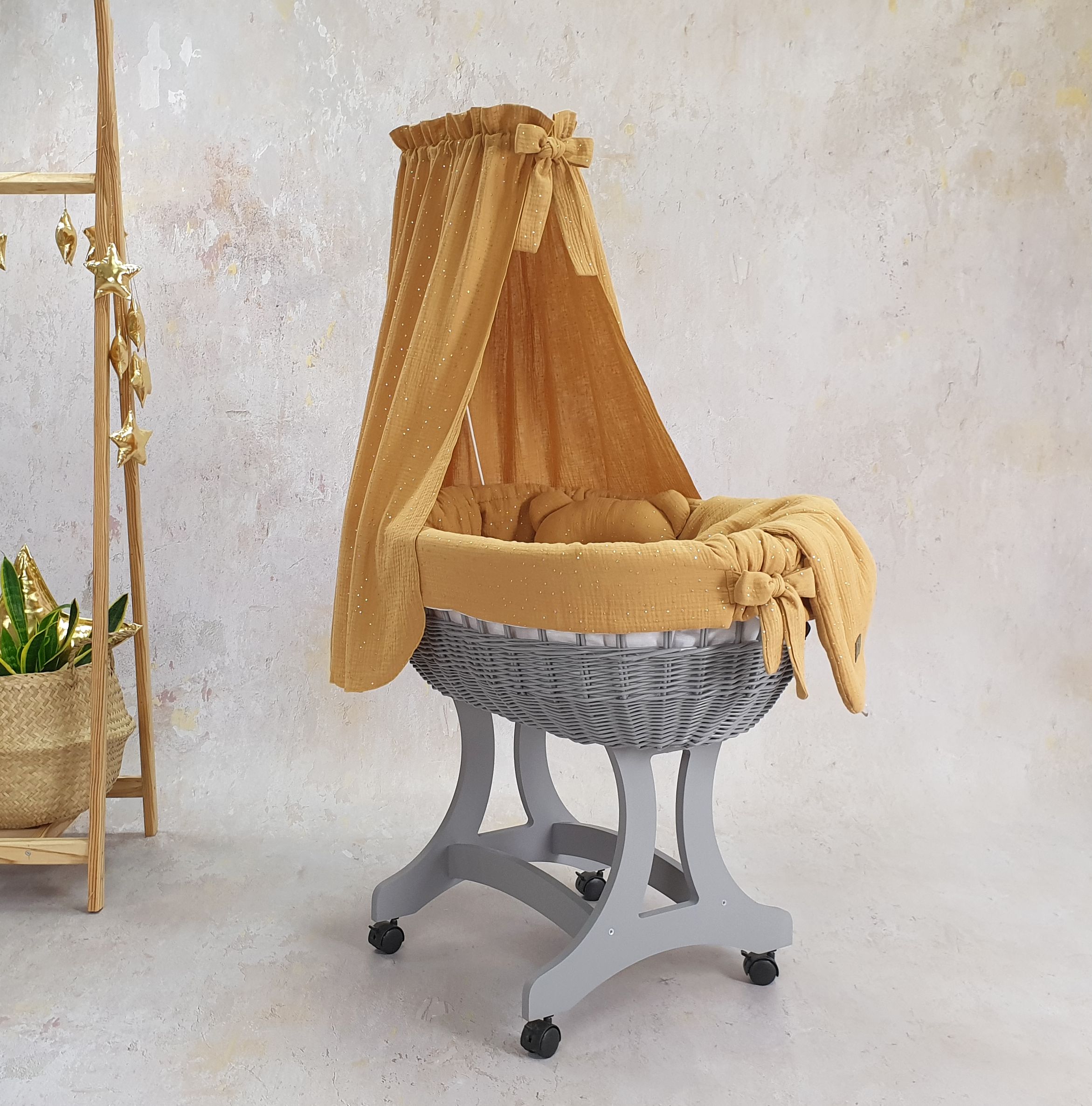 Unser Stubenwagen ist ein wahres Meisterwerk der Handwerkskunst. Die ovale Form des Korbs vermittelt Ihrem Baby ein Gefühl der Sicherheit und Geborgenheit, ähnlich wie in den Armen der Eltern. Stellen Sie sich vor, wie Ihr kleiner Schatz in sanftem Musselin-GOLD schläft, verziert mit zarten goldenen Punkten, die nicht nur optisch ansprechend sind, sondern auch ein weiches und angenehmes Hautgefühl bieten.