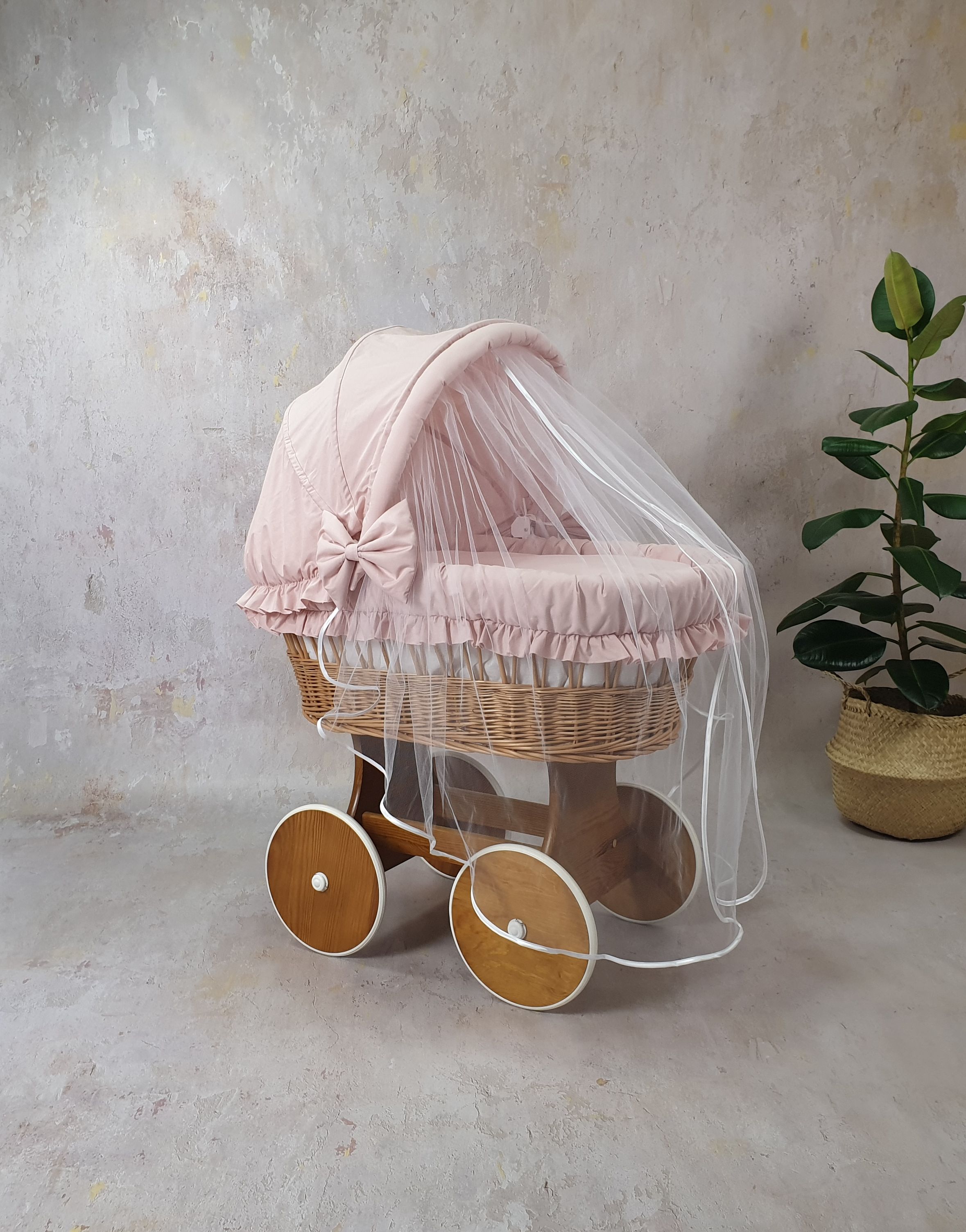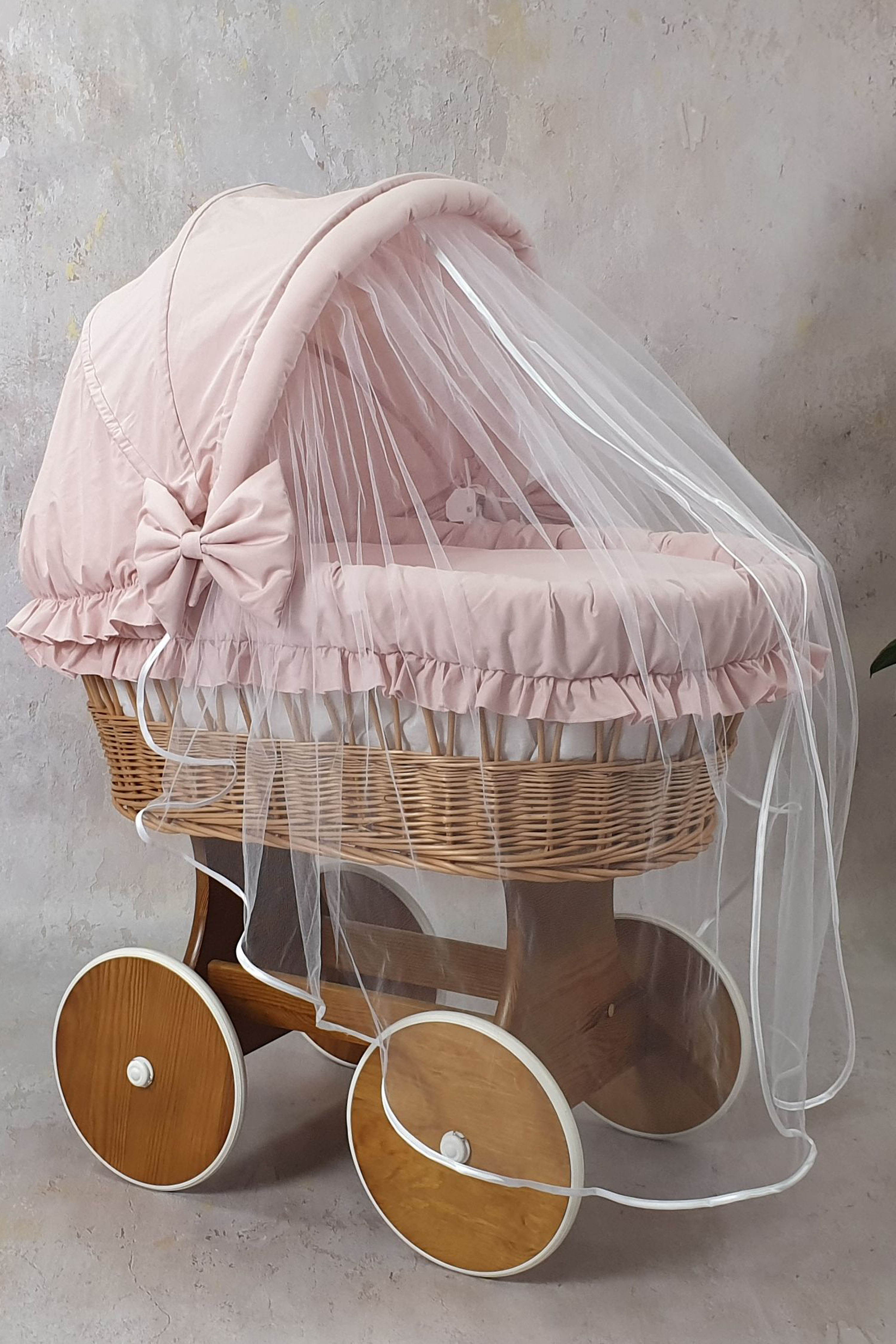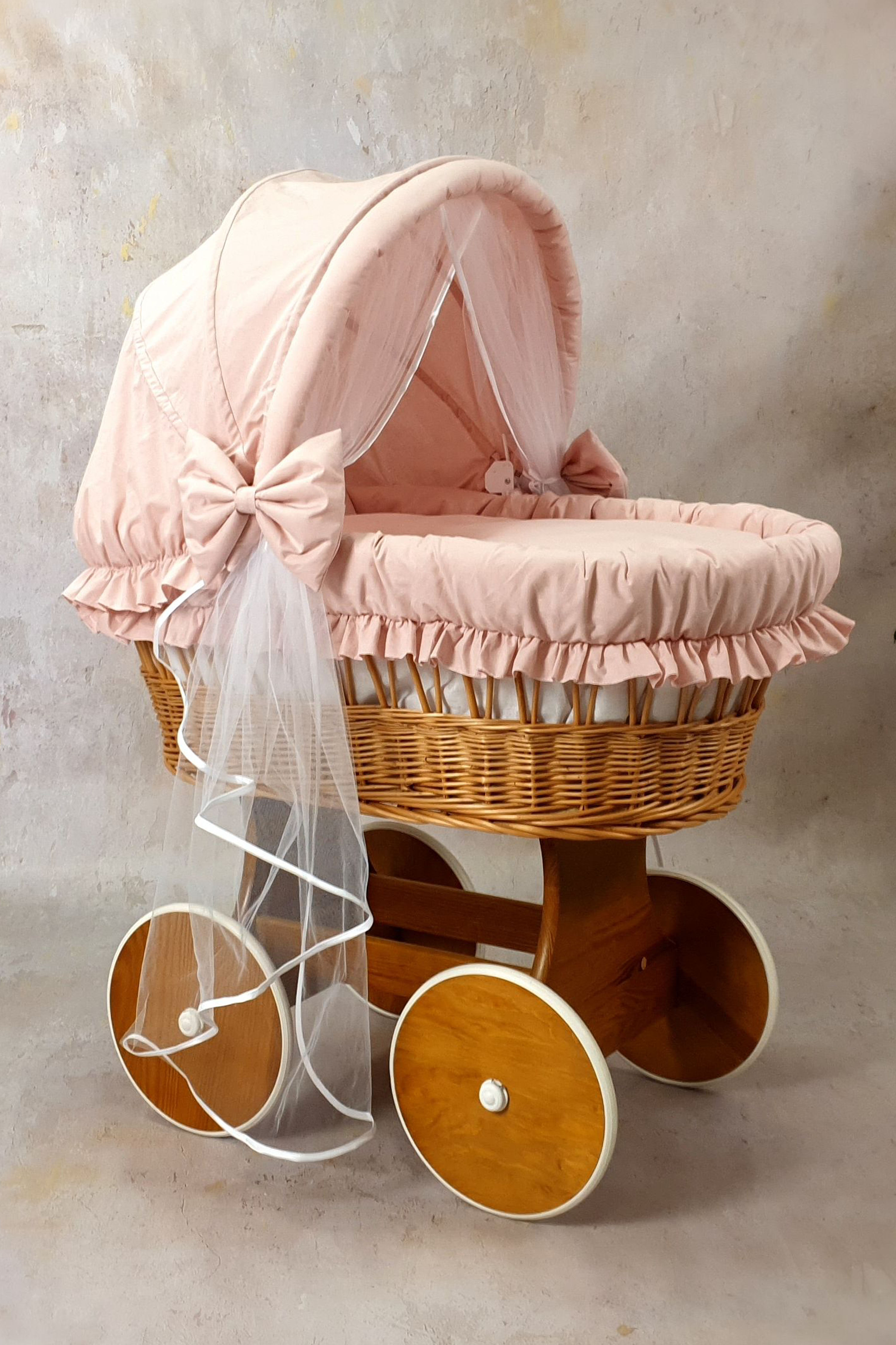 Der Satz umfasst einen Stubenwagen, bestehend aus einem Weidenkorb mit Haube mit Moskitonetz und einem Gestell mit großen Rädern, sowie einen 7-teiligen Bettwäsche-Set.