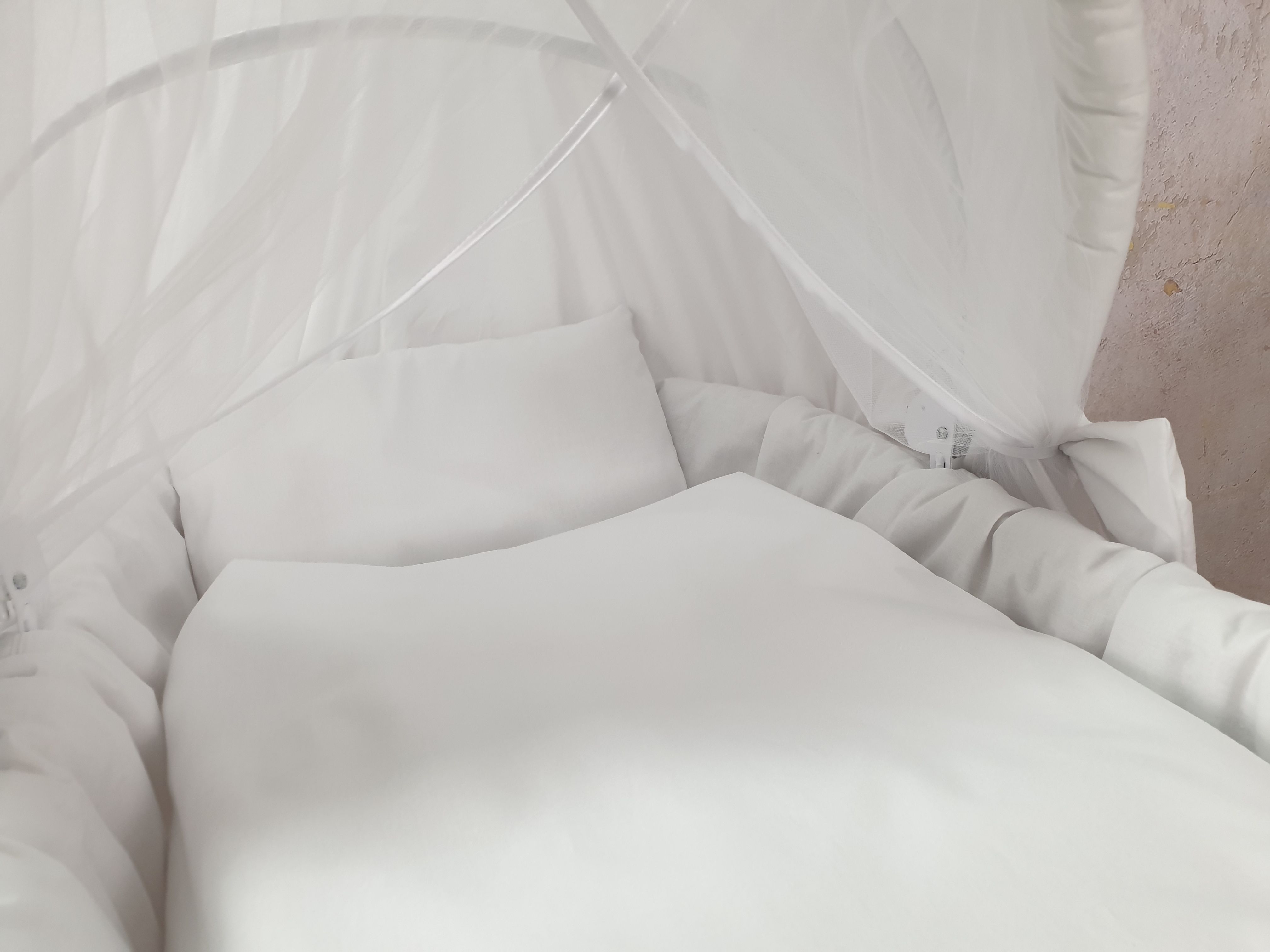 Das Set beinhaltet nicht nur den Stubenwagen, sondern auch ein komplettes Bettwäscheset aus 100% Baumwolle, bestehend aus Einlage, Kissen, Decke, Spannbettlaken und Haube mit Moskitonetz. Alle Materialien sind OEKO-TEX zertifiziert und allergiefrei.