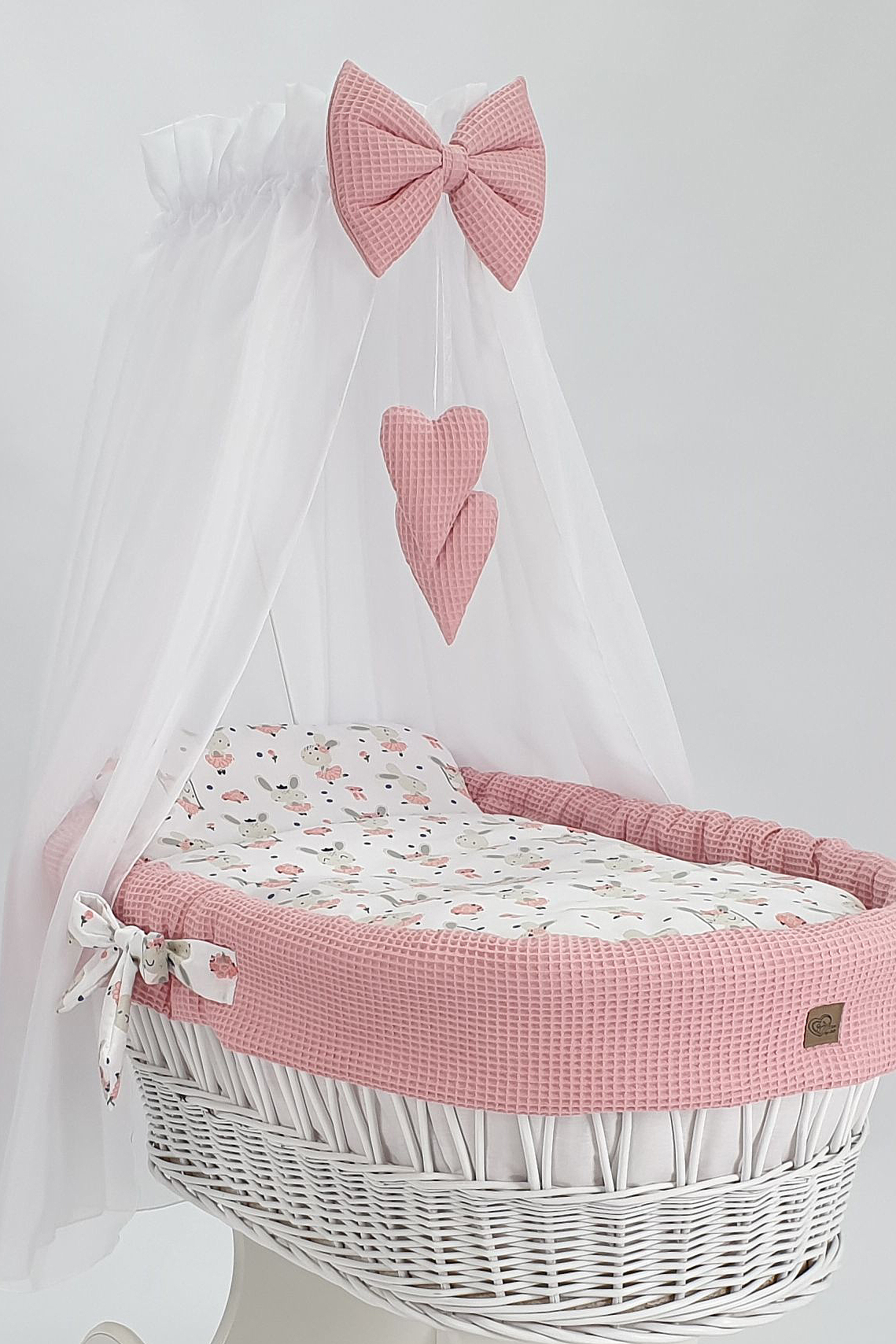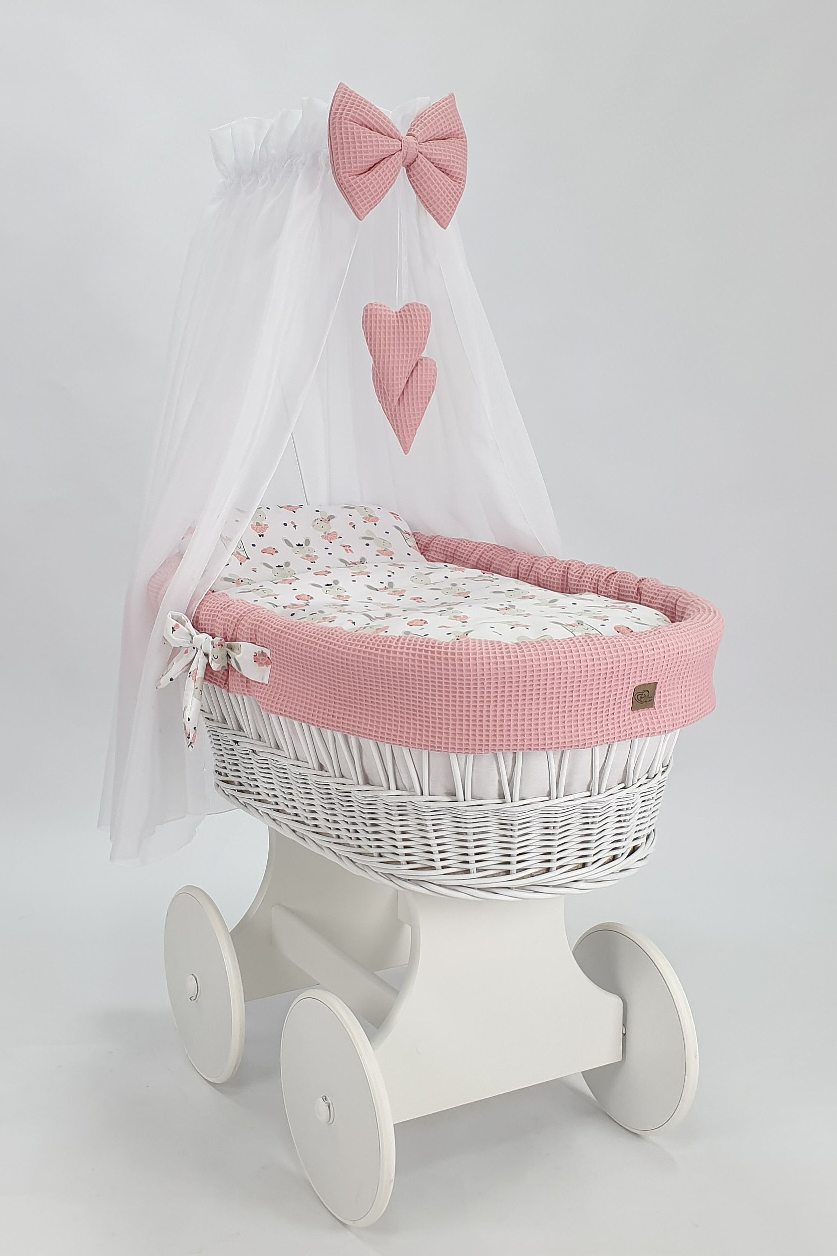 Das maximale Gewicht des Kindes beträgt 9kg, und mit dem 5-teiligen Bettwäsche-Set in Rosa sind Sie bestens ausgestattet. Enthalten sind ein Korbbezug mit Füllung, eine Bettwäsche 2in1 (Kissen 30x40cm und Decke 70x80cm zusammengenäht), sowie eine Schaumstoffmatratze 70x38x4cm und ein passendes Spannbetttuch.