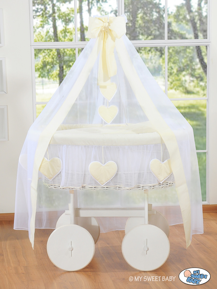 Weidenkorb für Babys. Romantische Bordüre aus bunter Baumwolle und weißem Tüll mit dekorativen Herzen rundherum.