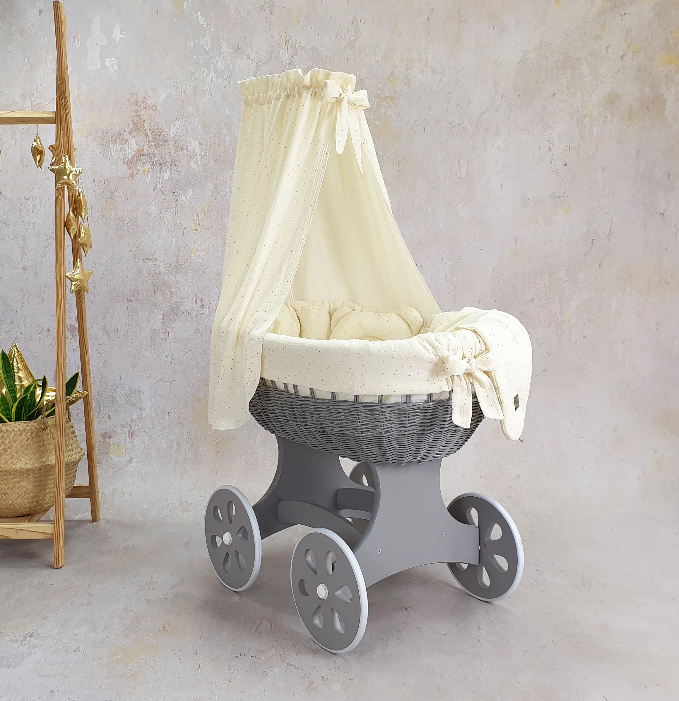 Stubenwagen aus Holz grau Weide Ecru Bezug Musselin GoldStubenwagen aus graues Holz und Weide mit Himmel und RädernStubenwagen mit Himmel - natur mit Ecru Musselin Gold BettsetStubenwagen in Natur mit Rädern Komplett inkl. Bett Set MusselinMusselin Bettwäsche für Stubenwagen aus natur WeideGraues Stubenwagen aus Holz mit Bremse Rädern