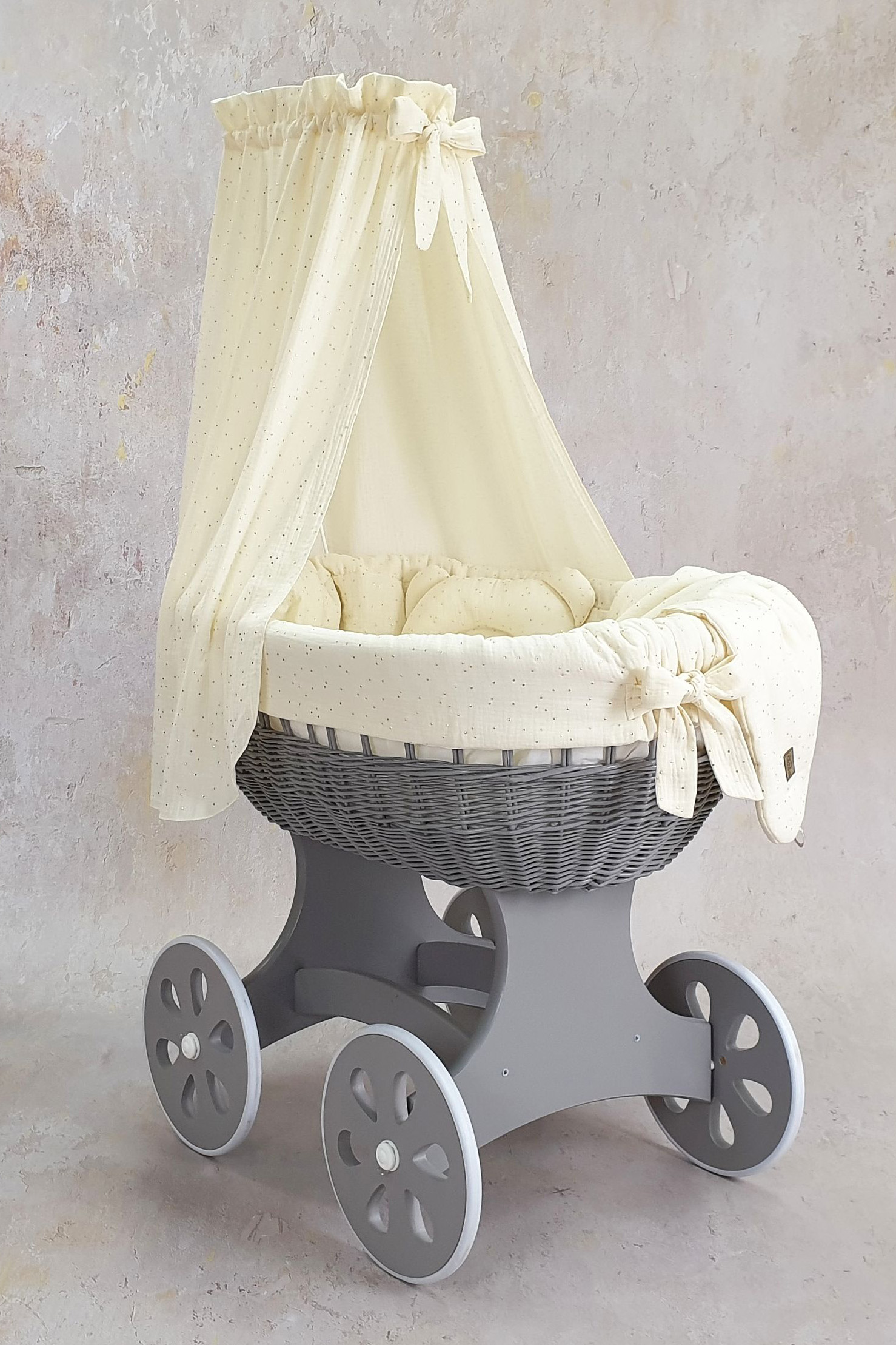Stubenwagen aus Holz grau Weide Ecru Bezug Musselin Gold