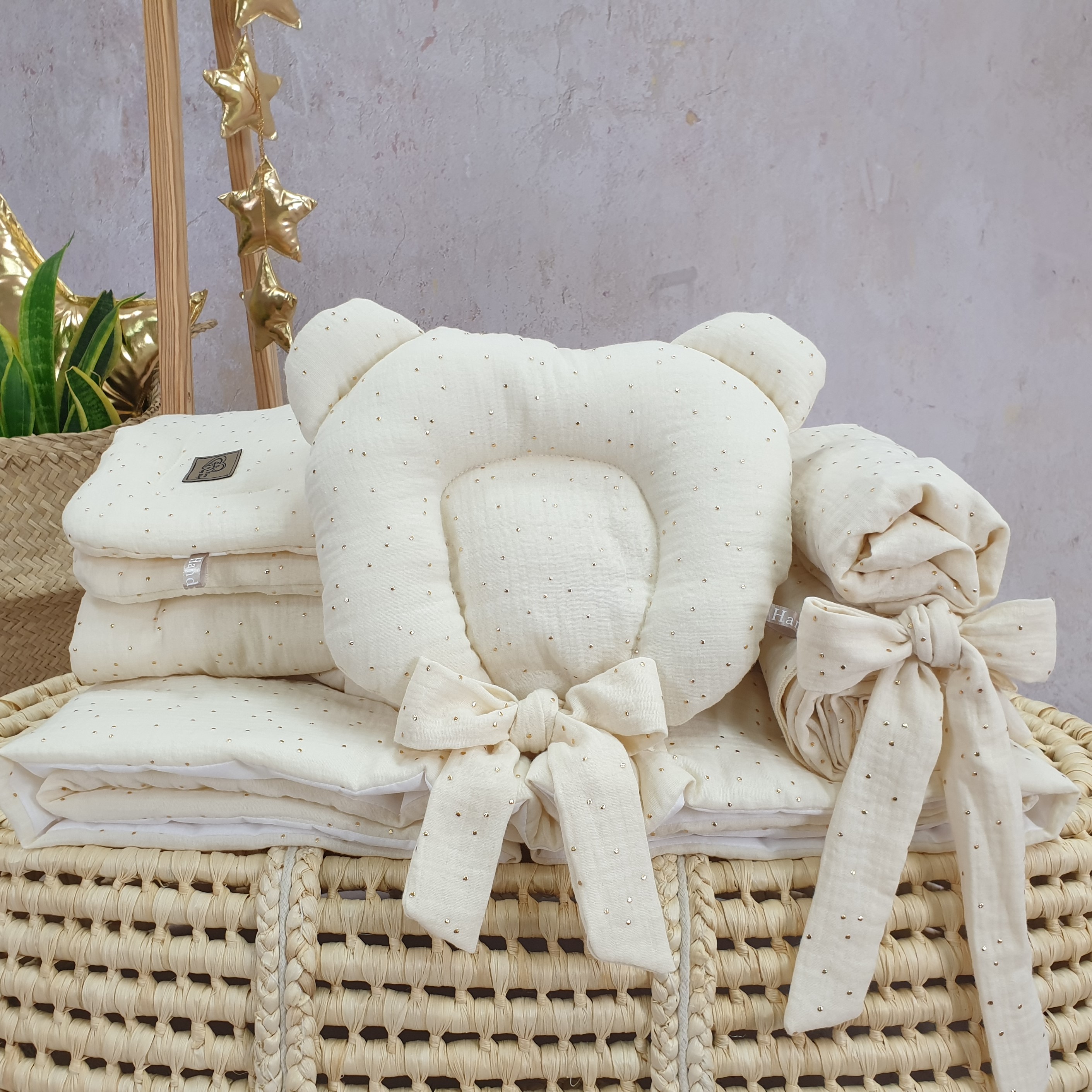 Die Bettwäsche besteht aus luxuriösem Musselin GOLD, verziert mit goldenen Punkten, und umfasst ein 5-teiliges Set:
