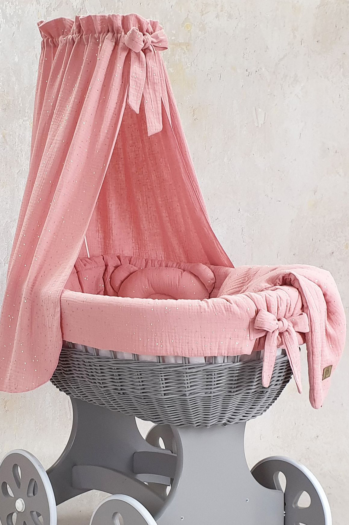 Die Bettwäsche besteht aus luxuriösem Musselin GOLD, verziert mit goldenen Punkten, und umfasst ein 5-teiliges Set: