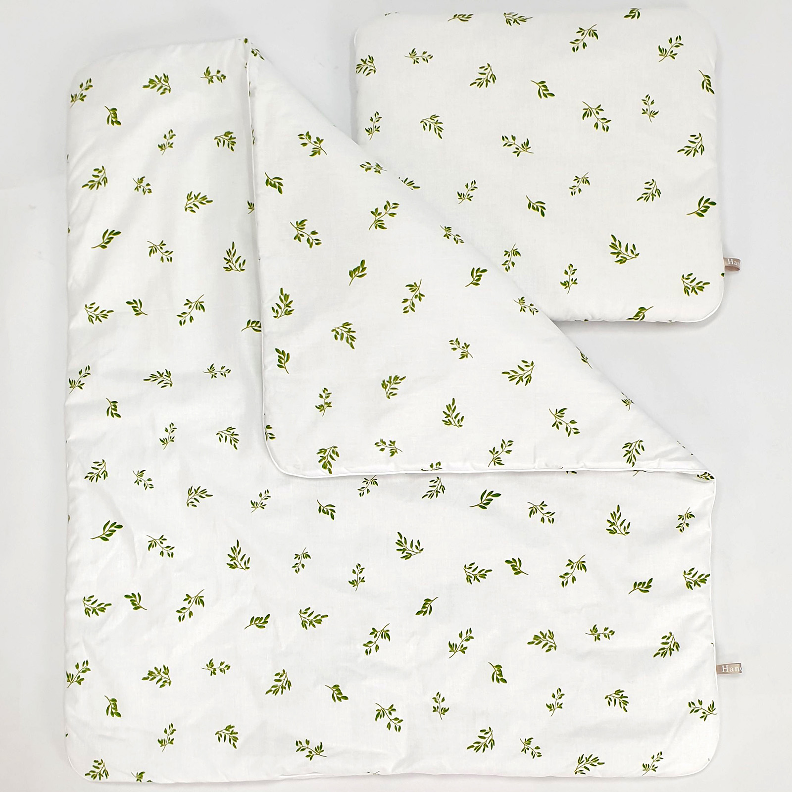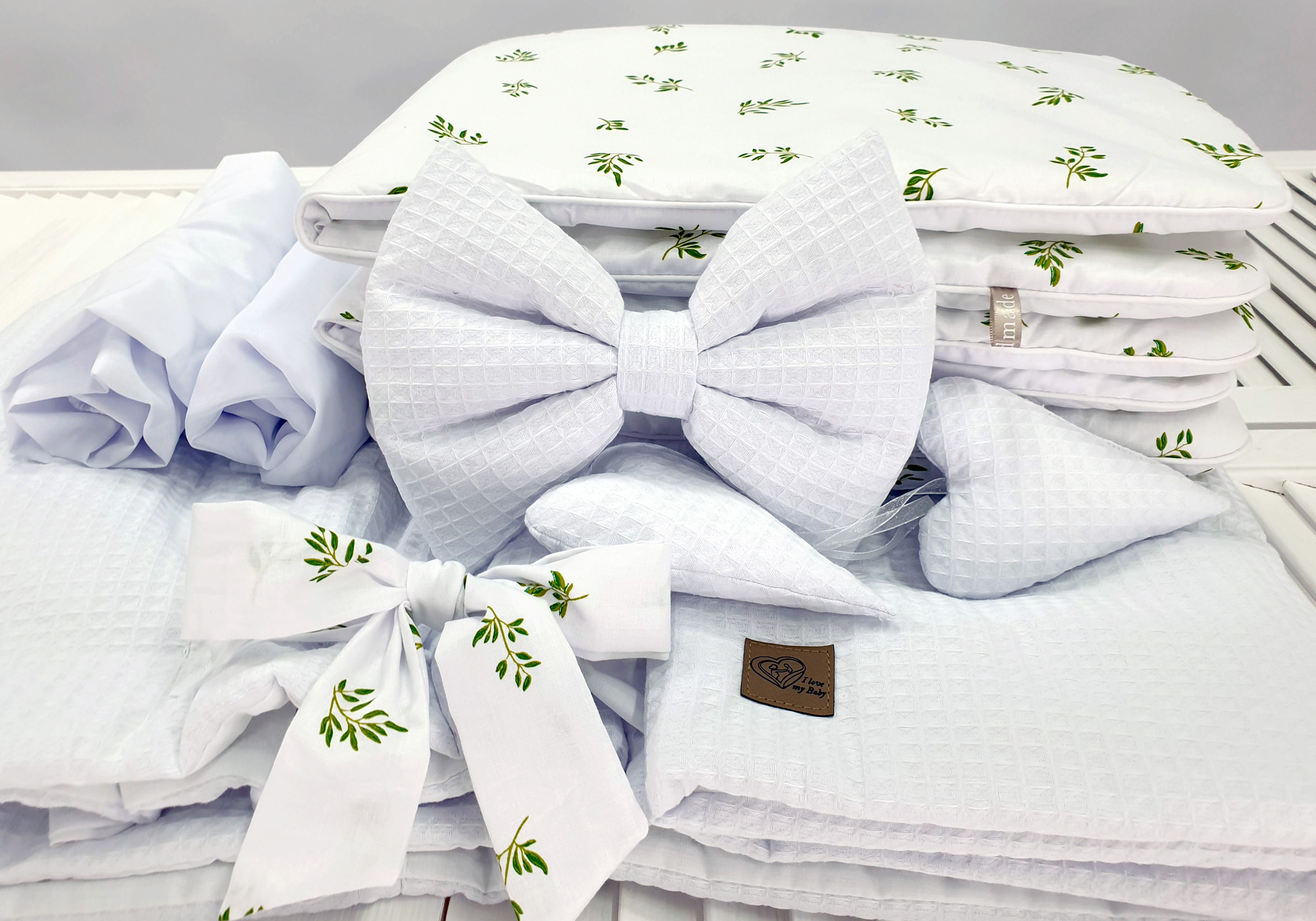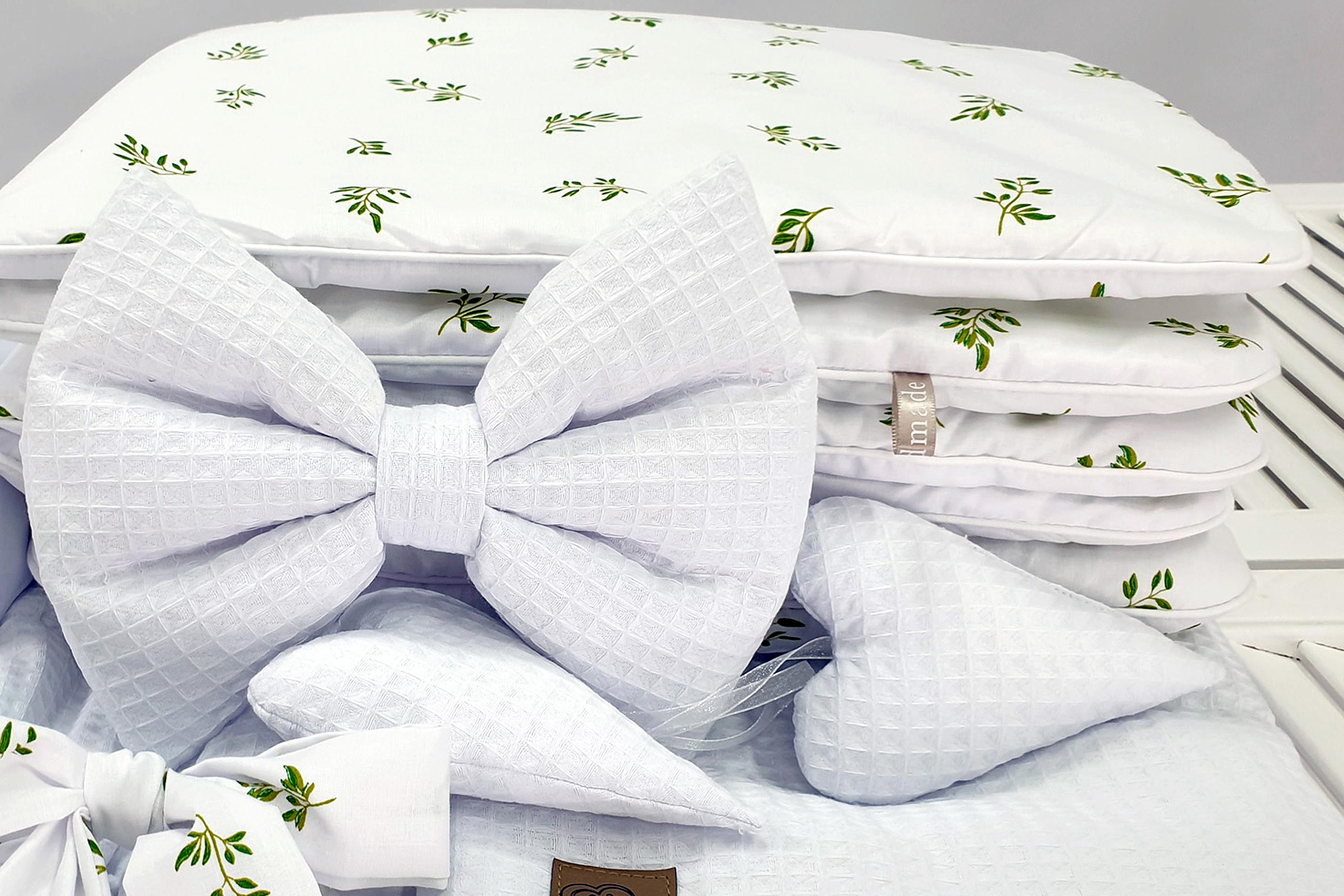 Die Bestandteile des 5-teiligen Bettwäsche-Sets (Waffelstruktur) in Weiß (grüne Blätter):