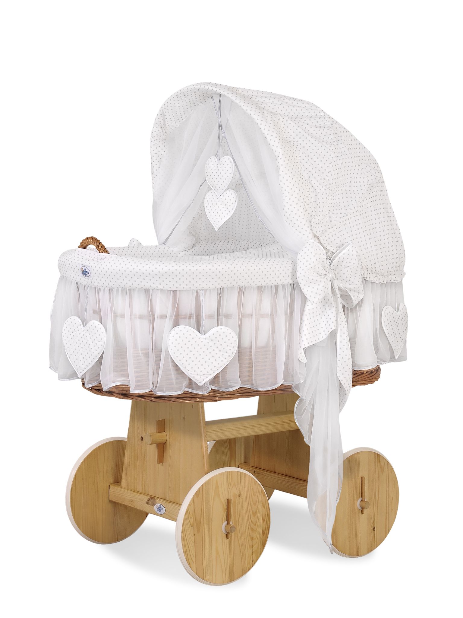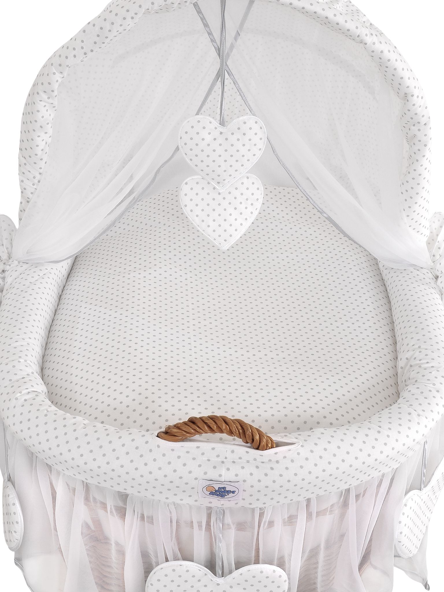 Stubenwagen mit Haube- Amelie graue Tupfen auf weiß Eine ausgezeichnete Lösung für kleine Wohnungen oder Haus. Leise Räder ermöglichen eine einfache Einstellung des Korbs. Dank dessen ist das Kind immer bei dir.