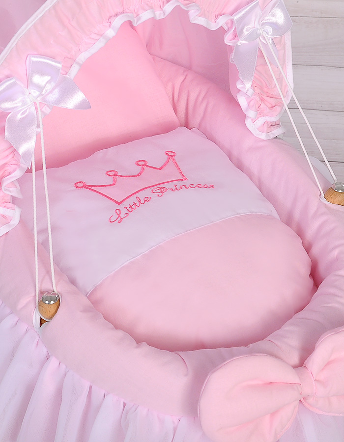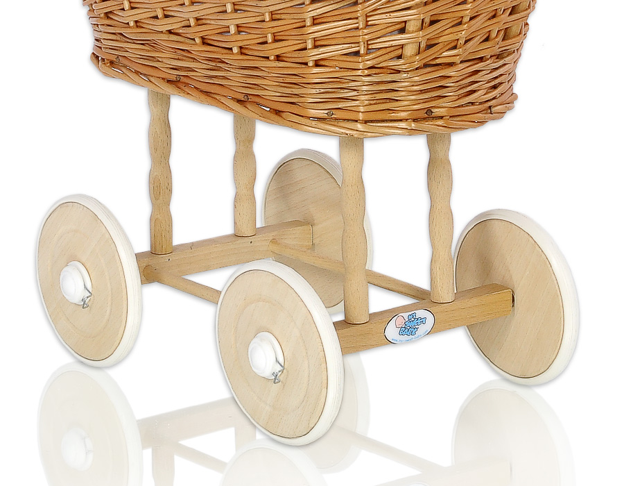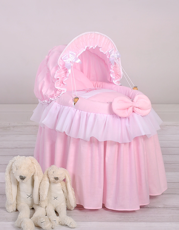 Sowohl der Korb aus Weide, als auch das Holzuntergestell entstehen in Handarbeit. Bezug aus 100% Baumwolle mit decorativen Rüschen.
