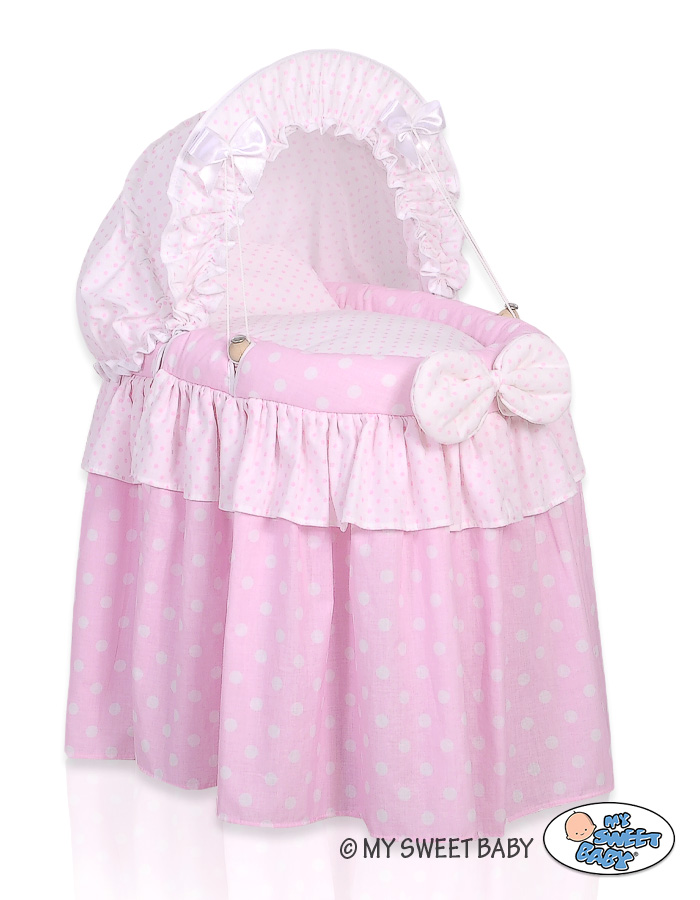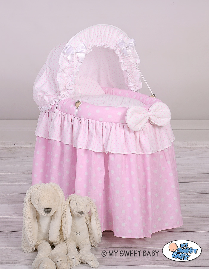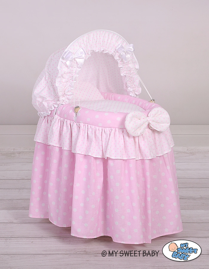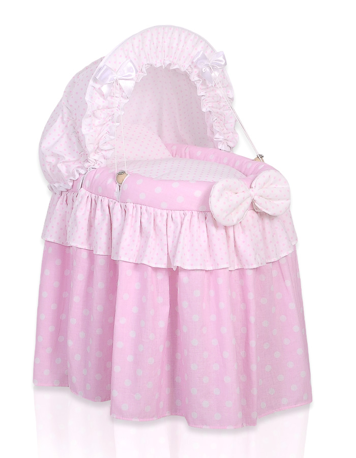 Sowohl der Korb aus Weide, als auch das Holzuntergestell entstehen in Handarbeit. Bezug aus 100% Baumwolle mit decorativen Rüschen.