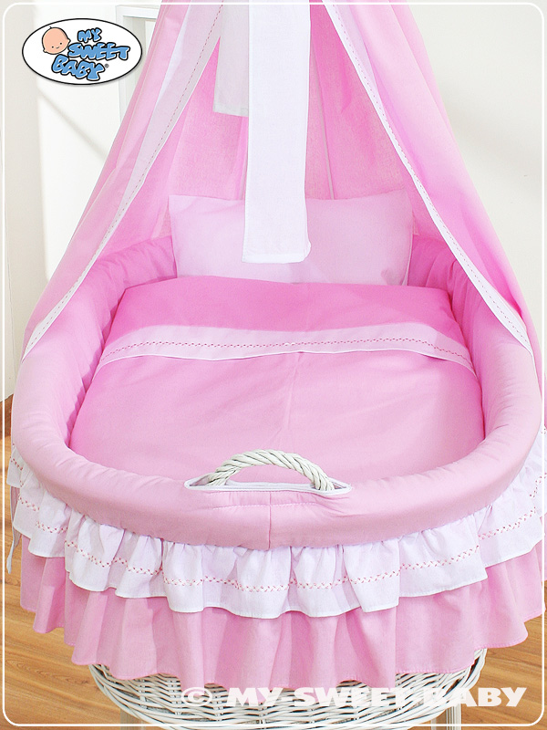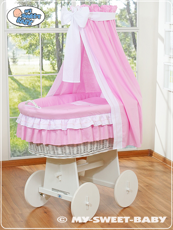 Ein wunderschöner handgemachter Stubenwagen, der ein gemütliches, Nest bildet. Weiße Farbe von Korb und Holz.
