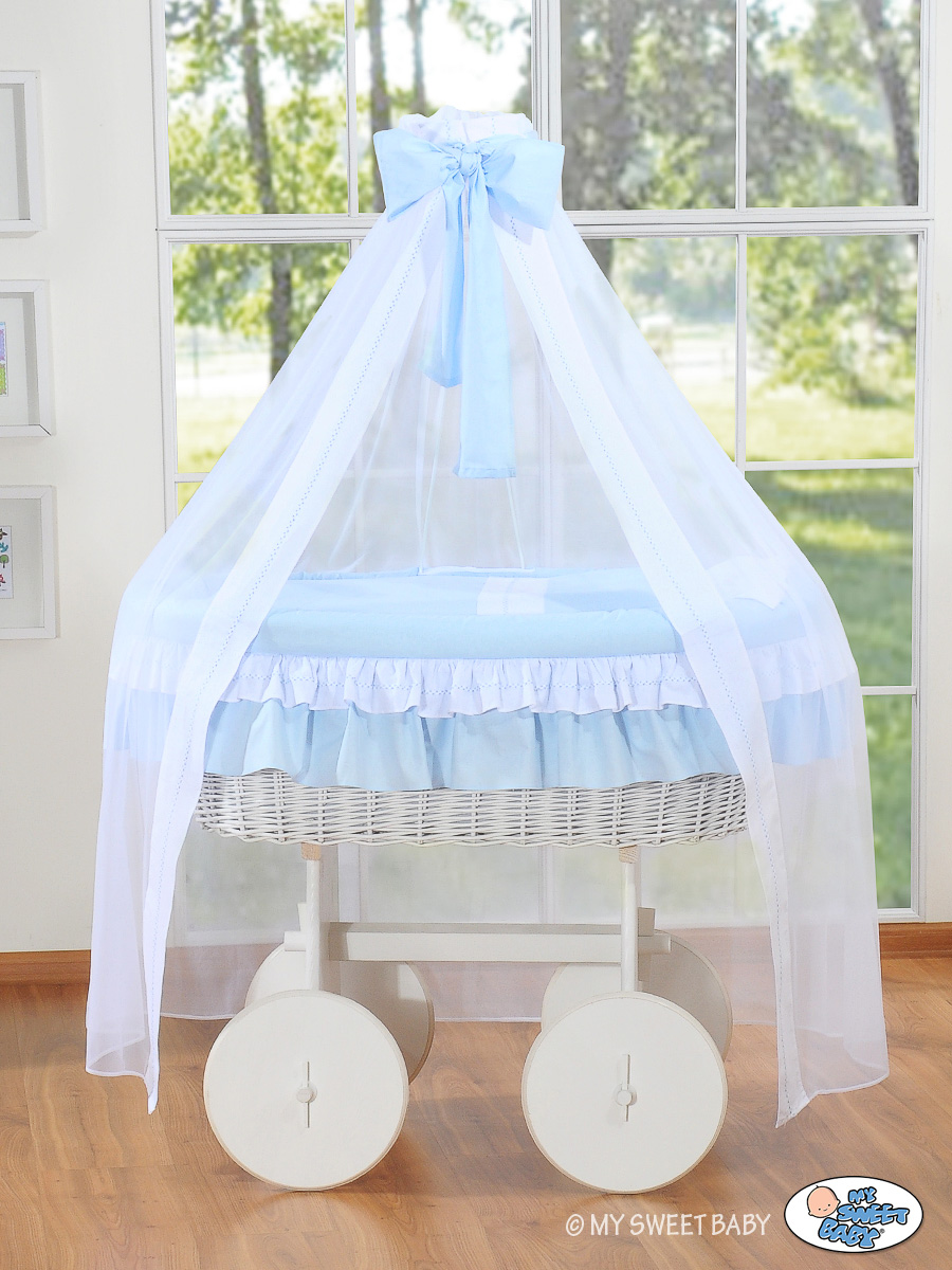 Weidenkorb für Babys. Romantische Bordüre aus bunter Baumwolle und weißem Tüll mit dekorativen Stickerei rundherum.