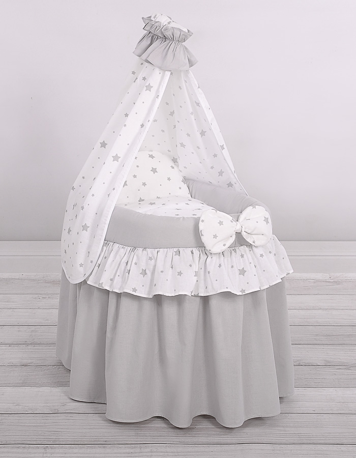 Sowohl der Korb aus Weide, als auch das Holzuntergestell entstehen in Handarbeit. Bezug aus 100% Baumwolle mit decorativen Rüschen.