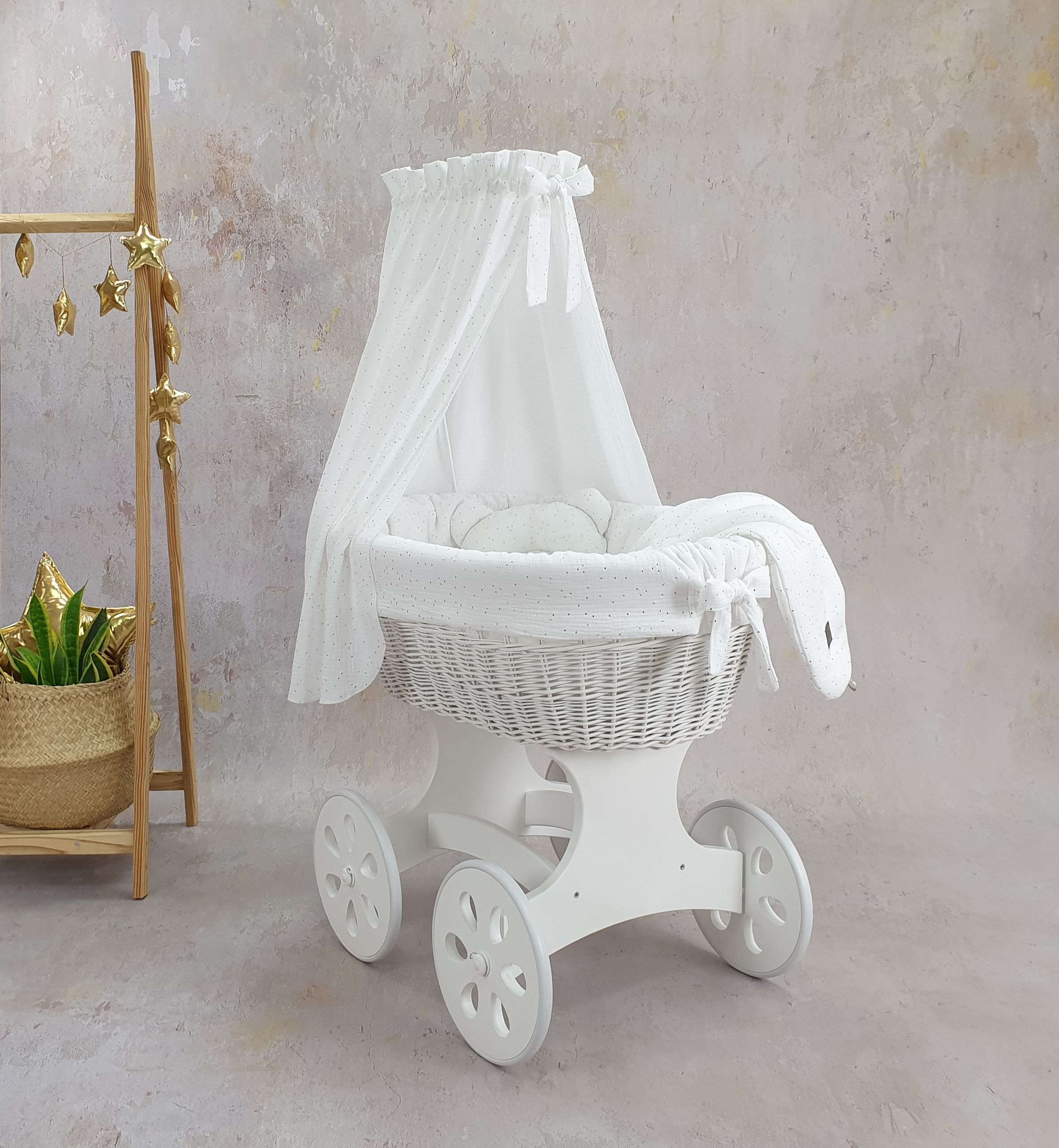 Das solide Holzgestell ist aus hochwertigem Buchenholz gefertigt. Die drehbaren Holzräder mit zwei Bremsen gewährleisten die Sicherheit Ihres Kindes und ermöglichen gleichzeitig eine einfache Handhabung des Wagens. Jeder unserer Stubenwagen wird von Hand aus natürlicher, hochwertiger polnischer Weide geflochten und mit einer sicheren, umweltfreundlichen Farbe bemalt, die alle erforderlichen Normen erfüllt.
