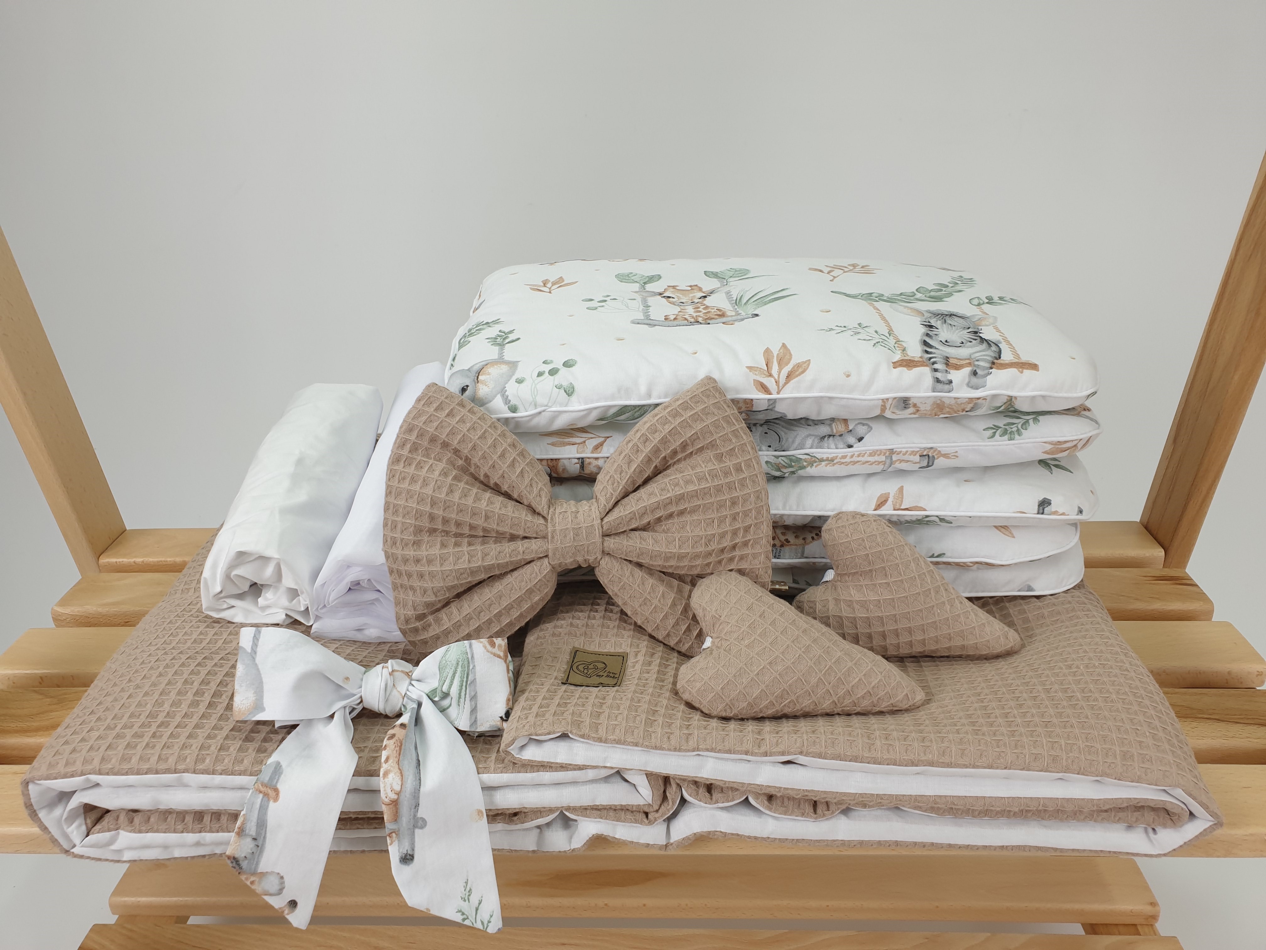 Das 5-teilige Bettwäsche-Set in Beige enthält alles, was du brauchst: Korbbezug mit Füllung, Bettwäsche 2in1 (Kissen 30x40 cm und Decke 70x80 cm mit Füllung zusammengenäht), 1x Schaumstoff Matratze 70x38x4cm und ein Spannbetttuch.