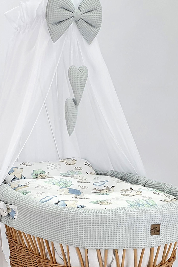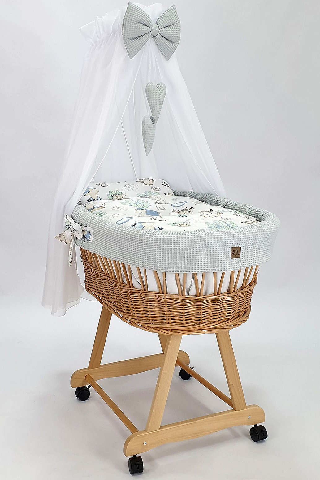 Unser Stubenwagen mit Himmel ist mehr als nur ein Bett – er ist ein Kunstwerk aus natürlichen Materialien und jahrelanger Handwerkskunst. Jeder Korb wird von erfahrenen Händen aus polnischem Weidenholz geflochten und mit umweltfreundlicher Farbe bemalt, die den höchsten Standards entspricht. Das solide Holzgestell mit seinen drehbaren Rollen sorgt nicht nur für die Sicherheit Ihres Babys, sondern auch für eine mühelose Bewegung des Stubenwagens – egal, ob auf Parkett oder Fliesen.