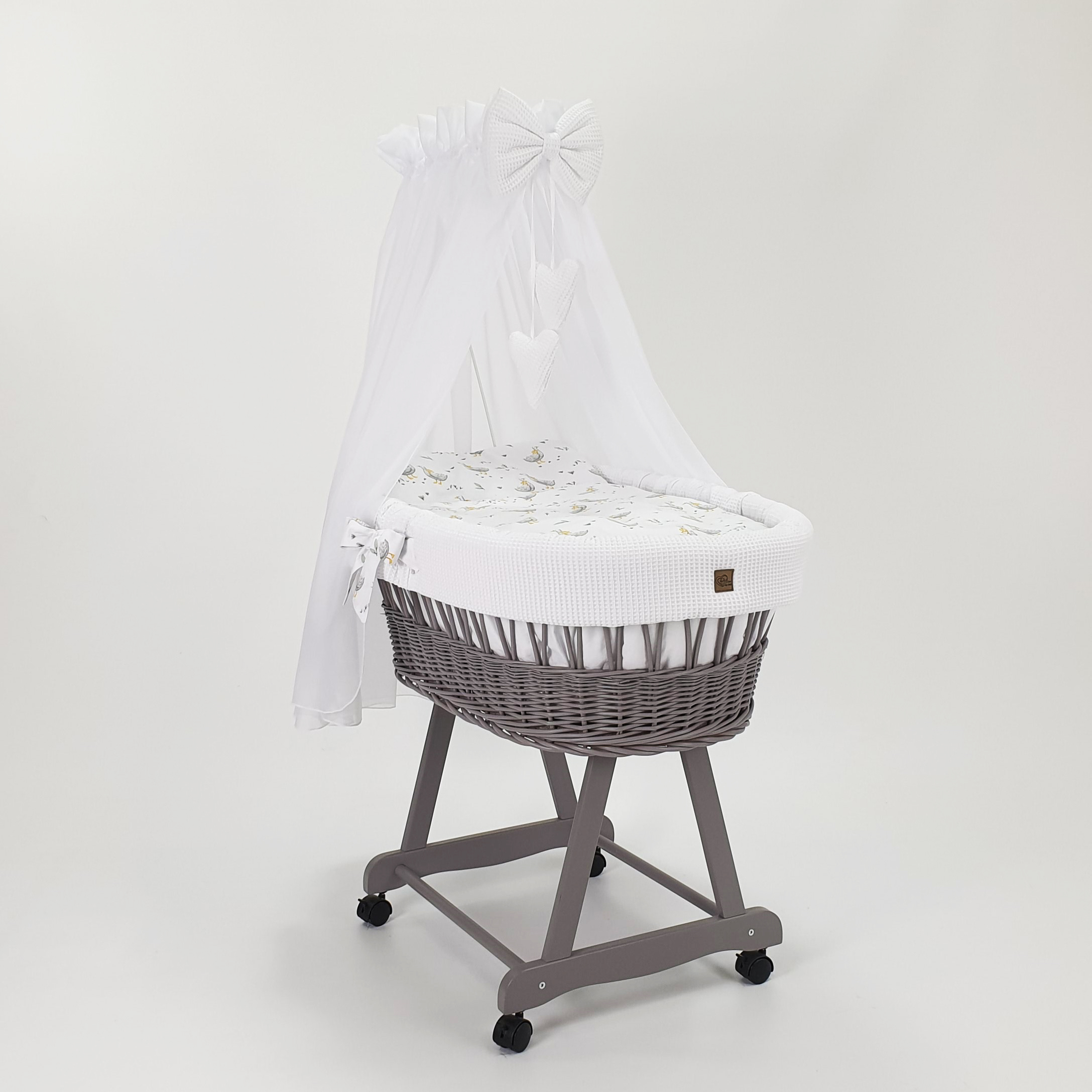Unser Stubenwagen mit Himmel ist mehr als nur ein Bett – er ist ein Kunstwerk aus natürlichen Materialien und jahrelanger Handwerkskunst. Jeder Korb wird von erfahrenen Händen aus polnischem Weidenholz geflochten und mit umweltfreundlicher Farbe bemalt, die den höchsten Standards entspricht. Das solide Holzgestell mit seinen drehbaren Rollen sorgt nicht nur für die Sicherheit Ihres Babys, sondern auch für eine mühelose Bewegung des Stubenwagens – egal, ob auf Parkett oder Fliesen.