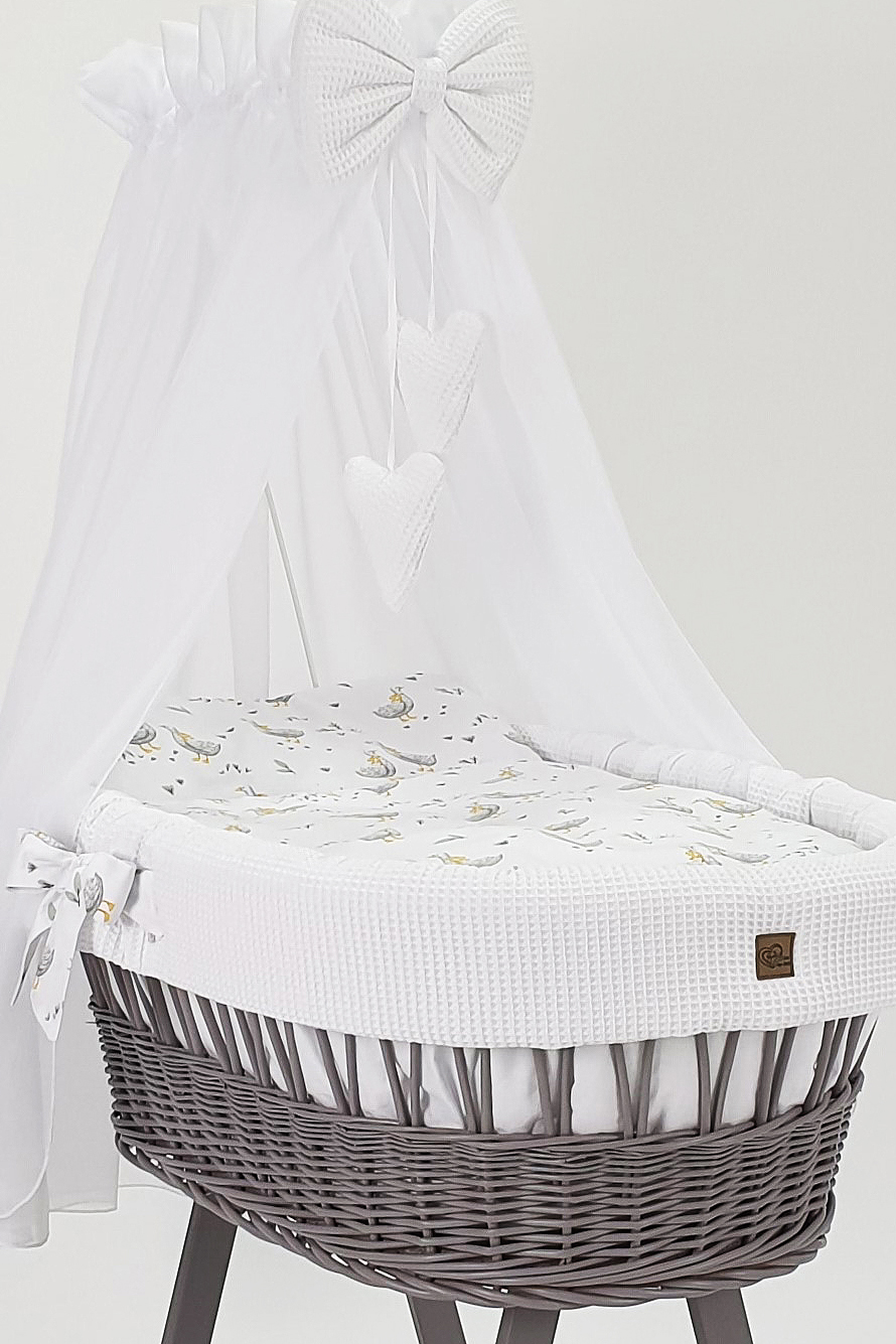 Das 7-teilige Bettwäsche-Set in Weiß umfasst einen Korbbezug mit Füllung, ein Kissen (35x40cm), eine Decke (70x80cm), passende Kissen- und Deckenbezüge, ein Spannbettlaken sowie einen Haubebezug mit Moskitonetz aus Tüll.