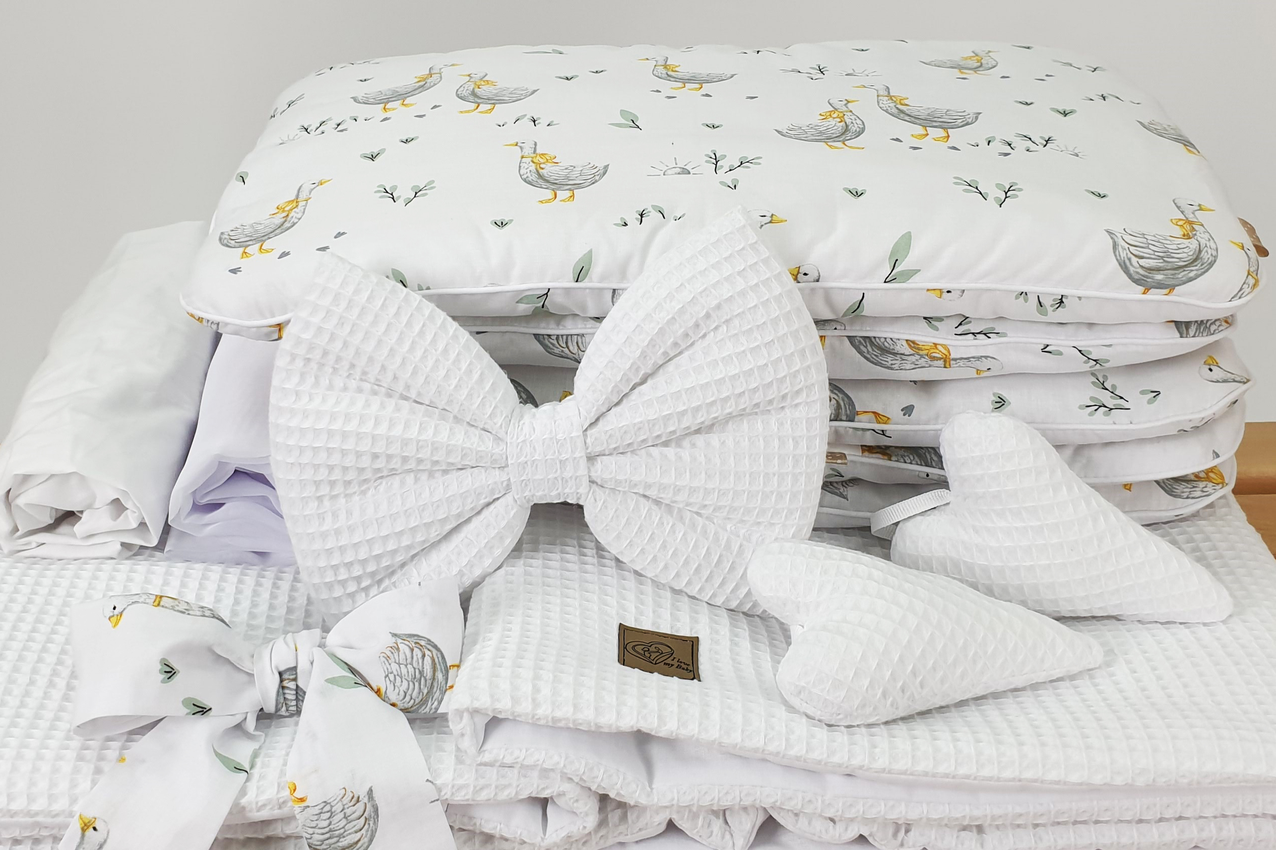 Die Bestandteile des 5-teiligen Bettwäsche-Sets (Waffelstruktur) in Weiß ( Gänse):