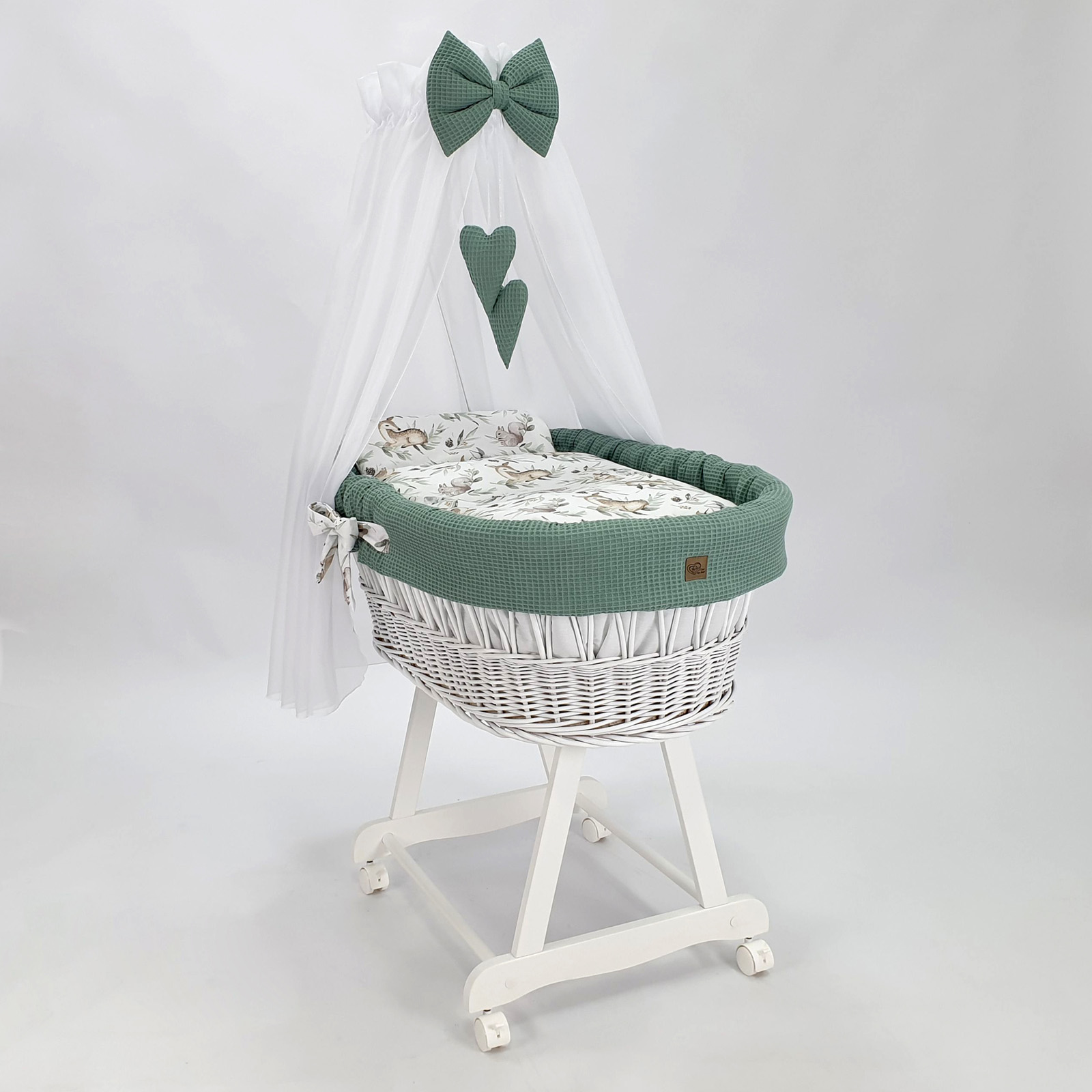 Der Satz umfasst einen Stubenwagen, bestehend aus einem Weidenkorb mit Himmel und einem Gestell mit Rollen, sowie einen 5-teiligen Bettwäsche-Set.