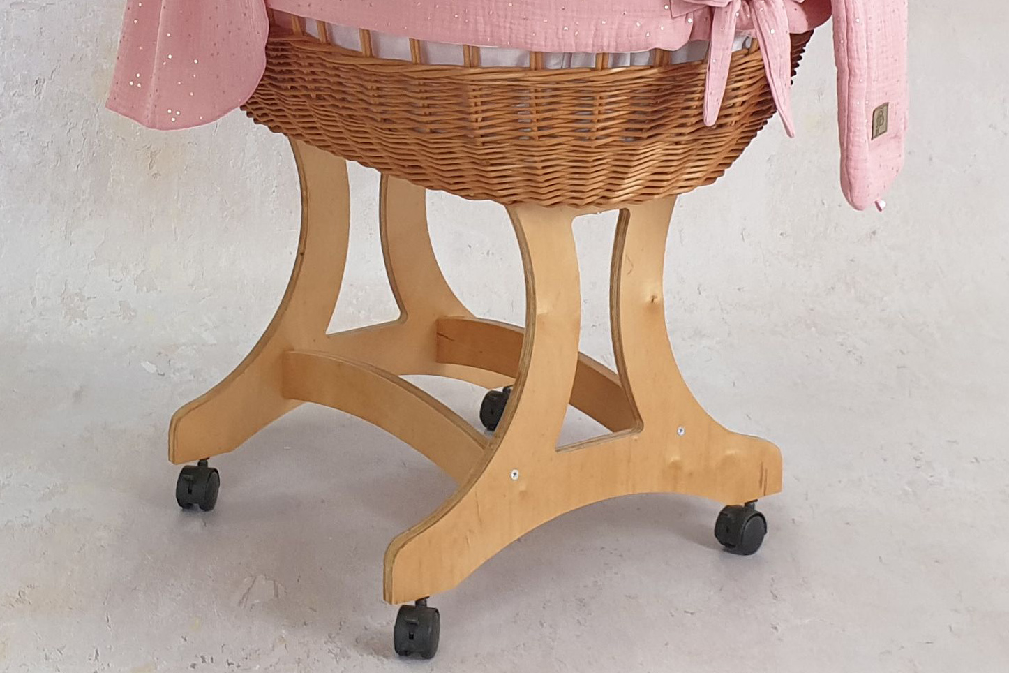 Das Gestell besteht aus langlebigem Sperrholz, während der handgefertigte Korb aus polnischer Weide gefertigt ist. Diese Kombination macht den Stubenwagen nicht nur robust, sondern auch zu einem ästhetischen Highlight. Die vier drehbaren Rollen mit Bremsen bieten maximale Sicherheit und ermöglichen eine mühelose Bewegung des Wagens. Egal, ob im Wohnzimmer, Schlafzimmer oder auf der Terrasse – der Stubenwagen lässt sich problemlos und geräuschlos bewegen und passt sich nahtlos jeder Umgebung an.