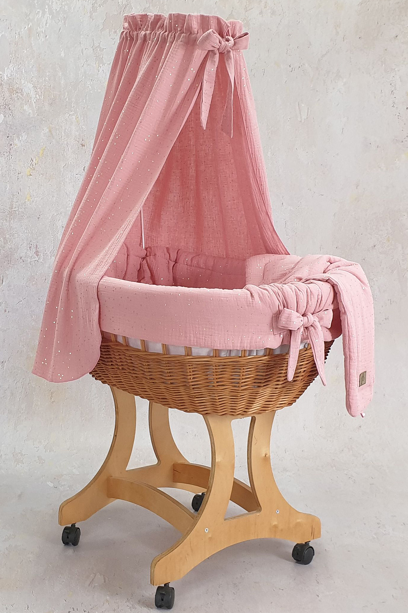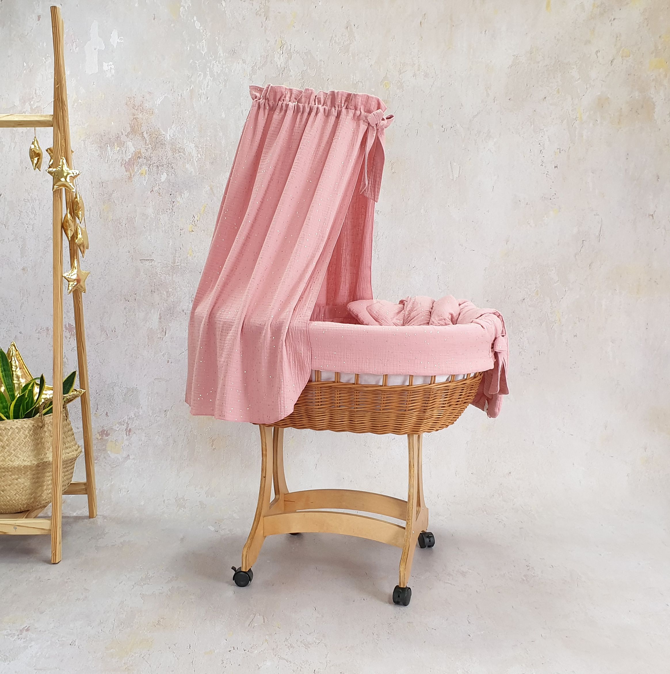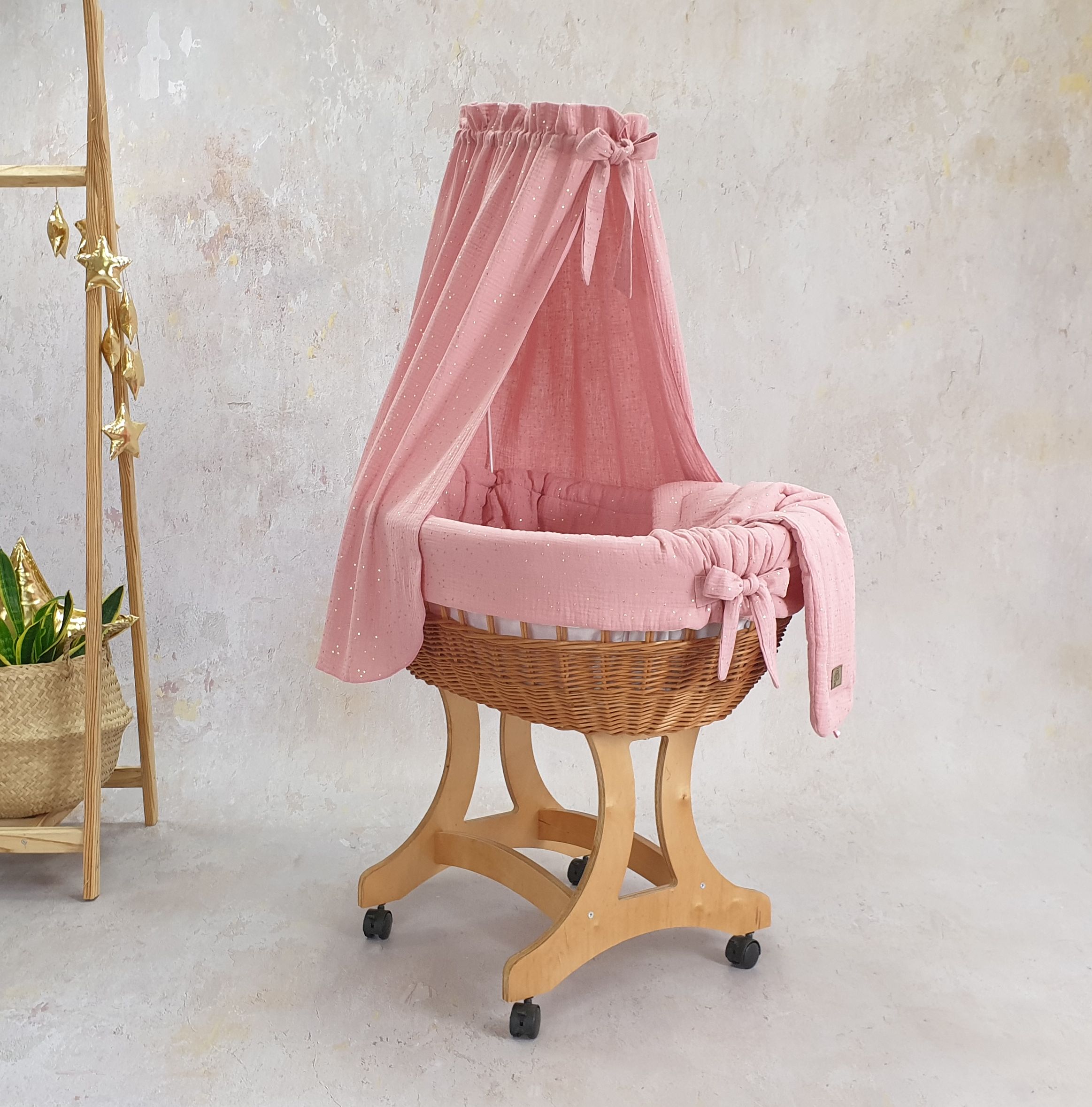 Unser Stubenwagen ist ein wahres Meisterwerk der Handwerkskunst. Die ovale Form des Korbs vermittelt Ihrem Baby ein Gefühl der Sicherheit und Geborgenheit, ähnlich wie in den Armen der Eltern. Stellen Sie sich vor, wie Ihr kleiner Schatz in sanftem Musselin-GOLD schläft, verziert mit zarten goldenen Punkten, die nicht nur optisch ansprechend sind, sondern auch ein weiches und angenehmes Hautgefühl bieten.