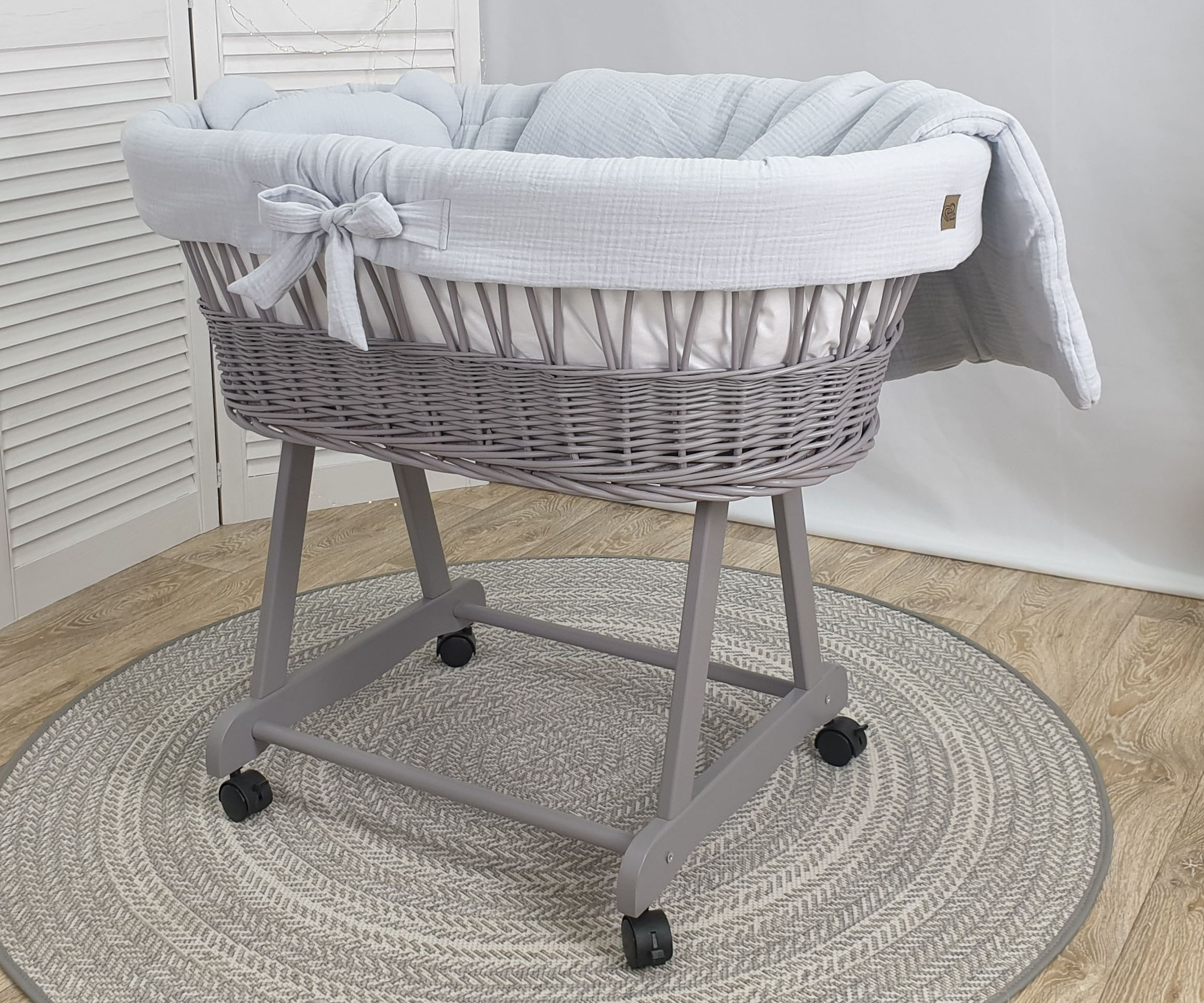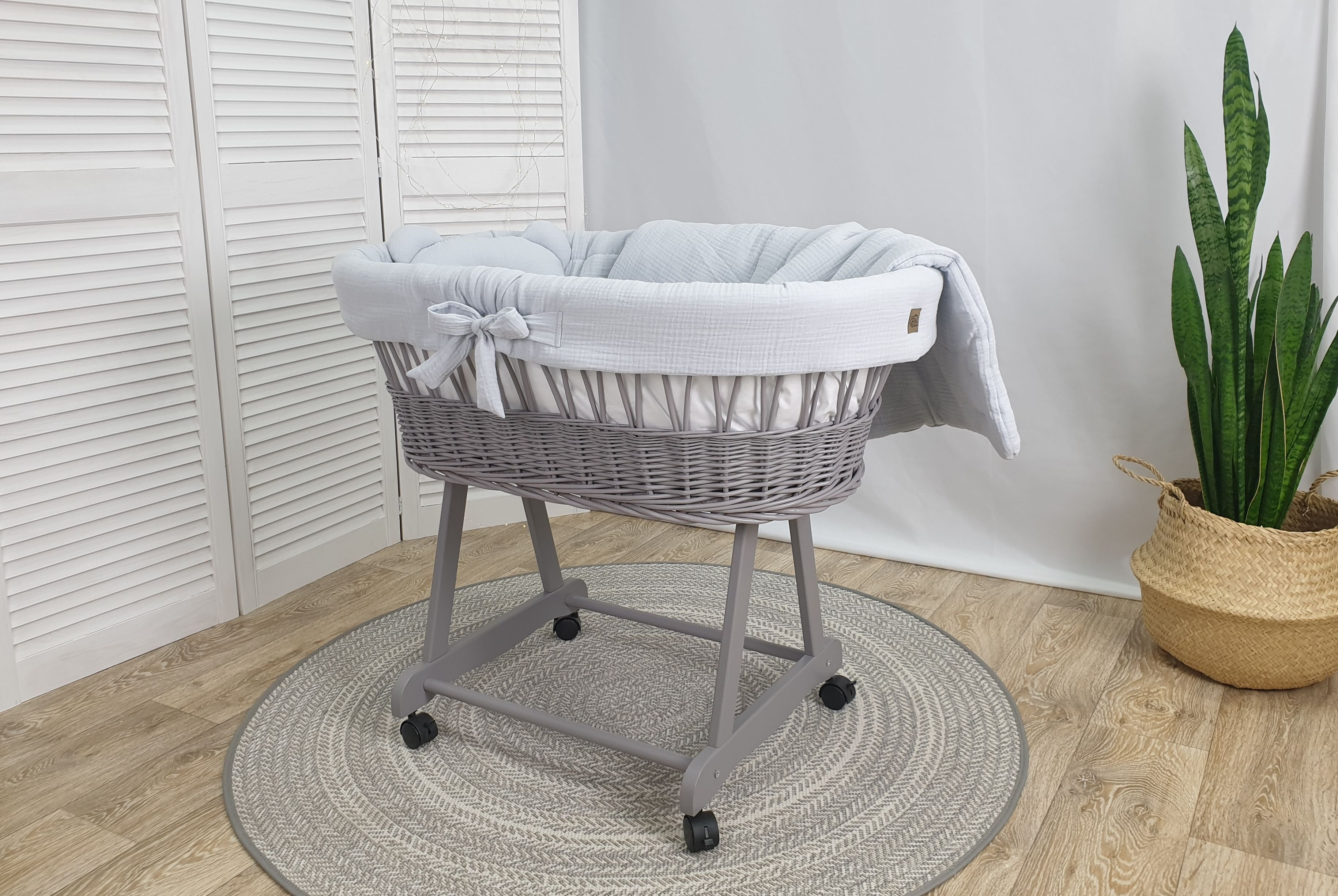 Stubenwagen Hellgrau Bezug ohne HimmelStubenwagen ohne Himmel aus grauer WeideGrau Stubenwagen mit Bettwäsche Hellgrau MusselinHellgrau Bettset in Musselin für Stubenwagen ohne Himmel
