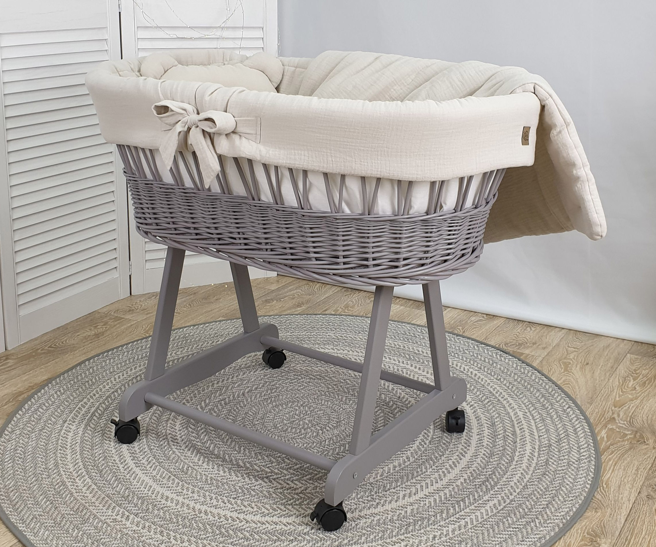 Grau Weide Stubenwagen mit Bettwäsche Khaki Musselin