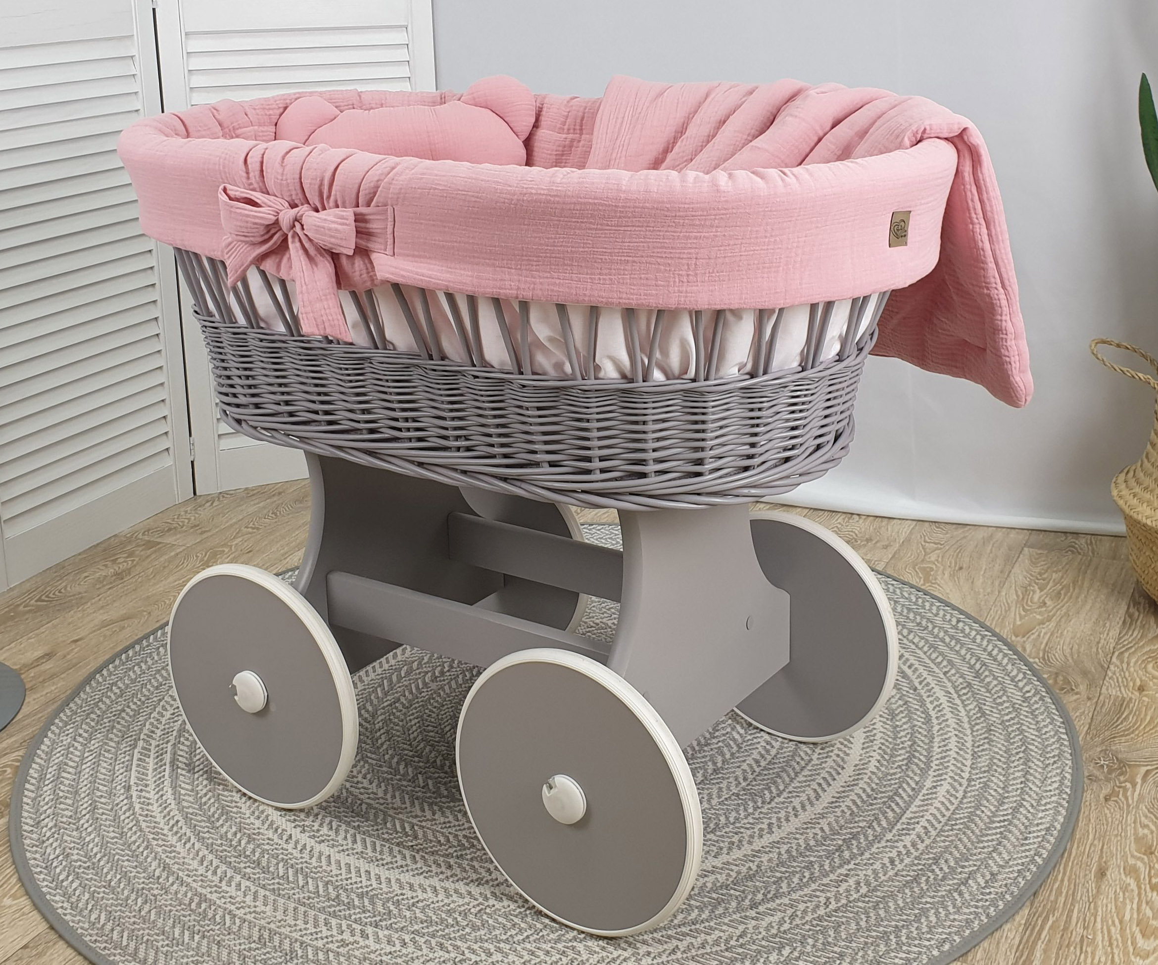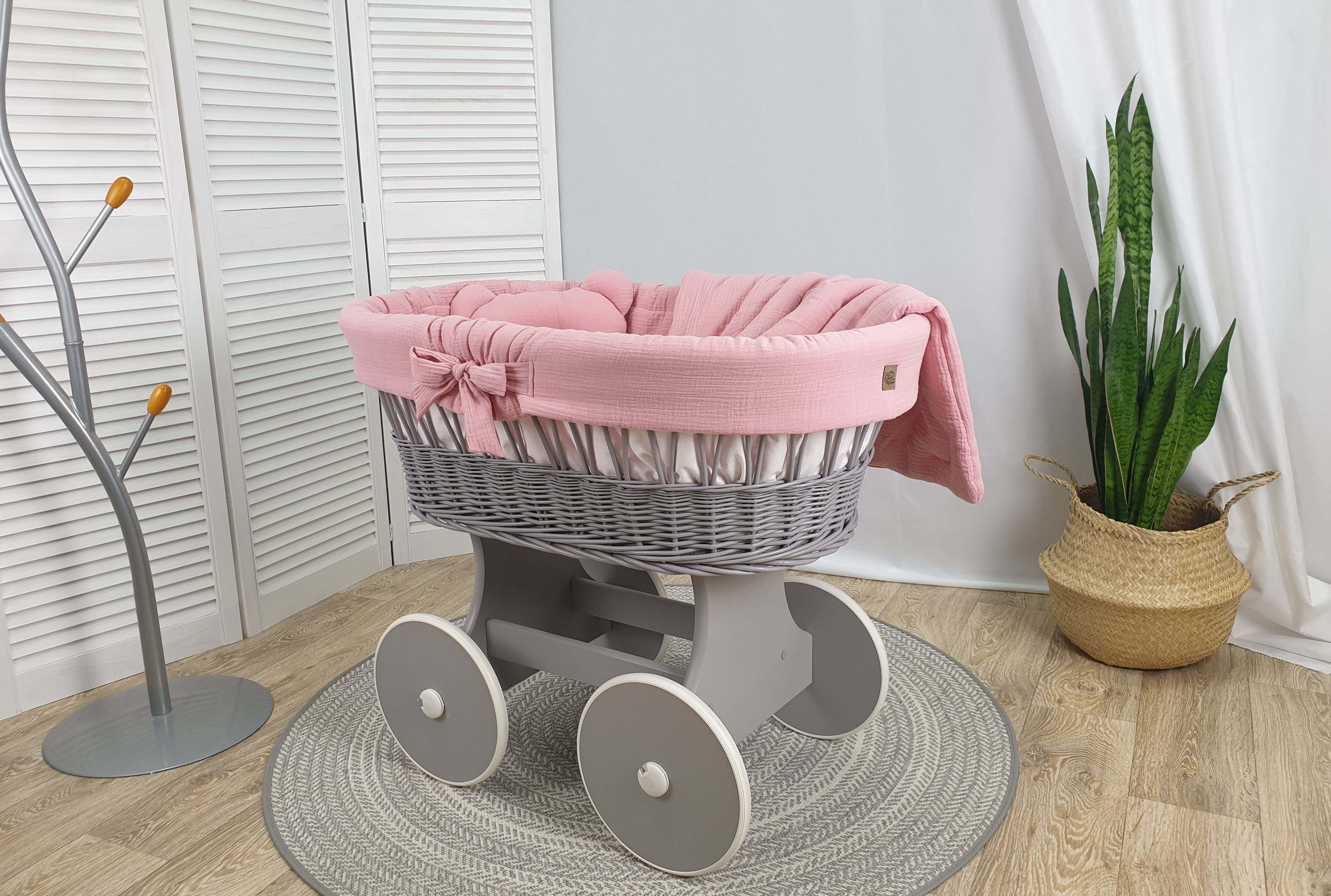 StubenwagenGraue Weide Große Räder Stubenwagen für MädchenPuderrosa Bezugset aus Musselin für Weidenkorb ohne HimmelBettset aus Musselin Rosa für Weidenkorb ohne Himmel