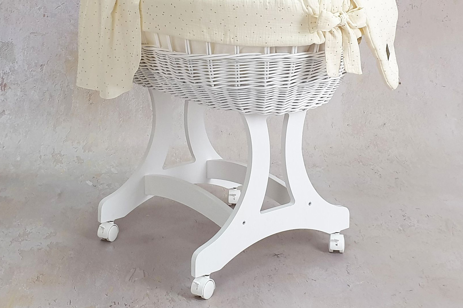 Das Gestell besteht aus langlebigem Sperrholz, während der handgefertigte Korb aus polnischer Weide gefertigt ist. Diese Kombination macht den Stubenwagen nicht nur robust, sondern auch zu einem ästhetischen Highlight. Die vier drehbaren Rollen mit Bremsen bieten maximale Sicherheit und ermöglichen eine mühelose Bewegung des Wagens. Egal, ob im Wohnzimmer, Schlafzimmer oder auf der Terrasse – der Stubenwagen lässt sich problemlos und geräuschlos bewegen und passt sich nahtlos jeder Umgebung an.